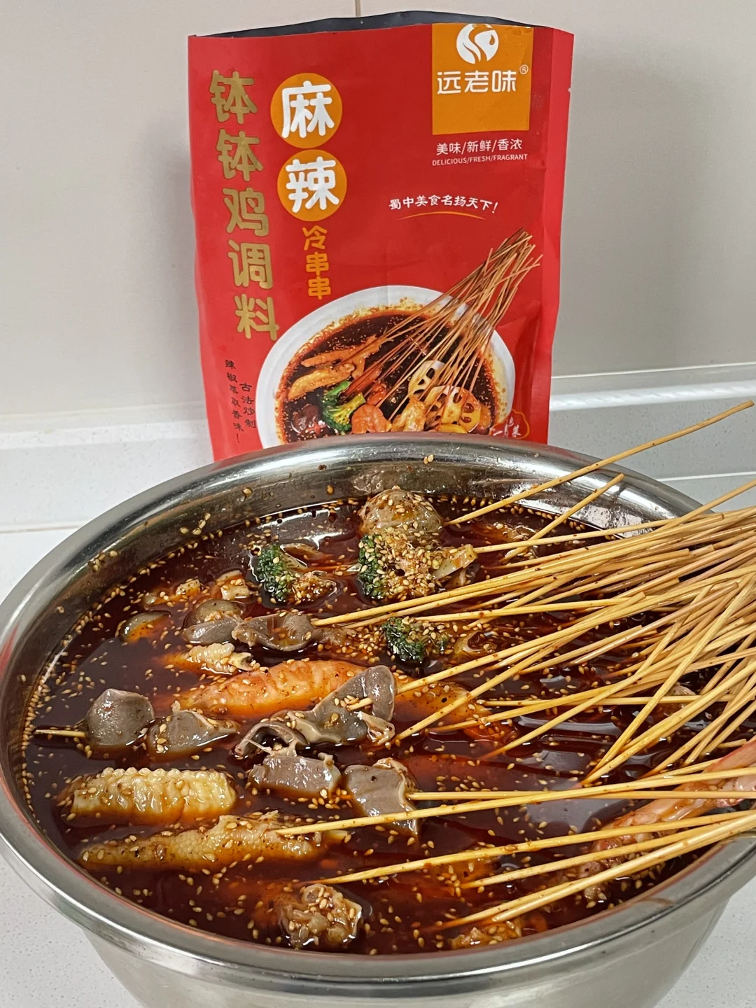 3⃣️钵钵鸡调料按说明配好。我今天依然用的是远老味钵钵鸡调料,因为这款钵钵鸡调料吃了真的不口渴,而且味道比较正。然后将串好串的所有菜放入钵钵鸡调料中浸泡半个小时。