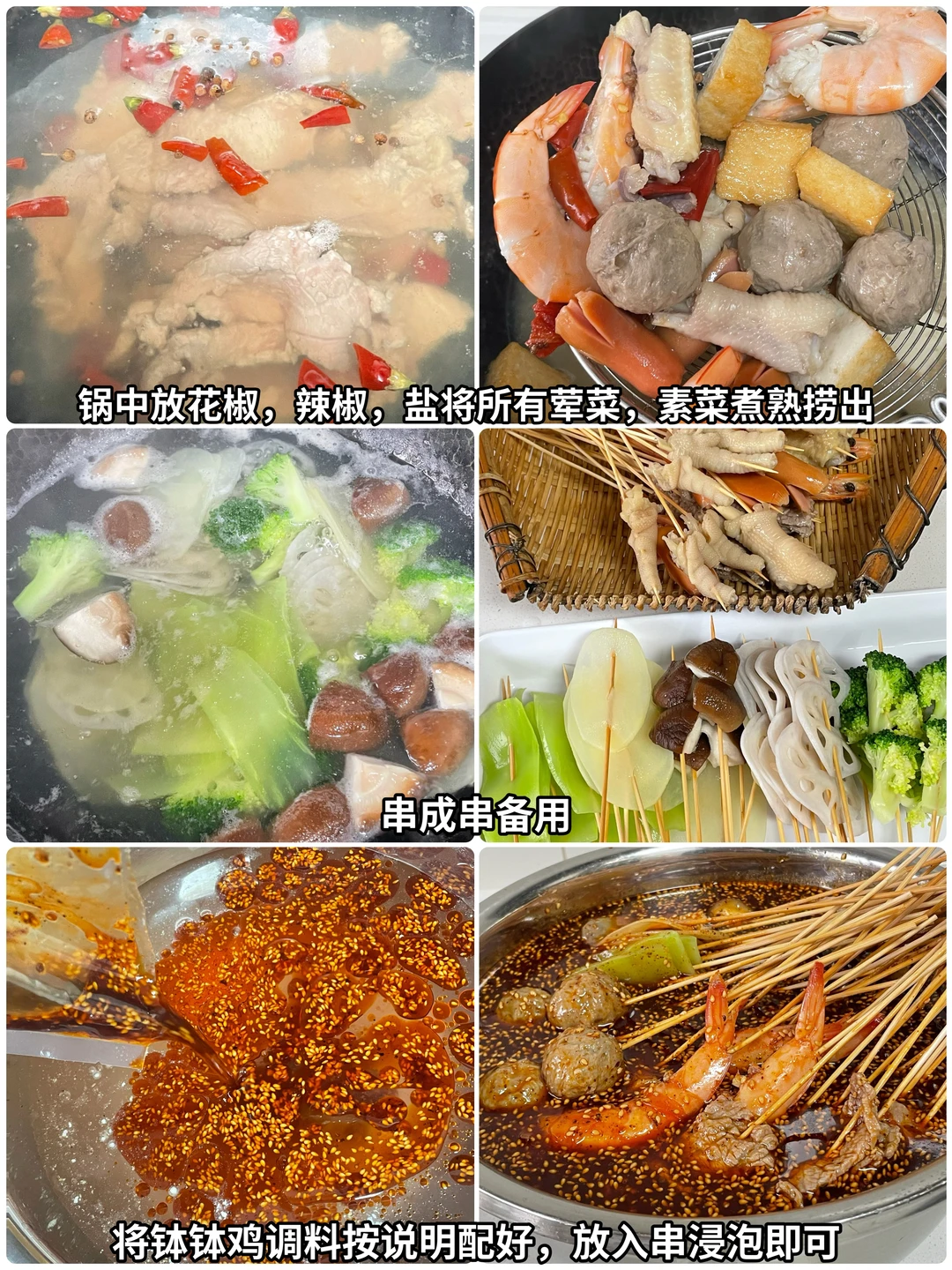 2⃣️锅中水开,放入辣椒、花椒、盐。水开煮菜。牛肉烫1分钟,鸡爪、鸡翅、牛肉丸煮8~10分钟。脆皮肠、鱼豆腐、虾煮5分钟。鸡胗三分钟。素菜:香菇5分钟,西兰花3分钟,藕片、土豆、莴笋1分钟,捞出。然后将所有的食材串成串。