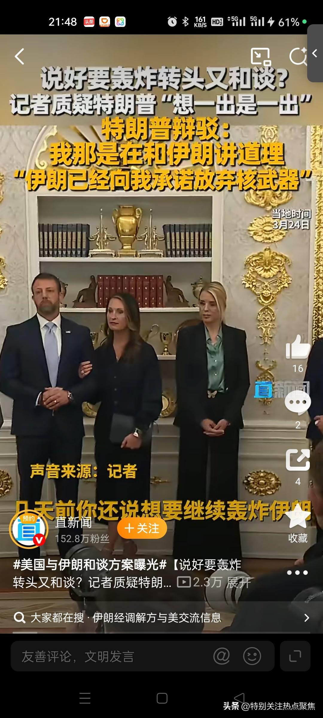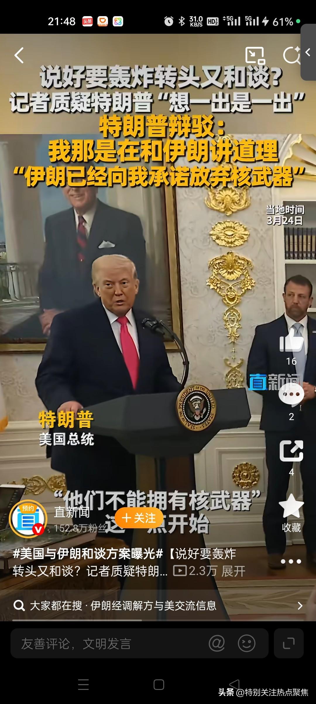 特朗普要求伊朗尽快在和平协议问题上“认真起来”,否则将面临“不堪设想”的后果且“没有回头路”。 当地时间 3 月 26 日,美国总统特朗普在其社交媒体平台“真实社交”上向伊朗发出严厉警告,要求德黑兰方面尽快在和平协议问题上“认真起来”,否则将面临“不堪设想”的后果且“没有回头路”。特朗普宣称,伊朗谈判代表态度“非常不同”,正在“请求”美国达成协议以结束已持续近四周的冲突。然而,美伊双方就谈判进展存在严重分歧:美方声称围绕和平方案的谈判正在进行,而伊朗方面坚决否认与华盛顿存在任何直接接触。伊朗外长阿拉格齐明确表示,伊方虽在审议美方提出的结束冲突方案,但无意与美国举行会谈,强调通过中间方传递信息并不等同于正式谈判。 关键事实梳理: 美方立场与威胁:特朗普形容当前局势紧迫,称若伊朗不尽快认真对待,将错过机会并付出惨重代价;他同时暗示美方拥有强大的军事部署作为后盾 。34 伊方回应与否认:伊朗官方反复澄清未与美国进行直接对话或谈判,指责美方散布“假新闻”旨在进行心理战、压低能源价格或为军事行动争取时间 。58 谈判状态矛盾:尽管特朗普声称双方进行了“富有成效”的对话甚至接近达成协议,但伊朗消息人士及官员明确指出,目前不存在此类沟通,且伊方将继续防御直至实现必要威慑 。28 潜在风险:鉴于双方说法截然相反且美军舰队已在该区域集结,局势仍存在因误判而升级的风险,伊朗方面警告若美方执意升级冲突,将予以坚决回击 。 特朗普炮轰伊朗 欧洲对特朗普 伊朗怒怼西方 美国施压伊朗