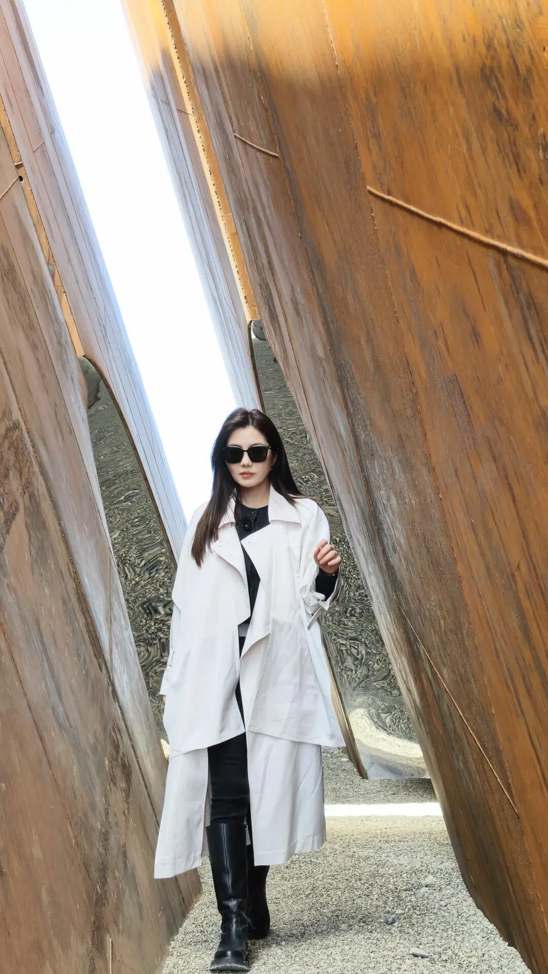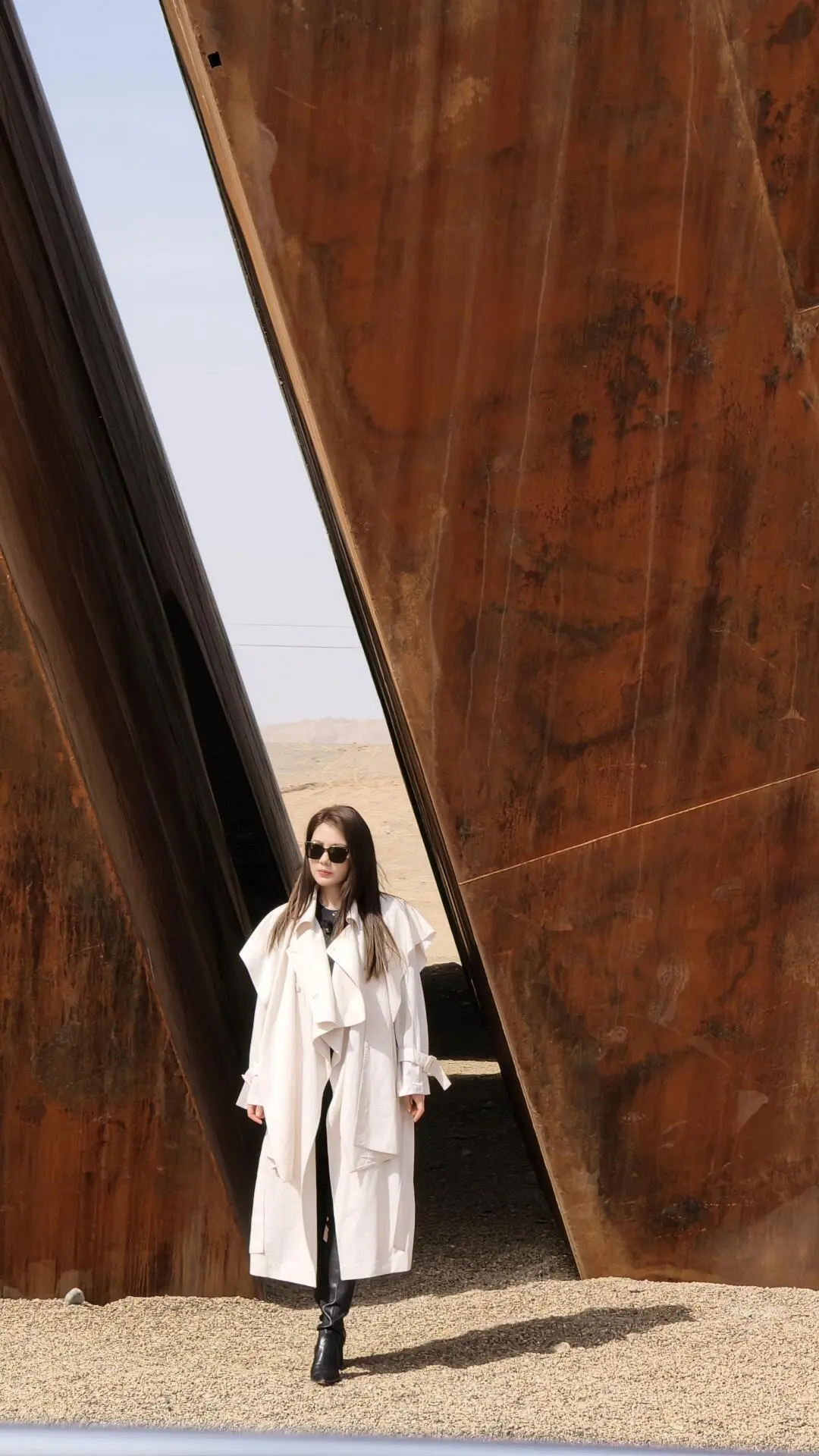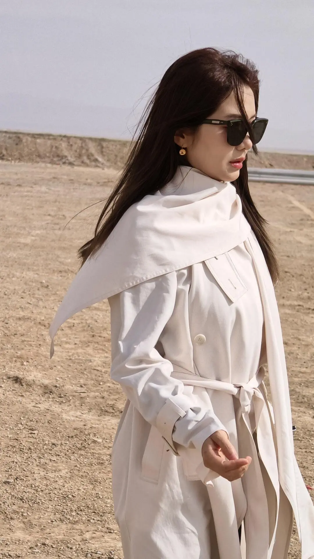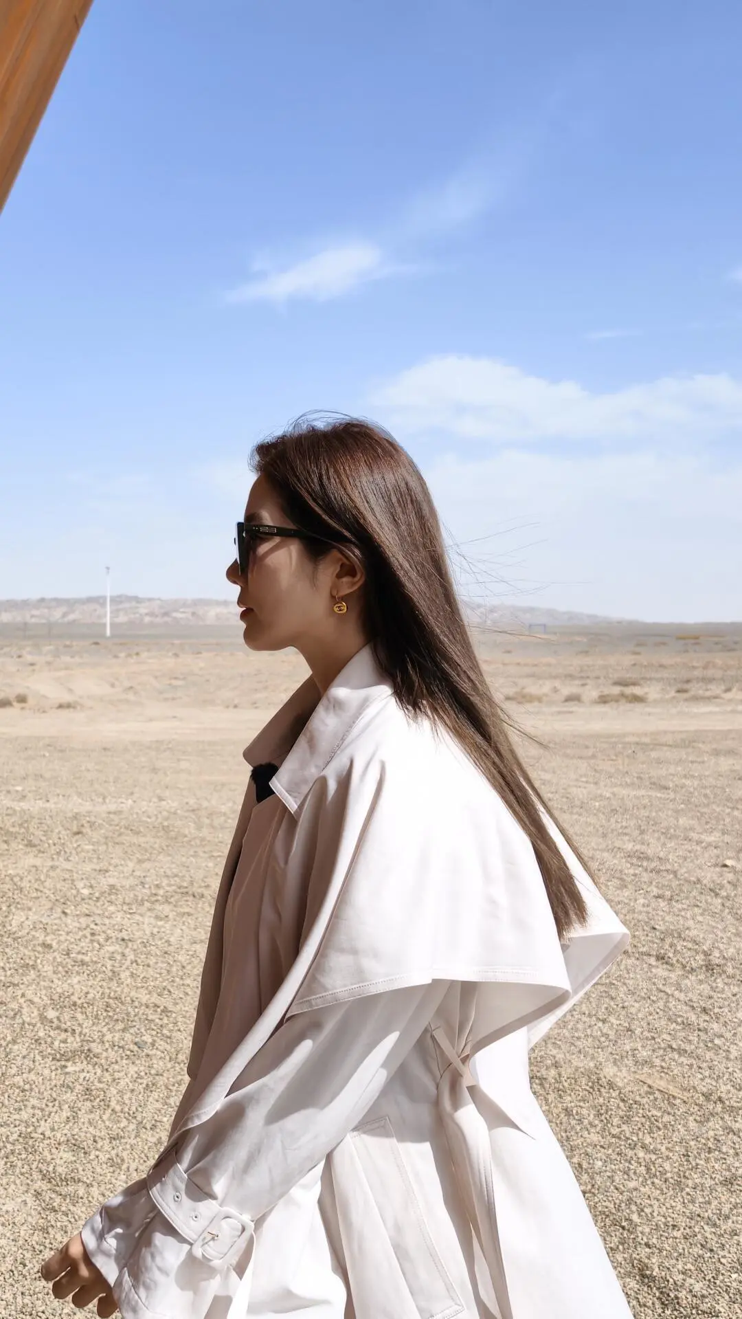 在有风沙的地方穿风衣简直是完美 我选择了米白色 既降温又显眼 风一吹很灵动 是那种大漠独有的自由感