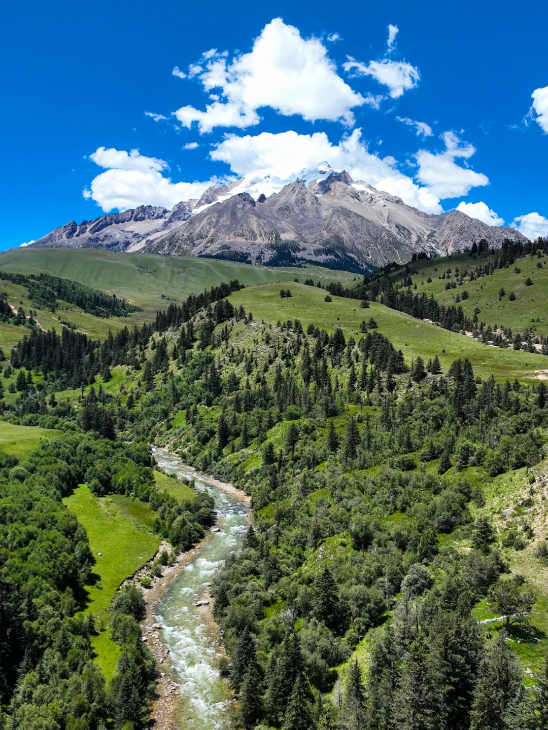 这里是山顶草甸,可以拍摄草坪、森林和雪山同框的绝美场景。