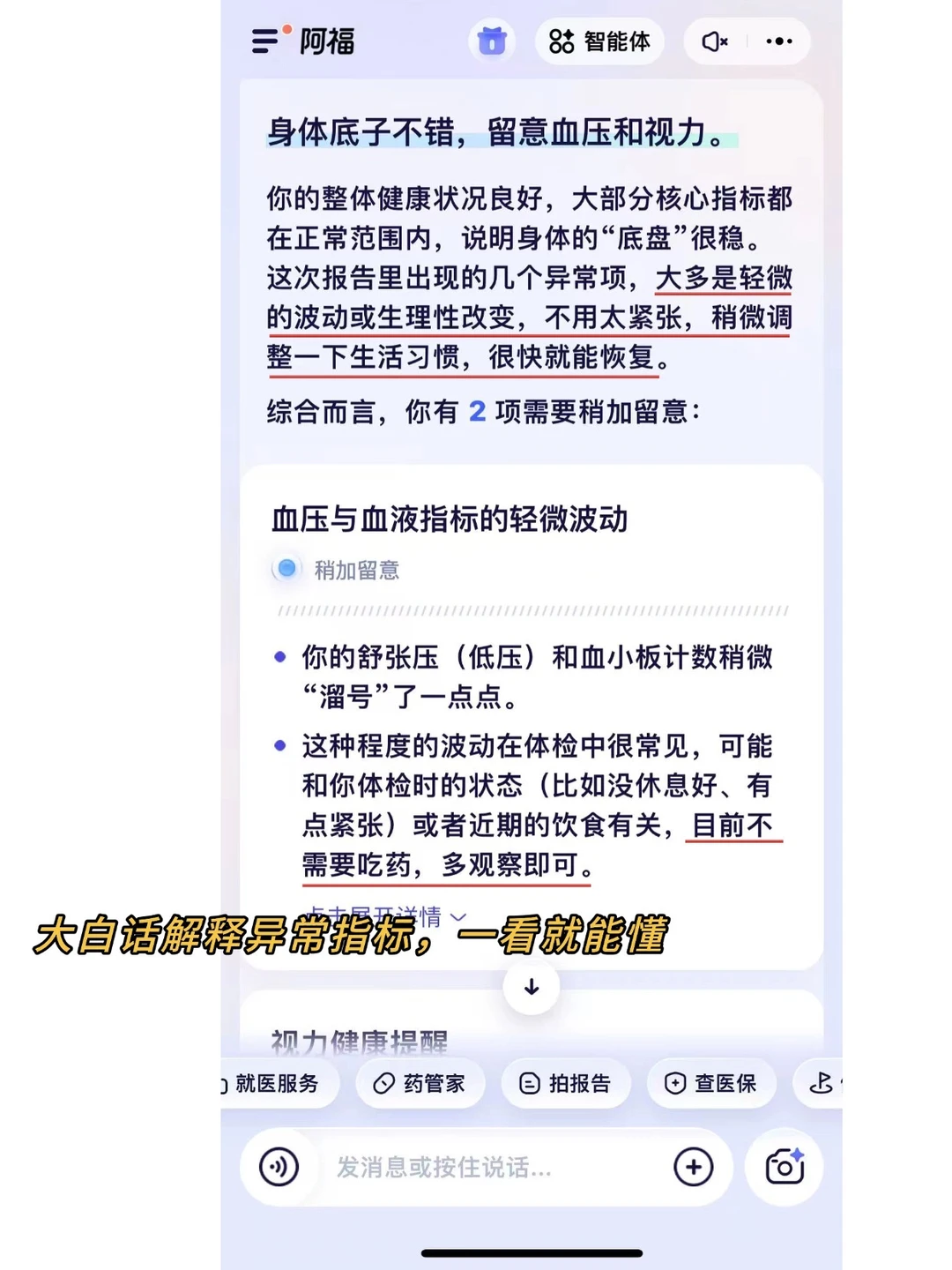 以前看到血常规的各种箭头就有点懵,阿福告诉我:不用紧张,血压和血小板偏低,是因为没有休息好引起的数据轻微波动,不需要吃药。通俗易懂,没有专业术语的隔阂,信源可查、没有广告。和搜索出来的结果,完全不是一个东西。