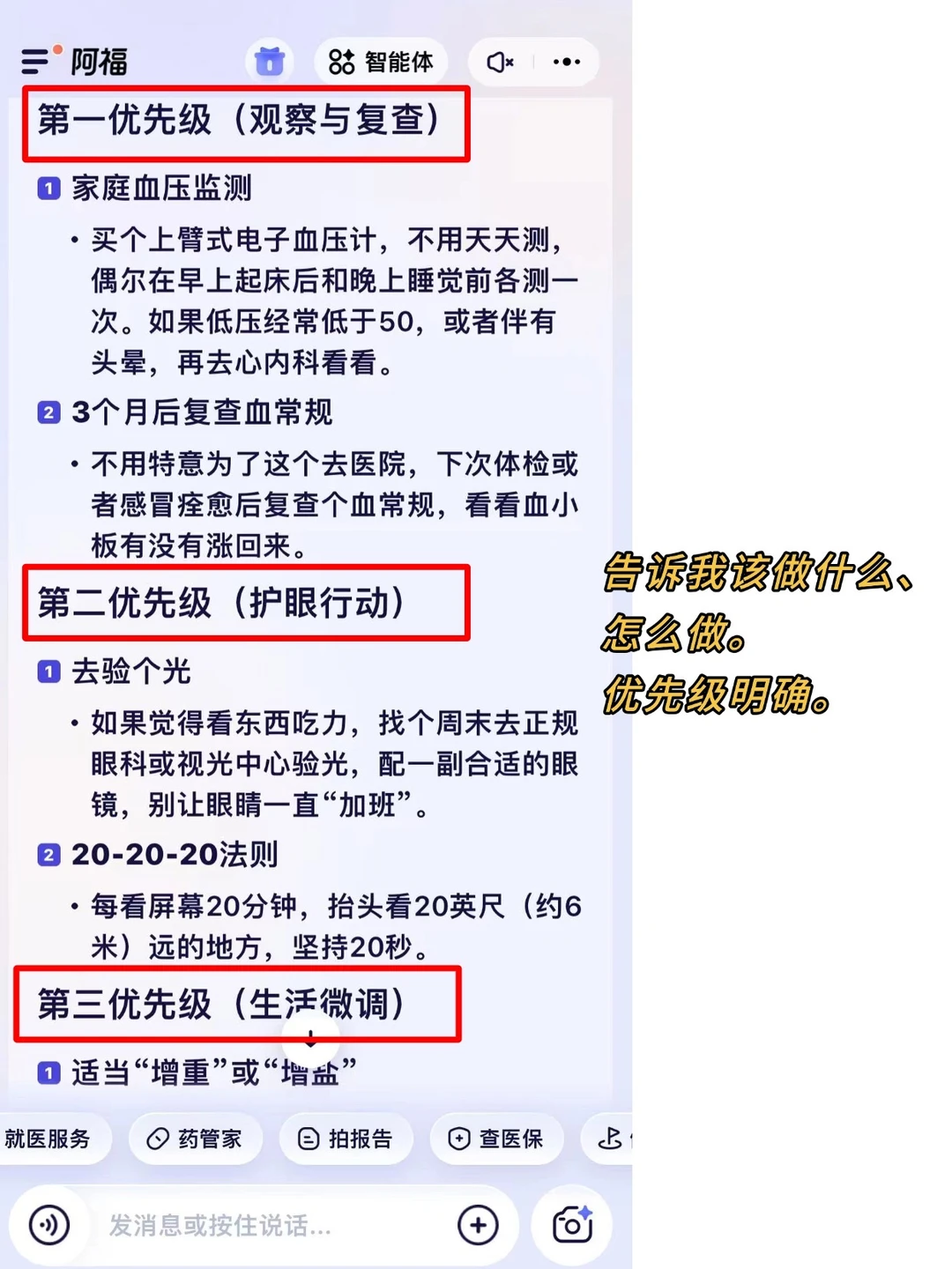 第一优先级(马上做):比如,要看病的,会明确让你挂心血管内科看高血压,带上体检报告;日常建议你买上臂式血压计,早晚量。