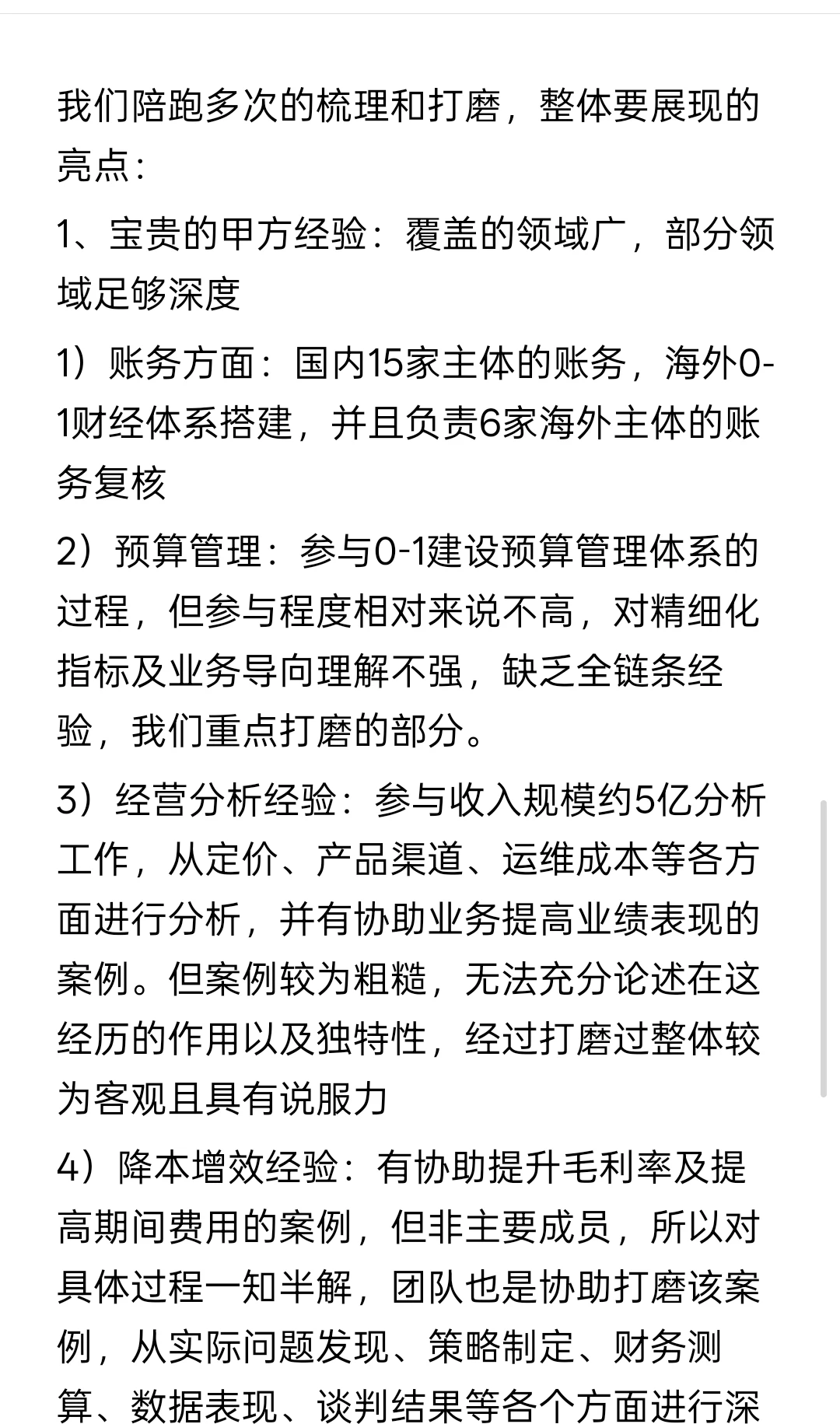 4)降本增效经验:有协助提升毛利率及提高期间费用的案例,但非主要成员,所以对具体过程一知半解,团队也是协助打磨该案例,从实际问题发现、策略制定、财务测算、数据表现、谈判结果等各个方面进行深挖。