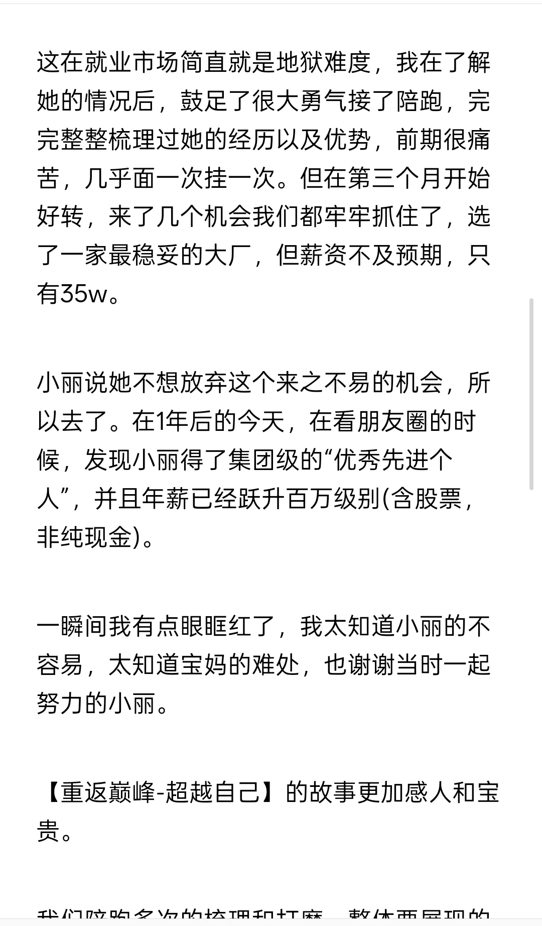 这在就业市场简直就是地狱难度,我在了解她的情况后,鼓足了很大勇气接了陪跑,完完整整梳理过她的经历以及优势,前期很痛苦,几乎面一次挂一次。但在第三个月开始好转,来了几个机会我们都牢牢抓住了,选了一家最稳妥的大厂,但薪资不及预期,只有35w。