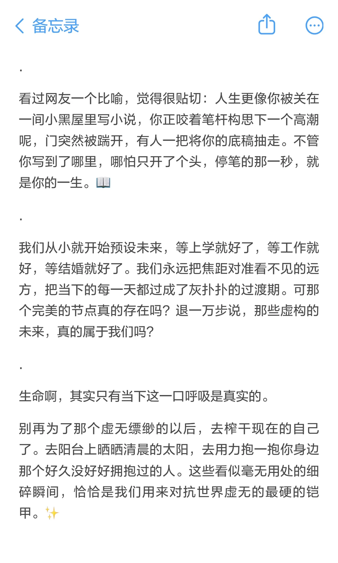 别再为了那个虚无缥缈的以后,去榨干现在的自己了。去阳台上晒晒清晨的太阳,去用力抱一抱你身边那个好久没好好拥抱过的人。这些看似毫无用处的细碎瞬间,恰恰是我们用来对抗世界虚无的最硬的铠甲。✨