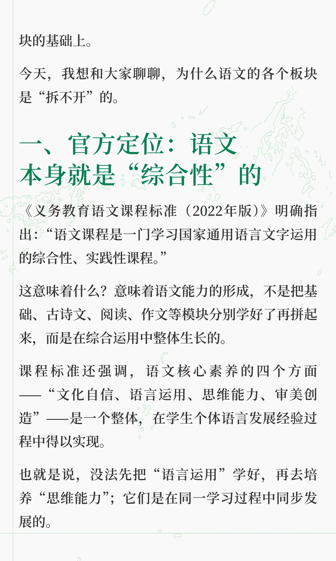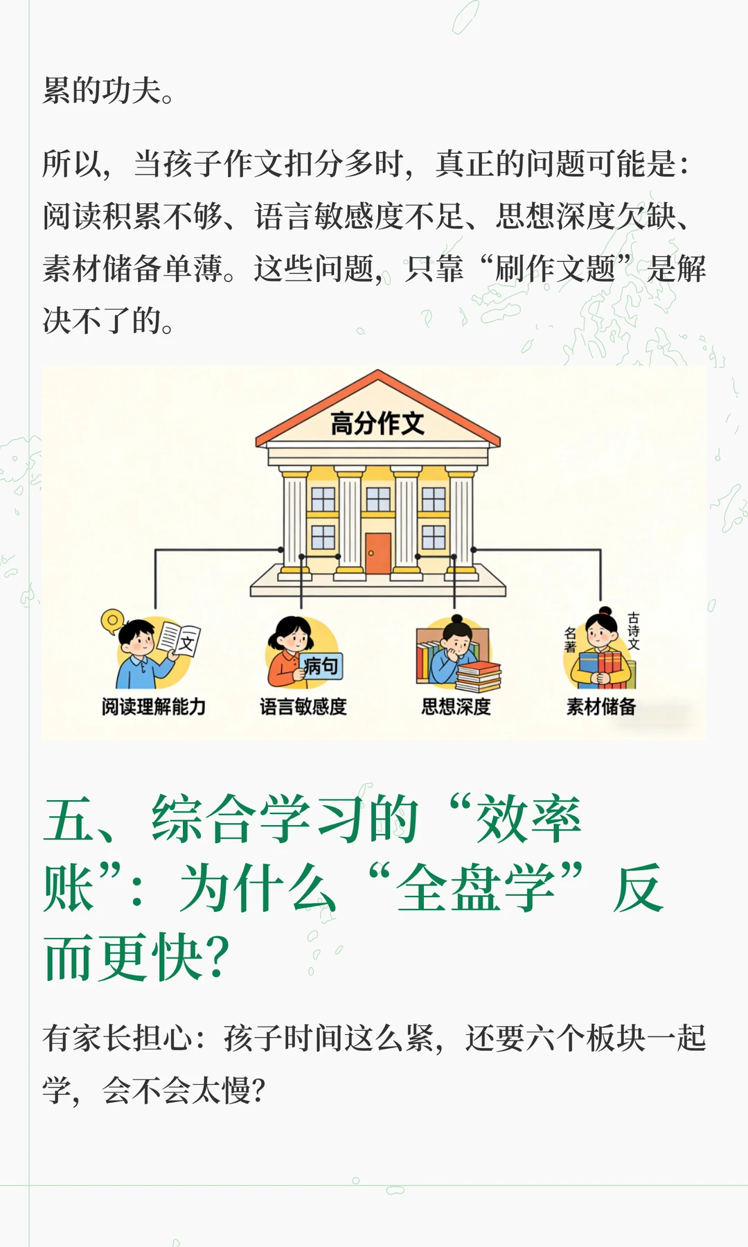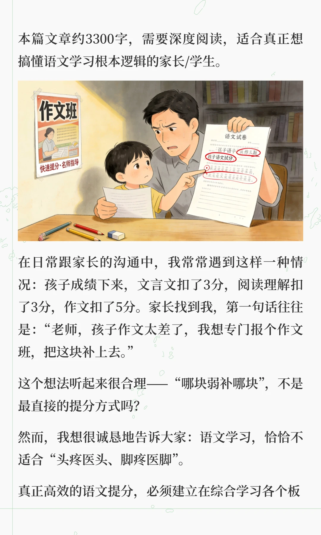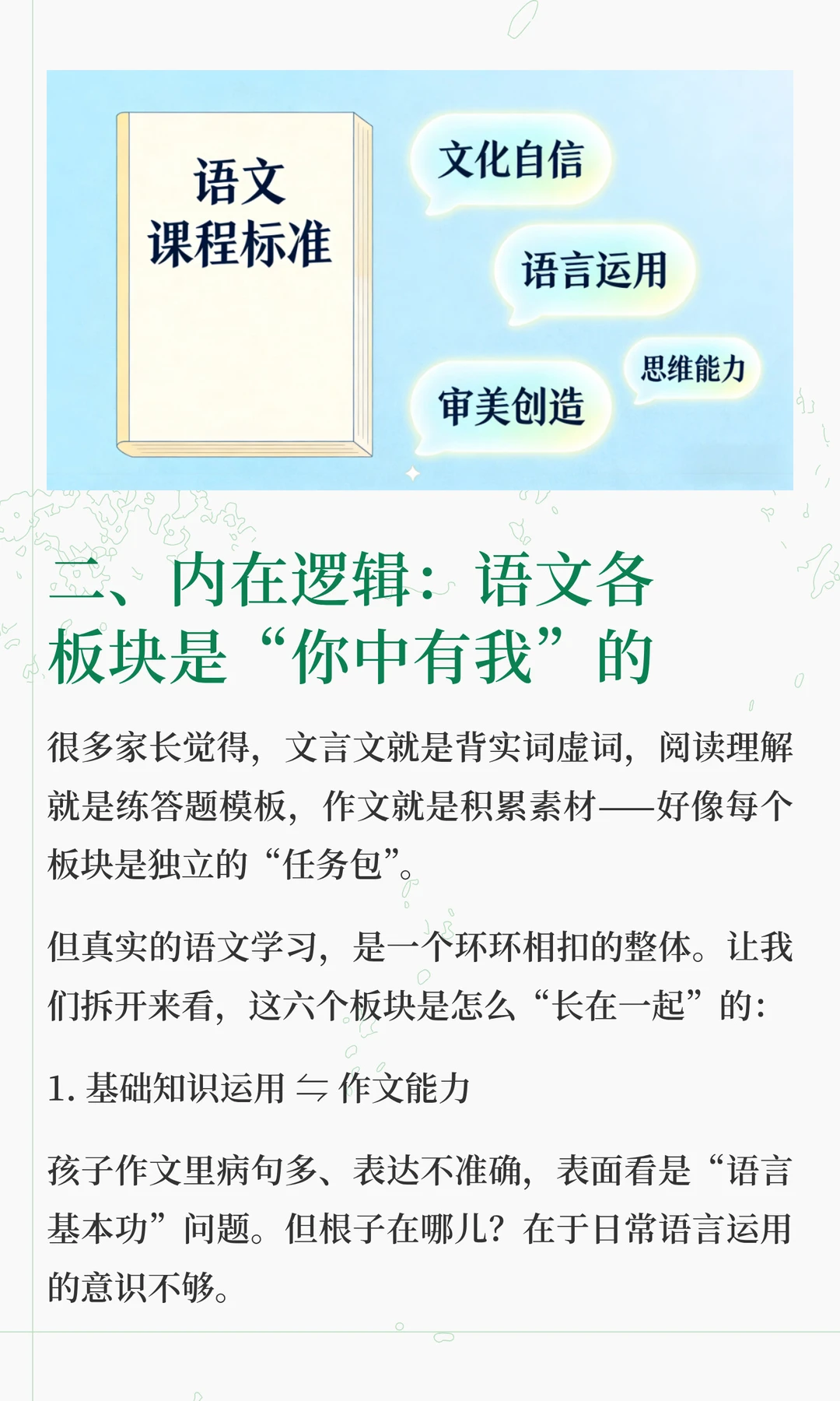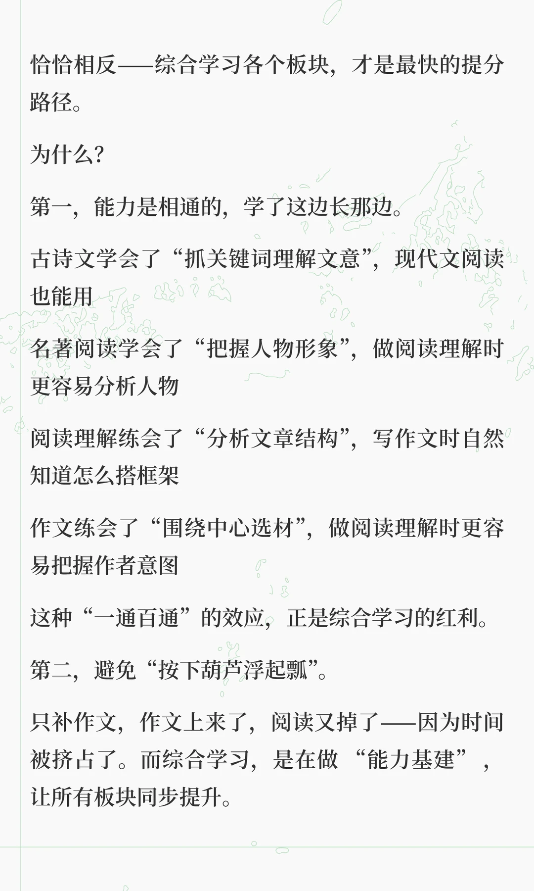 这两天在解答很多家长的咨询的时候,发现大家对语文各板块之间的关系理解,存在很大问题 总有一种“头疼医头,脚疼医脚”的想法,认为这样是最高效。 但实际上,语文能力的形成,不是把基础、古诗文、阅读、作文等模块分别学好了再拼起来,而是在综合运用中整体生长。 “哪块弱补哪块”,只适合临时抱佛脚,这是无奈之举,想要语文学好,拔尖,必须要整体性提升 想要深入了解其中底层逻辑的家长,可以看看这篇文章。