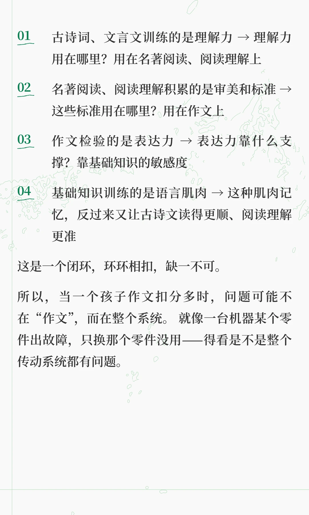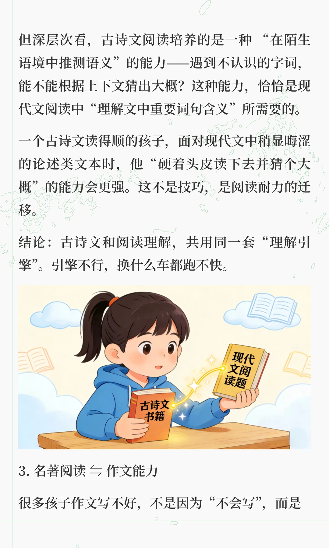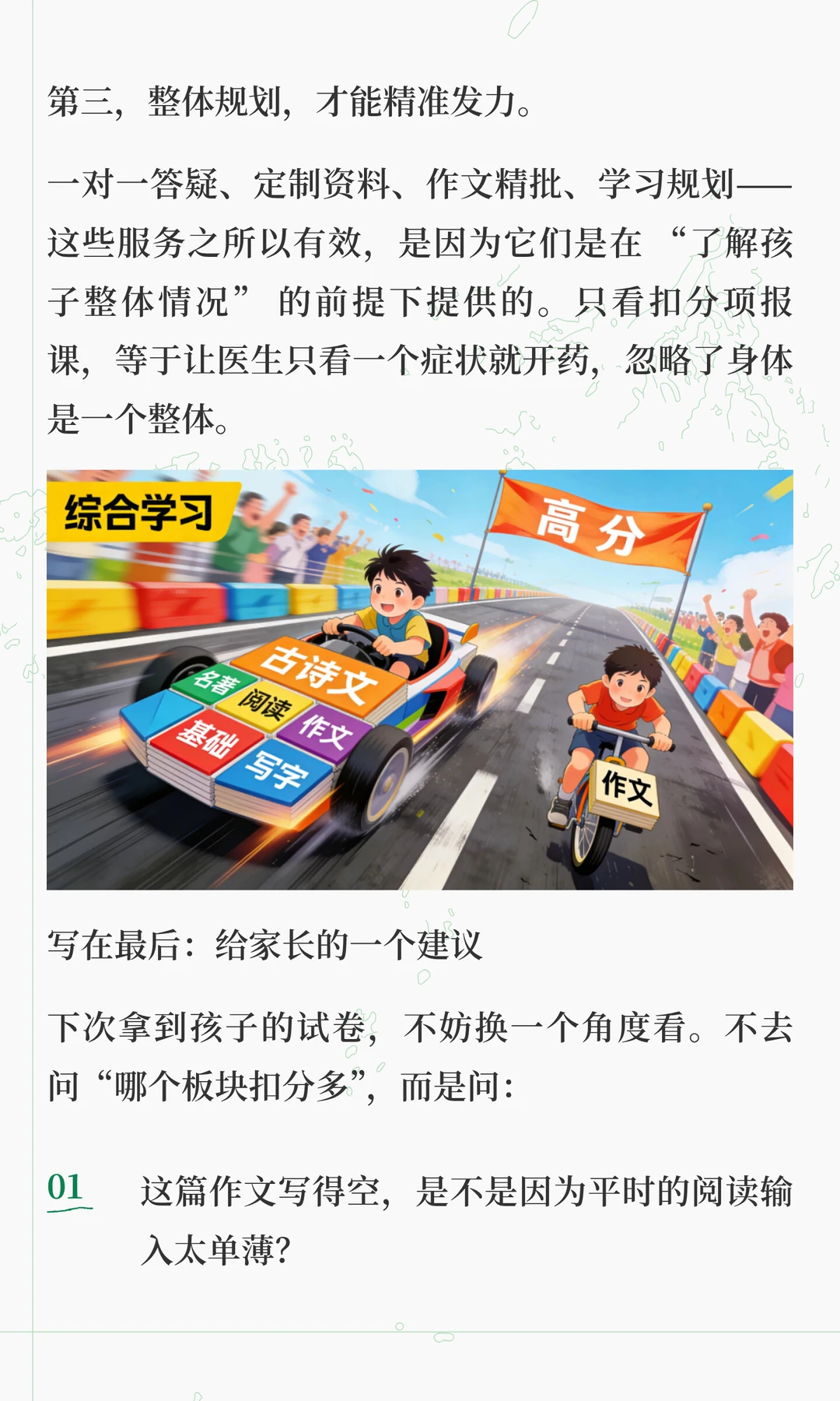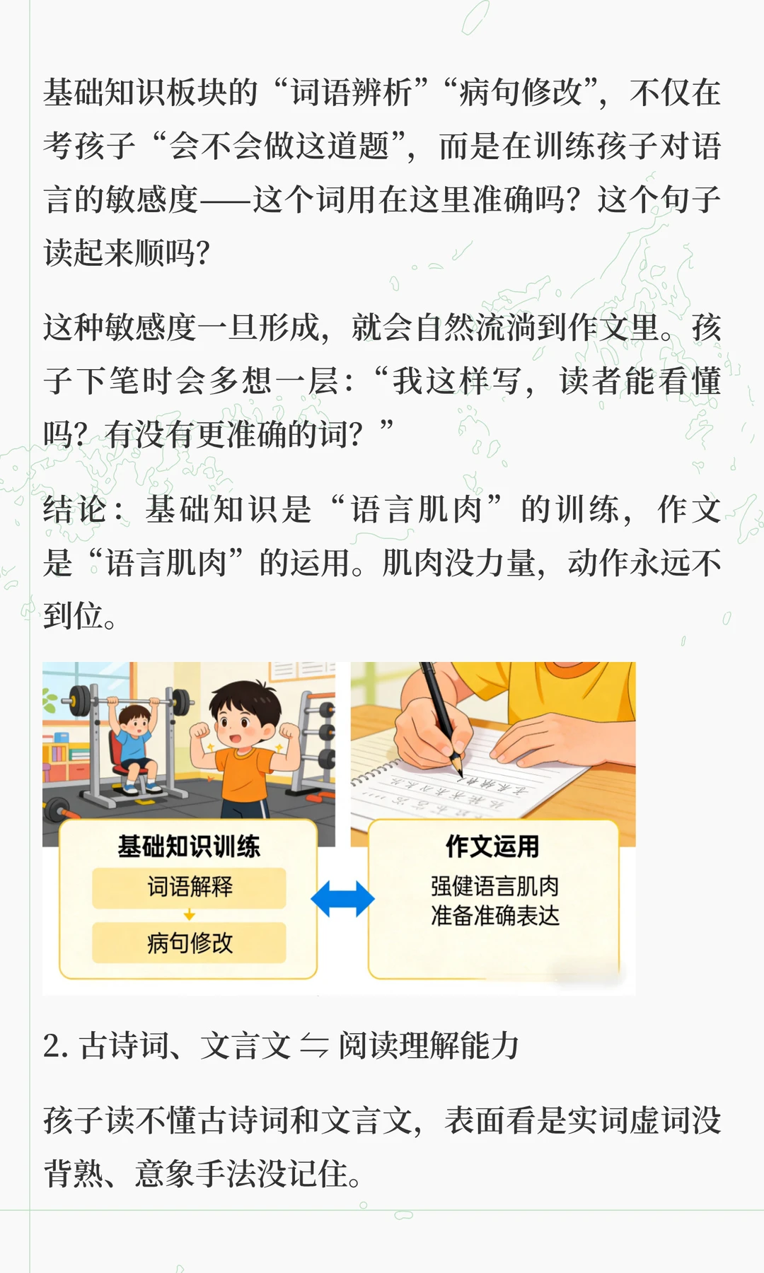这两天在解答很多家长的咨询的时候,发现大家对语文各板块之间的关系理解,存在很大问题 总有一种“头疼医头,脚疼医脚”的想法,认为这样是最高效。 但实际上,语文能力的形成,不是把基础、古诗文、阅读、作文等模块分别学好了再拼起来,而是在综合运用中整体生长。 “哪块弱补哪块”,只适合临时抱佛脚,这是无奈之举,想要语文学好,拔尖,必须要整体性提升 想要深入了解其中底层逻辑的家长,可以看看这篇文章。