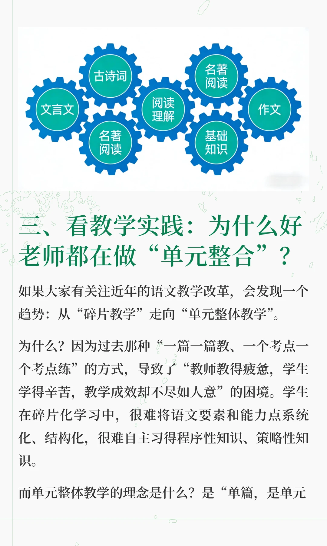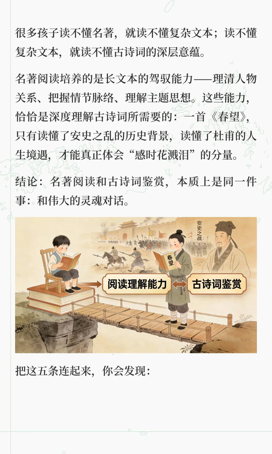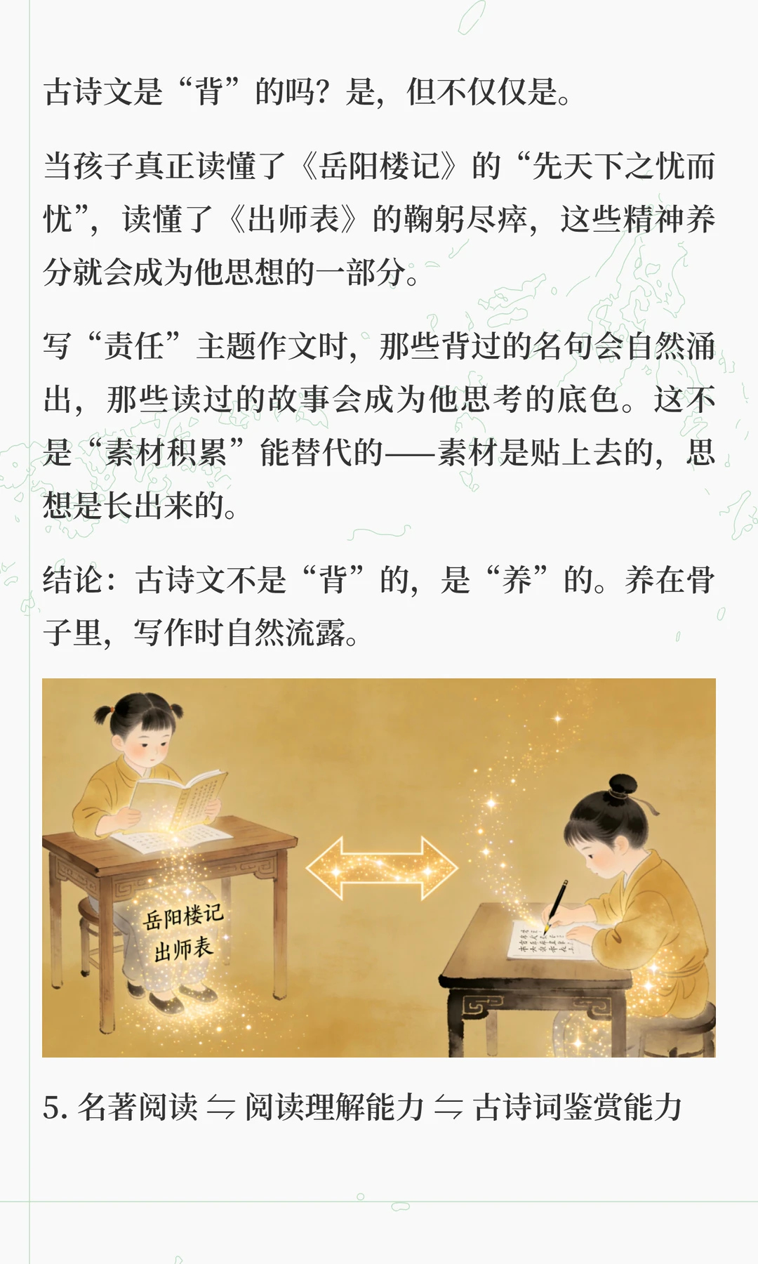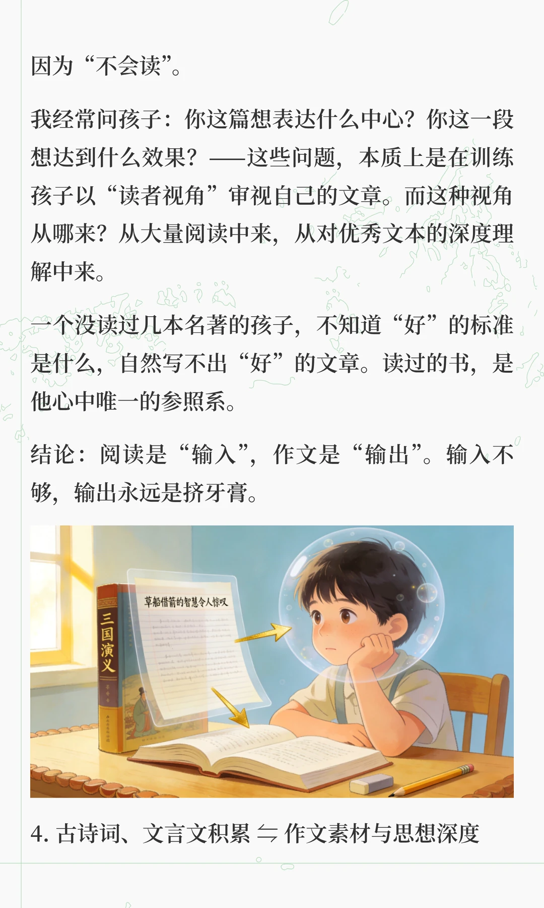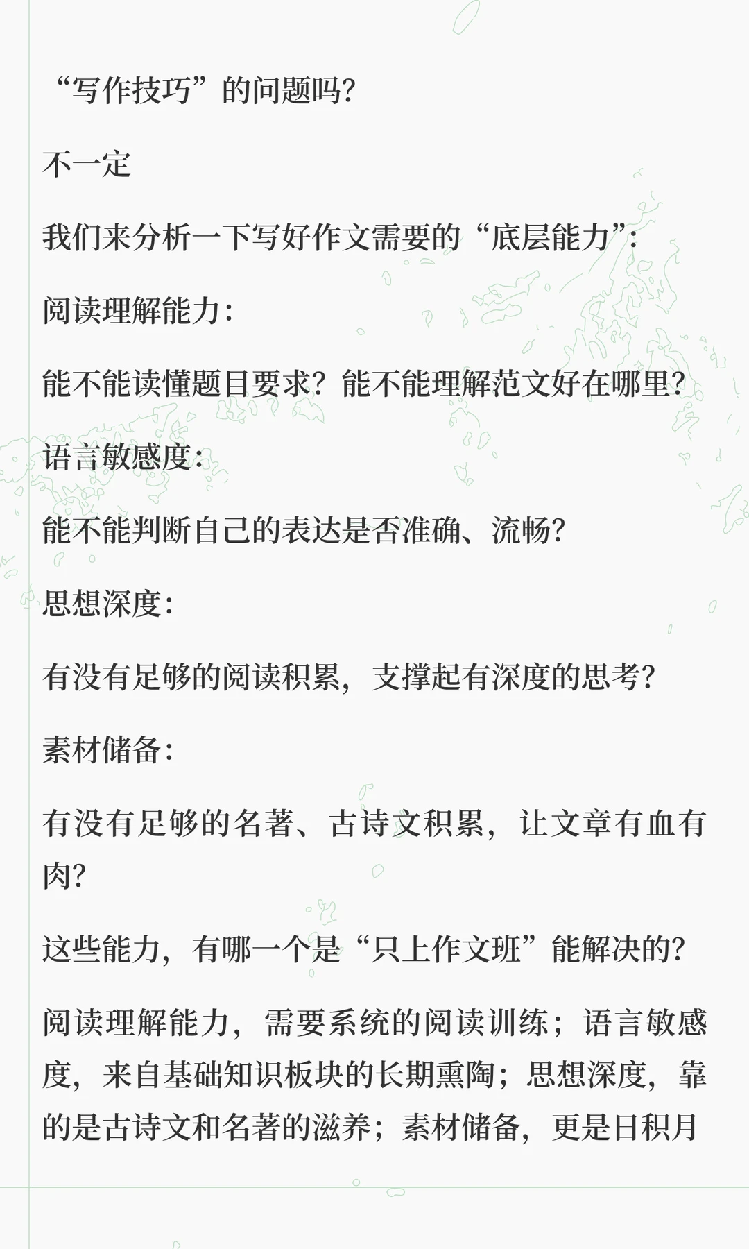 这两天在解答很多家长的咨询的时候,发现大家对语文各板块之间的关系理解,存在很大问题 总有一种“头疼医头,脚疼医脚”的想法,认为这样是最高效。 但实际上,语文能力的形成,不是把基础、古诗文、阅读、作文等模块分别学好了再拼起来,而是在综合运用中整体生长。 “哪块弱补哪块”,只适合临时抱佛脚,这是无奈之举,想要语文学好,拔尖,必须要整体性提升 想要深入了解其中底层逻辑的家长,可以看看这篇文章。