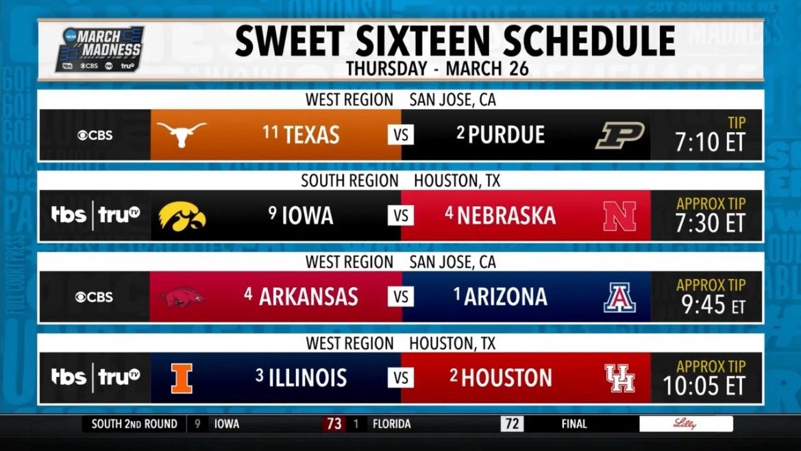 明天赛程:11号种子 得克萨斯 vs 2号种子 普渡9号种子 爱荷华 vs 4号种子 内布拉斯加1号种子 亚利桑那 vs 4号种子 阿肯色*(布雷登-伯里斯vs阿卡夫,2026乐透秀后卫对决)3号种子 伊利诺伊 vs 2号种子 休斯顿*(强强对话)