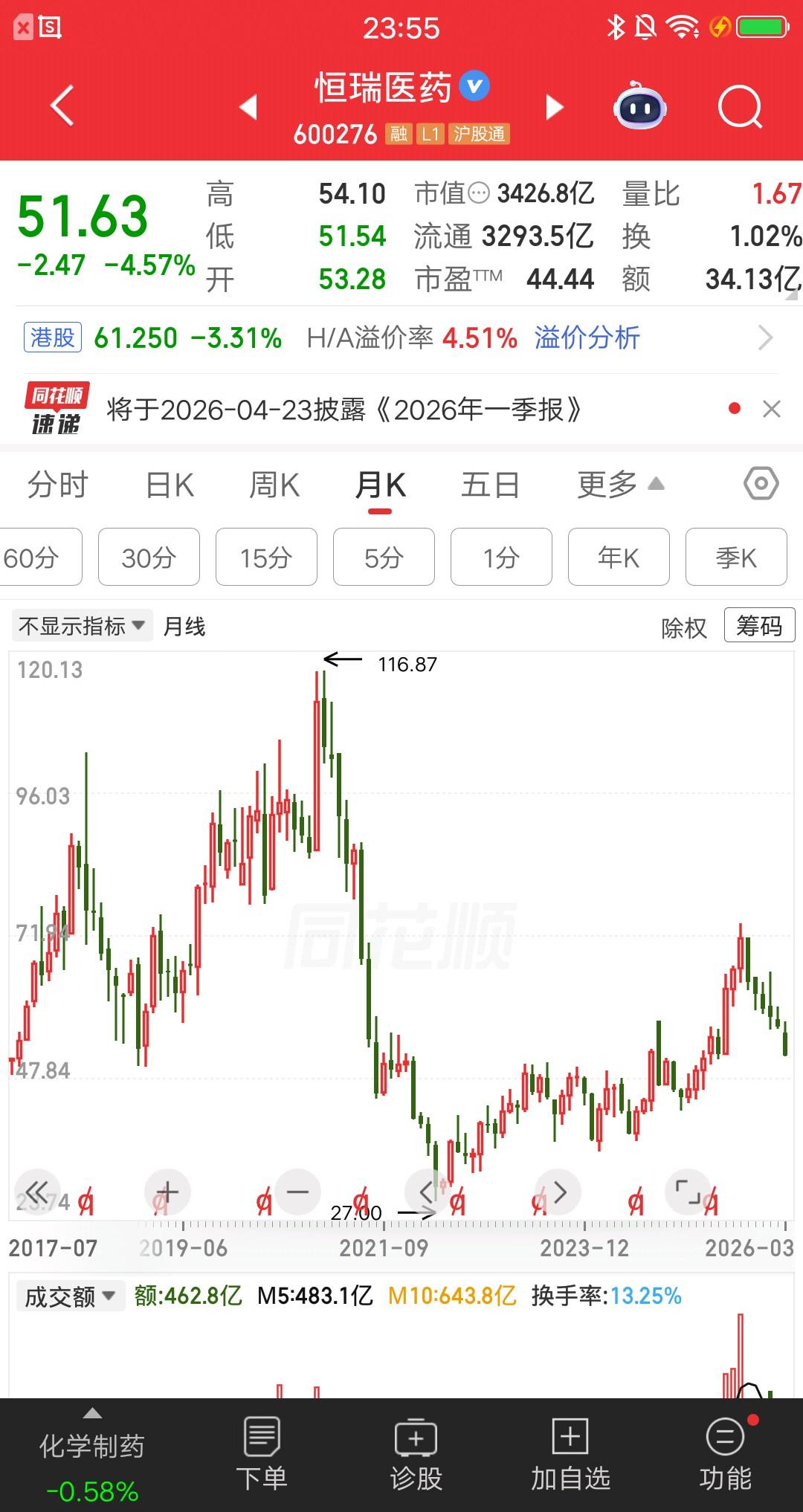 还要继续死扛下去吗?一位湖北的股民在20年11月份,以86.91元的价格买入54万恒瑞医药。他是被牛市吸引进来的,当时可是“吃药”行情。还记得葛兰吗,葛兰就是在20年名声大噪的。被称为医药女神,管理的中欧医疗涨得贼好,大批股民买了基金。 这位股民买完以后,很快恒瑞医药涨到了116.87元,他的账户浮盈近35个点。他选择继续持股,这点收益太少了,他听别人说大牛市拿着不动就行了。然而他做梦都没想到,116.87元是恒瑞医药再也回不去的巅峰了。 此后股价一度跌到27元,跌幅高达77%,账户亏得一塌糊涂。不过他和一般散户有点不同,就是没有补过仓位。这也是他至今没有回本的原因,盈亏同源就是这个道理。 大A近两年的超级牛市,恒瑞医药最高涨到74.04元,离他的成本86.91元,只差不到18%的涨幅。目前最新价51.63元,离回本价又远了。 5年多了,人生有多少个5年呀,他还要坚持下去吗?根本不敢补仓,怕越补亏越多。怎么办,大家给他出出主意呀。