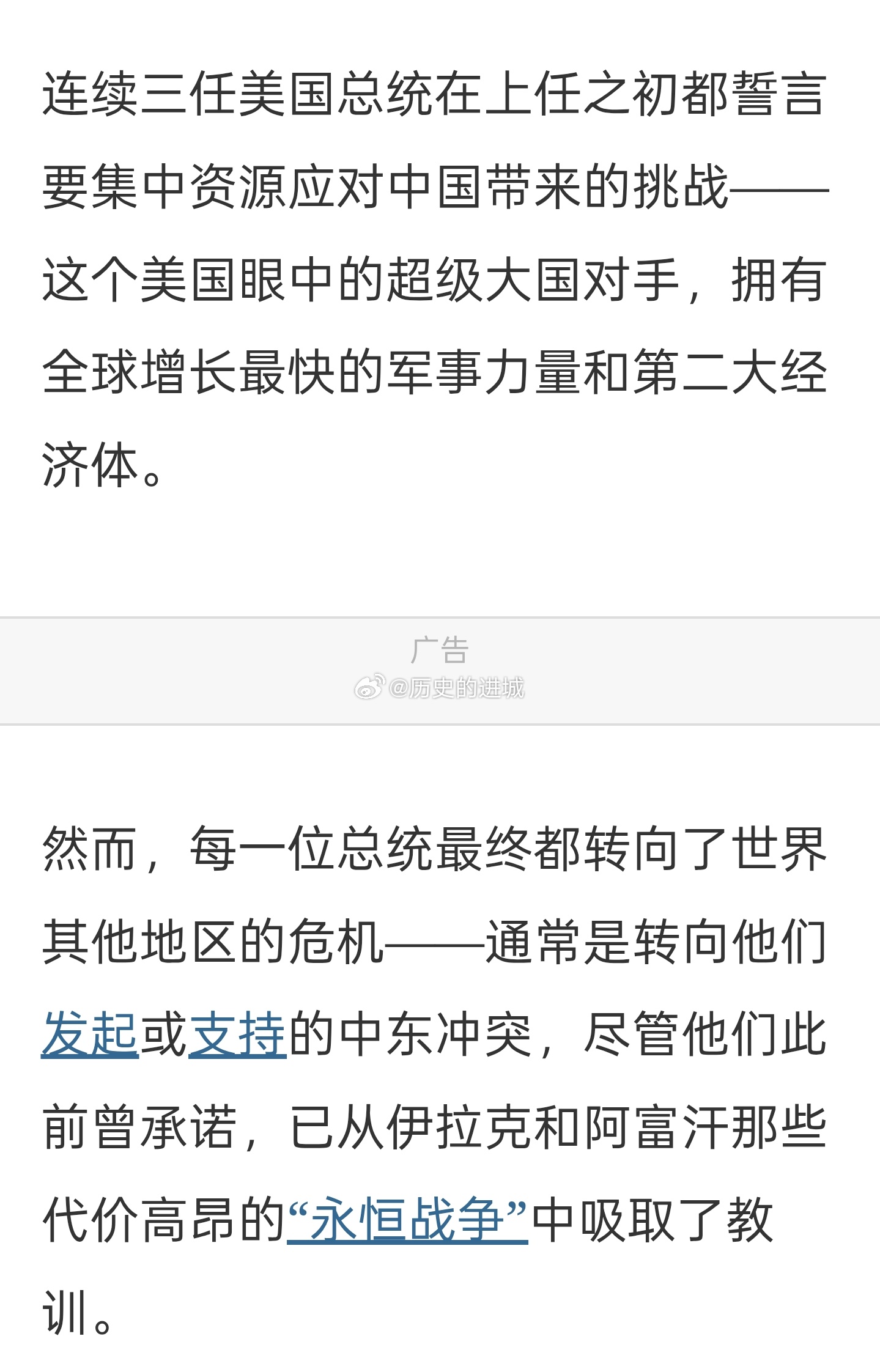NYT这篇文章总结到,连续三任美国总统在上任之初都誓言要集中资源应对中国带来的挑战——这个美国眼中的超级大国对手,拥有全球增长最快的军事力量和第二大经济体。然而,每一位总统最终都转向了世界其他地区的危机——通常是转向他们发起或支持的中东冲突,尽管他们此前曾承诺,已从伊拉克和阿富汗那些代价高昂的“永恒战争”中吸取了教训。