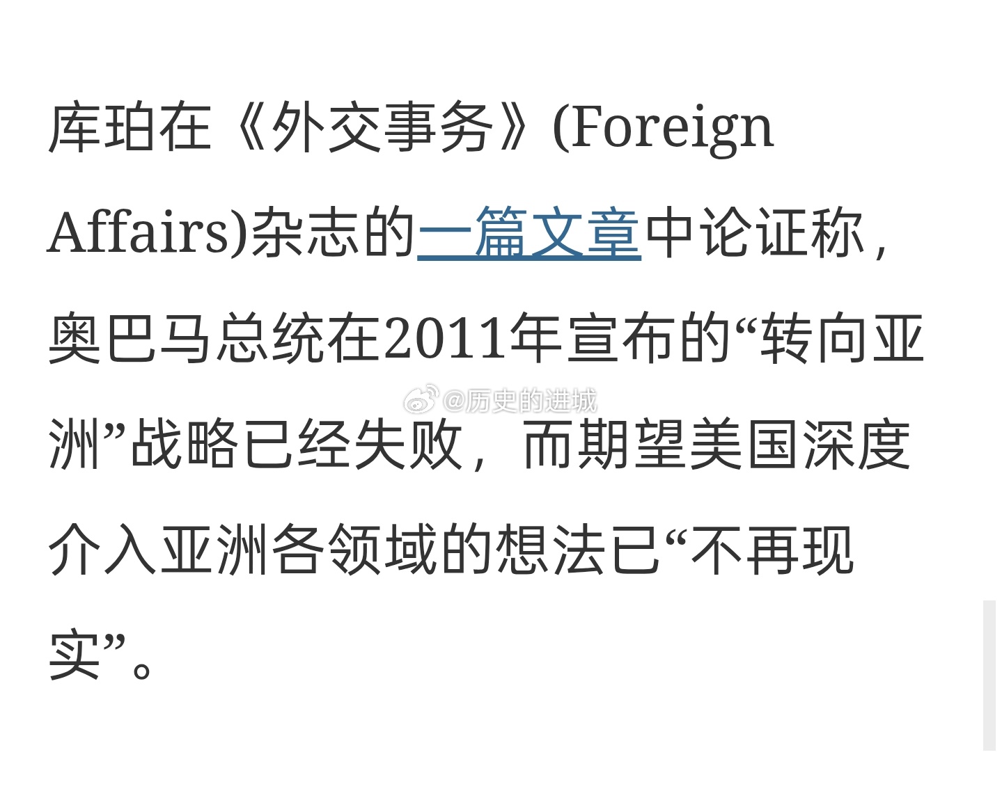 保守派研究机构美国企业研究所的美国亚洲战略学者扎克·库珀在《Foreign Affairs》杂志的一篇文章中论证称,奥巴马在2011年宣布的“转向亚洲”战略已经失败,而期望美国深度介入亚洲各领域的想法已“不再现实”。海外新鲜事