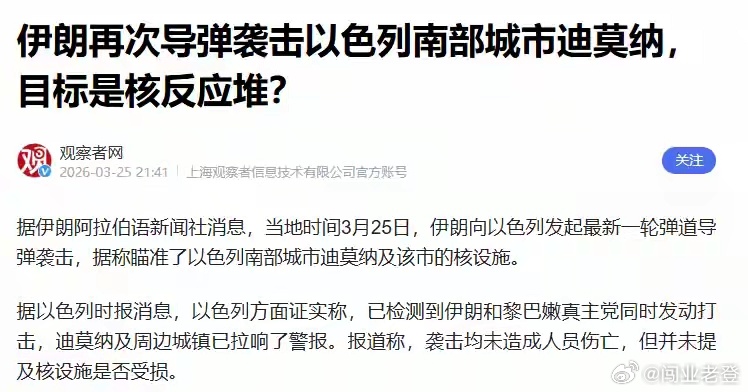 伊朗大杀器登场,以色列被打疼,美迎来不眠之夜,特朗普被迫让步3月25日深夜,伊朗革命卫队一纸声明震动中东——70余个以色列目标遭到导弹齐射,特拉维夫、海法、迪莫纳同时告急。40分钟,4波打击,防空警报响彻以色列全境。更让外界意外的是,就在炮火连天的同一时刻,白宫那边却在忙着跟伊朗"传话"谈停火。一边打,一边谈。这场仗,到底谁撑不住了?这一轮打击来得又猛又快。3月25日晚间,伊朗革命卫队发表声明,宣布对以色列境内70余个目标实施了新一轮导弹攻势。以色列方面随即证实,不到40分钟的时间里,伊朗连续发起了4波打击,特拉维夫、海法等主要城市防空警报全线拉响。这不是普通的火箭弹袭扰。伊朗这次拿出来的,是"霍拉姆沙赫尔-4"重型弹道导弹。这型导弹射程约2000公里,弹头重达1500公斤,属于伊朗武器库中打击力最强的型号之一。此前在"真实承诺-4"行动中,这型导弹已经多次投入实战,每次亮相都让以色列的防空系统如临大敌。打击目标里最引人关注的,是以色列南部城市迪莫纳。迪莫纳附近有以色列的敏感核研究设施,这已经是冲突爆发以来伊朗第二次将导弹对准这个区域。以色列方面25日确认迪莫纳再次遭袭,同时强调没有人员在袭击中死亡。回看4天前的3月21日晚间,迪莫纳和邻近城市阿拉德第一次遭到伊朗弹道导弹直接命中,当时造成超过100人受伤。那一次,以色列的"箭"式反导系统和"铁穹"防空系统先后尝试拦截,两次都没能成功。以军发言人德夫林事后承认,"防护措施并非密不透风。"以色列总理当晚发表声明,只说了一句话——"这是一个非常艰难的夜晚。"拦截失败的消息传出后,伊朗议会议长卡利巴夫立刻在社交平台上回应:如果以色列在防护最严密的迪莫纳地区都拦不住导弹,那从作战角度来说,这场战斗已经进入了新阶段。事实上,从3月22日开始,伊朗的攻势就明显升级了。当天,伊朗武装部队中央司令部司令阿卜杜拉希公开宣布了一个重要信号——伊朗武装部队的作战方针已经从防御转为进攻,战场战术全面调整。这句话不是随便说说的。在此之后,伊朗在"真实承诺-4"行动框架下接连发动了数十波次攻势,动用了"海巴尔·谢坎""征服者""伊马德""卡德尔"等多型导弹,外加"阿拉什-2"新型无人机,覆盖范围从以色列本土一直延伸到美军在沙特、巴林的军事基地。伊朗军方消息人士放话说,革命卫队和民兵武装的主力部队到现在都没有全部投入,后面还有"新的手段"等着用。以色列方面的伤亡数据也在不断攀升。以色列方面还透露,正在调查伊朗在25日的袭击中是否使用了集束弹药。多个城市出现大面积建筑损毁,部分地区陷入火海。值得注意的是,国际原子能机构此前已经就核设施附近的军事行动发出警告,呼吁各方在核设施周边保持最大限度的军事克制。在迪莫纳接连两次被导弹瞄准之后,核安全的忧虑不只是以色列一家的事了。如果说导弹攻防是这场冲突的"明线",那空中战场上的信息战就是最大的"暗线"。伊朗和美以双方围绕战果通报的争论,到现在还没有任何定论。3月25日,伊朗方面宣布,防空系统击落了一架美军F-18舰载战斗机。这已经不是伊朗第一次发布类似消息。在此之前,伊朗先后对外通报称,已经击落了至少4架美军F-15战斗机、3架以军战机,以及上百架无人机,其中包括美军的MQ-9"收割者"无人机和以色列的"赫尔墨斯"系列无人机。美方最初的反应是直接否认,称伊朗的说法完全不属实。五角大楼公开回应说,没有任何F-15战机被击落。这个回应很干脆。接下来的事情就有意思了。伊朗方面先后公布了其所称的美军F-35战机和F-18战机被击中的影像画面。不管这些画面的真实性如何,伊朗的态度很明确——你说我撒谎,我就拿画面出来让全世界看。而在这些画面公布之后,白宫和五角大楼在这个问题上都没有再作进一步的公开回应。既没有承认,也没有第二次否认。与此同时,伊朗方面还声称,其无人机命中了在阿曼湾海域航行的美军"林肯"号航母。据多家媒体报道,"林肯"号航母战斗群近期确实调整了部署方向,向印度洋方向移动。航母调动的原因,美方没有公开解释,外界只能猜测。这里必须说清楚一件事:以上所有关于击落战机、命中航母的消息,都来自伊朗方面的单方通报。美方否认了部分内容,对另一部分选择了沉默。在一场正在进行的战争中,交战双方的战果声称往往差距巨大,这是惯例。新华社此前的报道也指出,自冲突爆发以来,各方经常发布相互矛盾的军事通报,各有各的叙事需要。仗打到第四周,一个非常微妙的局面出现了——炮弹还在飞,停火的传话却开始了。时间回到3月21日。白宫方面在社交媒体上发布了一个48小时最后通牒,要求伊朗无条件开放霍尔木兹海峡,否则就要对伊朗的发电设施发动打击。这个威胁一出来,国际油价立刻跳涨,全球市场神经紧绷。伊朗的回应可以说相当硬。伊朗武装部队当天发表声明,一口气列出了四条反制措施:第一,霍尔木兹海峡将全面关闭,直到受损发电设施修复完毕;第二,大范围打击以色列的所有能源和通信基础设施;第三,摧毁中东地区美方持股的企业设施;第四,所有设有美军基地的中东国家,其发电设施都将被列为打击目标。伊朗革命卫队还专门加了一句:攻击电力系统会影响医院和海水淡化设施,属于不人道行为。言下之意——你敢打我的民生设施,我就把你在整