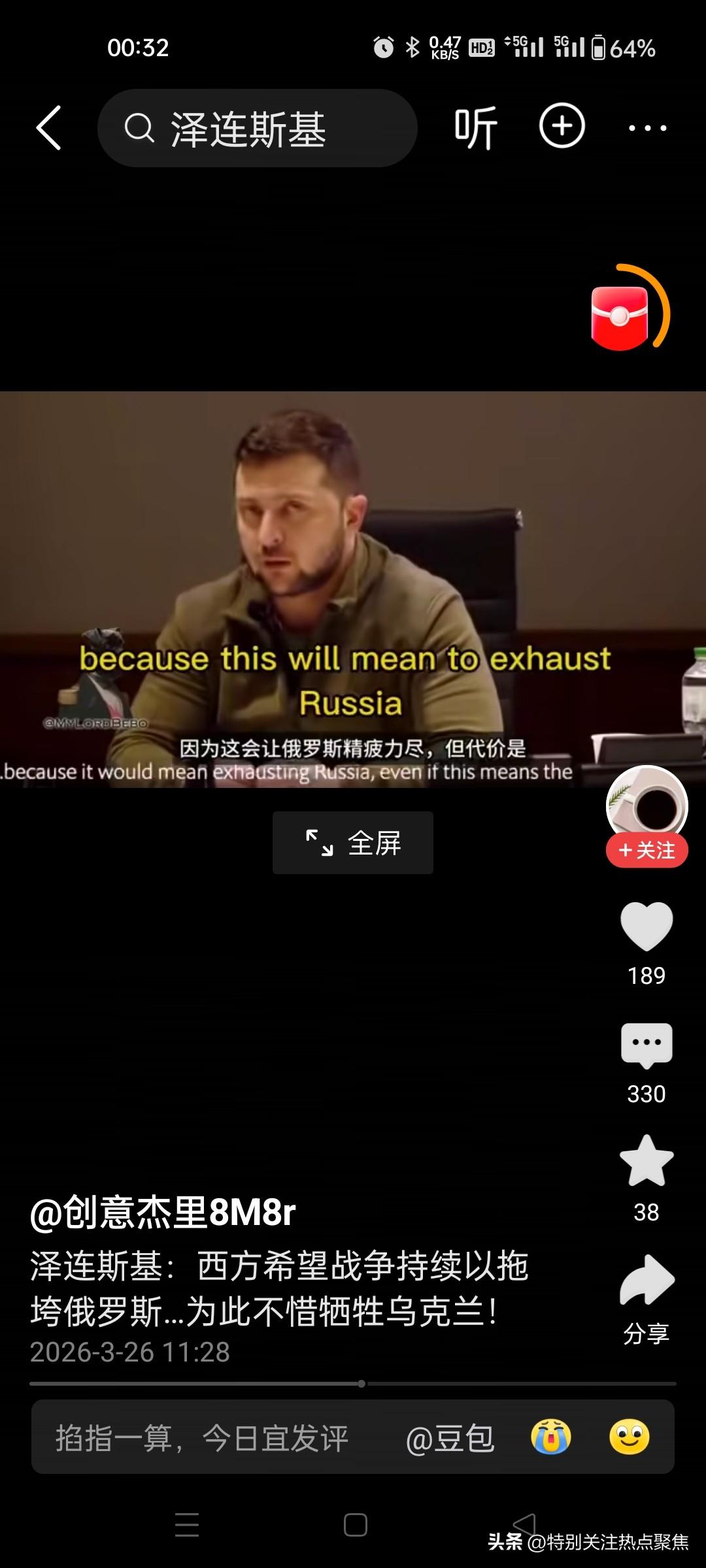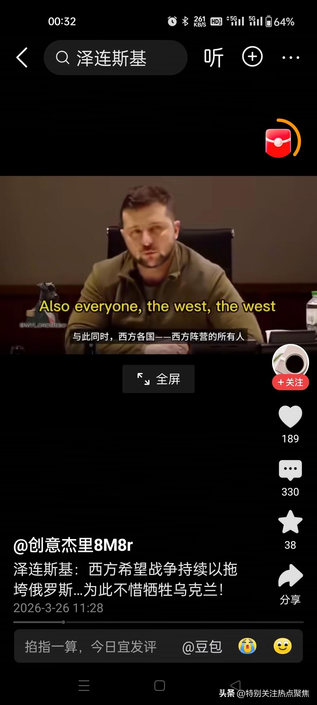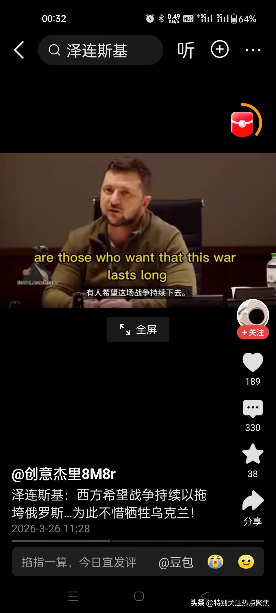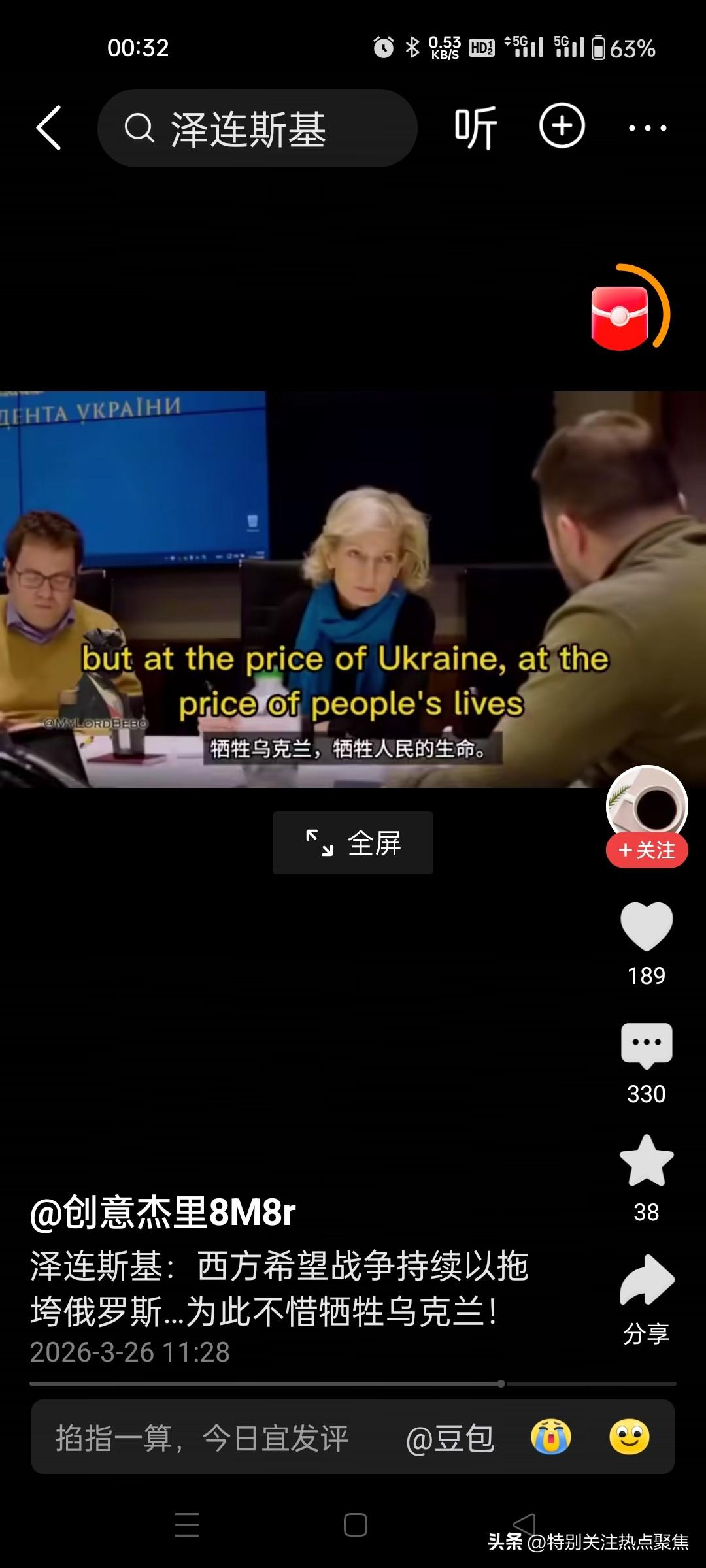 泽连斯基终于醒悟:西方希望战争持续拖垮俄罗斯,为此不惜牺牲乌克兰 ,希望尽快结束战争 泽连斯基确实曾表达过“西方希望战争持续以消耗俄罗斯,但代价是乌克兰人的生命”这一观点,但这并非其 2026 年的“新醒悟”,而是其在 2022 年就已公开陈述的看法。 观点溯源:泽连斯基早在 2022 年的采访中就明确指出,部分西方国家希望俄乌战争持续下去,因为这将消耗俄罗斯,但付出的代价是乌克兰人的生命。17 近期表态:在 2026 年 3 月的言论中,泽连斯基再次提及西方阵营中存在希望战争持续以拖垮俄罗斯的势力,并强调这种策略不惜牺牲乌克兰的利益。他同时指出,美国因聚焦中东(伊朗)冲突而降低对乌优先级,甚至施压乌克兰割让领土以换取快速停战,这被他视为一种牺牲乌克兰的做法。21415 核心立场:尽管意识到被当作棋子的风险,泽连斯基仍坚决反对以割让领土换取和平,强调和平不能以牺牲乌克兰的主权和安全为代价,并呼吁召开领导人会议解决实质问题。他承认当前乌克兰士气低落、民众疲惫,但表示不会接受导致国家失去一切的“坏和平”。2710 风险提示:部分搜索结果(如关于“美国要求基辅撤出顿巴斯否则断援”、“特朗普视乌克兰为必须牺牲的棋子”等具体细节)主要来自自媒体或非官方渠道的解读与传闻,虽反映了某种舆论倾向或谈判压力,但尚未得到美乌官方的正式确认,需谨慎看待其作为既定事实的准确性。