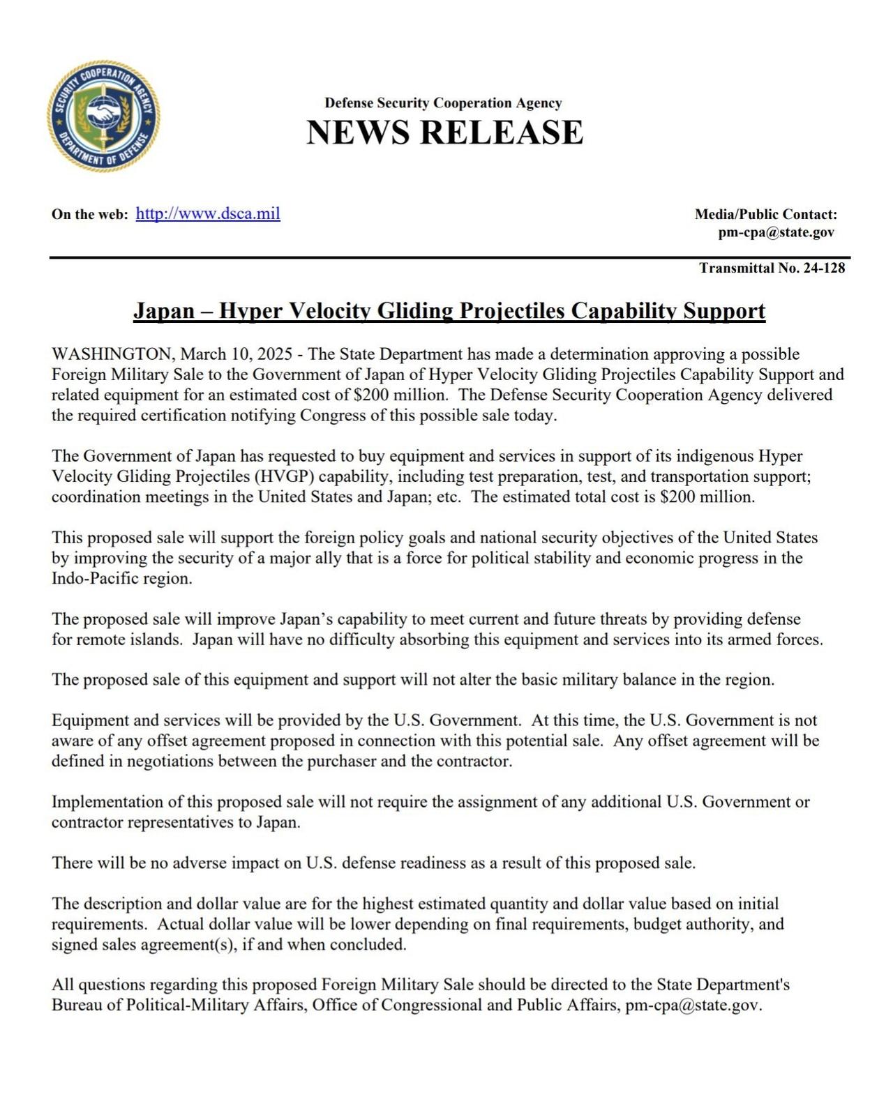 🇺🇸🇯🇵美国国务院已批准向日本出售设备和服务,以支持其自主研发的升级版超高速滑翔弹(HVGP)能力,预计成本为 3.4 亿美元。 设备和服务将由美国政府提供。