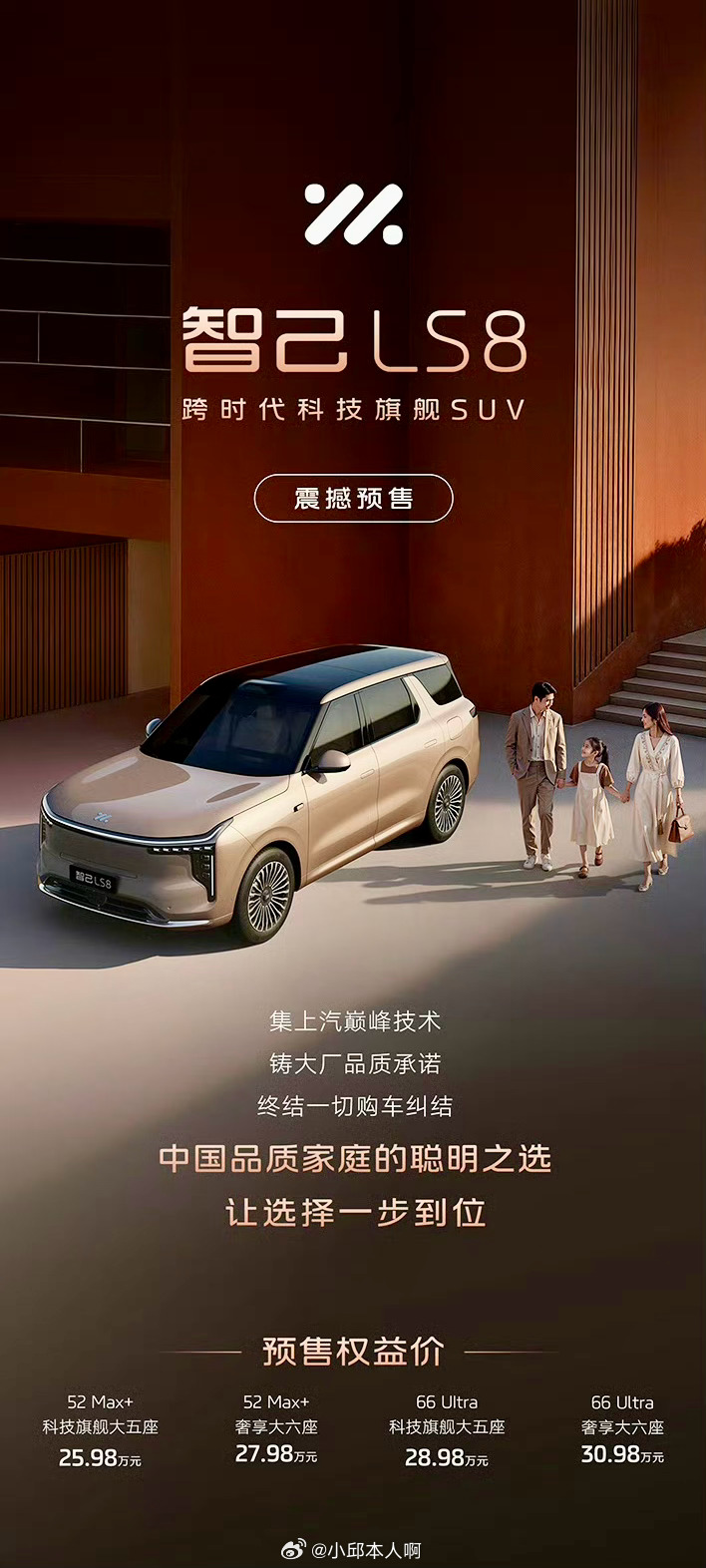 智己LS8跨时代科技旗舰SUV智己LS8现在开始预售了,起步价是25.98万元。这车是中大型SUV,有五座和六座两种选择,选六座的话要多花2万块。