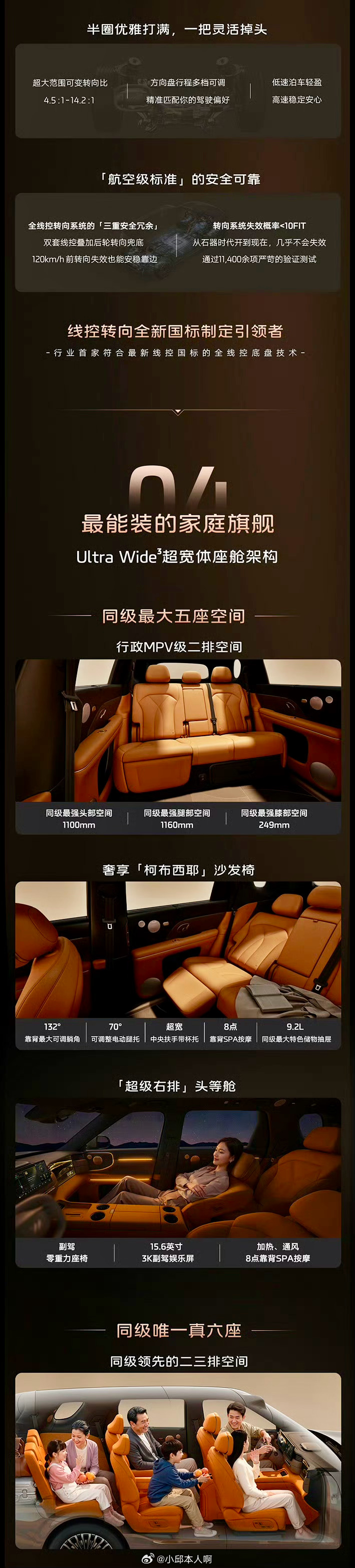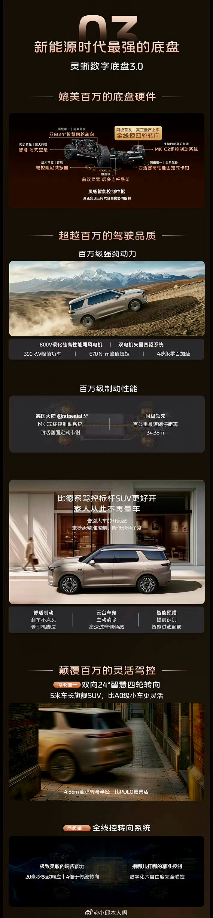 底盘方面,这车配了灵犀底盘3.0,后轮能转向,转弯半径只有4.85米,开起来比较灵活,另外还能选装线控转向。