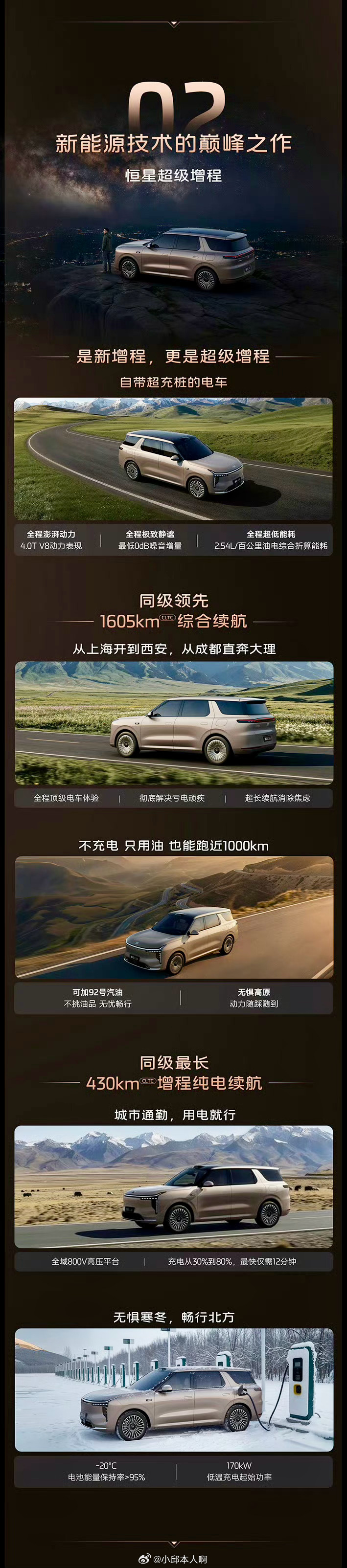 全系都用了“恒星”超级增程系统,加92号油就行。纯电最多能跑430公里,满油满电综合能跑1605公里,还支持800V快充,充电速度挺快的。