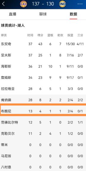 湖人新星布朗尼终于又被重用了!在昨天湖人客场以137:130战胜步行者的比赛中,小将布朗尼再次进入到了球队的轮换阵容里,并且在攻防两端都有不俗的表现。 NBA常规赛继续开打,湖人客场出征,最终以137比130的比分击败步行者,拿下这场胜利。 比起球队整体赢球,不少球迷更关注的是,湖人新星布朗尼终于再次得到教练组重用,顺利进入球队常规轮换,拿到了稳定的出场时间,而且在场上交出的答卷,也对得起这份信任。 这场比赛里,布朗尼以替补身份出战,全场登场13分钟,投篮4投2中,三分线外1次出手没能命中,全场拿到4分,同时还有1篮板1助攻进账,防守端更是拿出了不错的积极性,送出2次抢断和1次盖帽,场上正负值达到+4,能看出他在场时,球队的整体攻防节奏是占优的。 说白了,布朗尼这次能重回轮换,并不是靠名气加持,而是靠训练和赛场表现争取来的。 此前一段时间,他大多只能在垃圾时间获得零星出场机会,甚至一度掉出轮换名单,而教练组也坦言,过去几周布朗尼在队内训练中一直保持着顶尖的状态,是队内表现最好的球员之一,这才让他重新拿到了常规出场的机会。 细看他这场的发挥,没有华丽的数据,也没有高光的连续得分,但胜在务实高效。 进攻端他不贪功,不盲目出手,把握住了有限的出手机会,稳稳命中两分球,做好角色球员该做的无球跑动和接应,不给球队添乱。 防守端才是他立足的关键,脚步跟得紧实,防守态度足够拼,能完成抢断破坏对手进攻,也能送出盖帽护框,用积极的防守弥补了进攻端的不足。 这么说吧,对于年轻球员来说,想要在强队站稳脚跟,最忌讳的就是急于证明自己,反而做好本职工作,守住防守底线,把握好出手机会,才是立足轮换的根本。 布朗尼这场就做到了这一点,不占用球权,专注于自己的职责,用扎实的表现帮球队稳住场上局势,这也是他正负值为正的原因。 眼下湖人正处在冲击季后赛的关键阶段,球队需要即战力,也需要年轻球员随时能站出来补位。 布朗尼这场的表现,刚好证明了他具备进入轮换的能力,能在有限的时间里为球队提供正面帮助,无论是防守端的拼抢,还是进攻端的稳扎稳打,都能给主力球员分担压力。 当然,仅凭一场比赛的发挥,也不能过度拔高,毕竟13分钟的出场时间不算长,后续还需要更多比赛来检验状态。 但不可否认的是,布朗尼用这场比赛的表现,赢得了教练组和球迷的认可,也为自己争取到了更多留在轮换阵容的机会。 对于年轻球员而言,每一次出场机会都格外珍贵,抓住了就能站稳脚跟,抓不住就可能再次被搁置。 布朗尼把握住了这次机会,用务实的表现证明自己值得重用,接下来只要他保持状态,继续做好防守和无球端的工作,大概率能在湖人的轮换阵容中稳住位置,获得更多的出场时间。 以上都是个人观点,对此您有什么不同的看法,可以在评论区留言讨论!!!