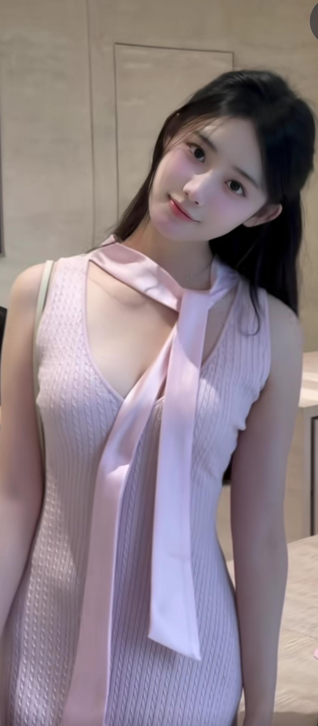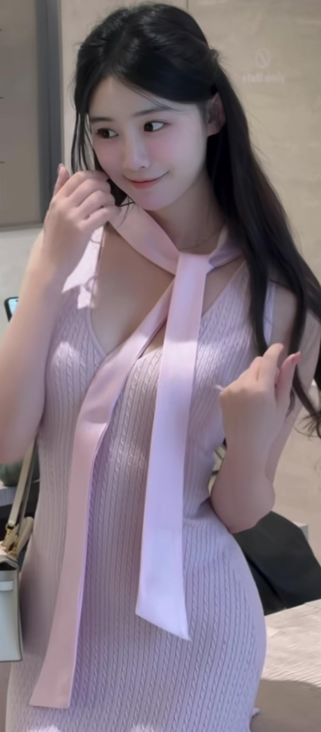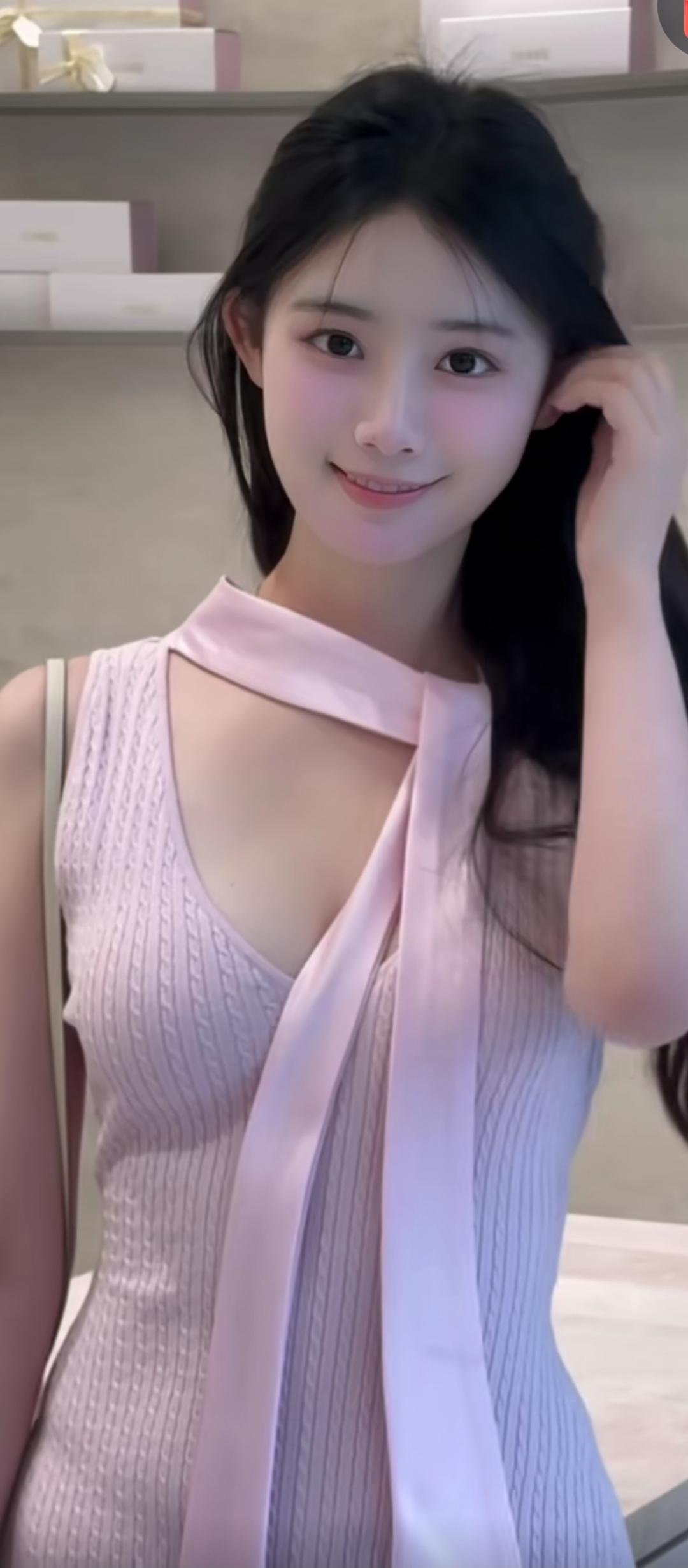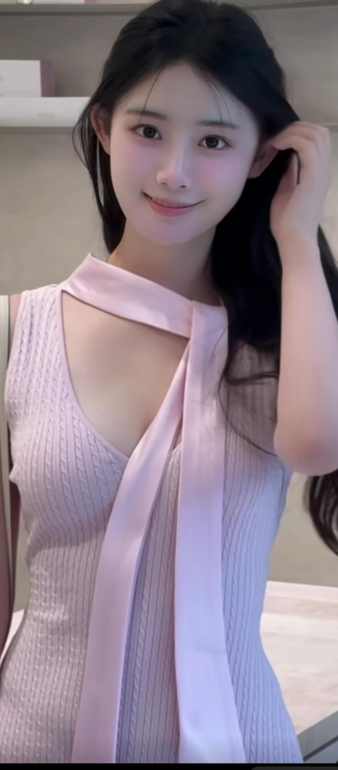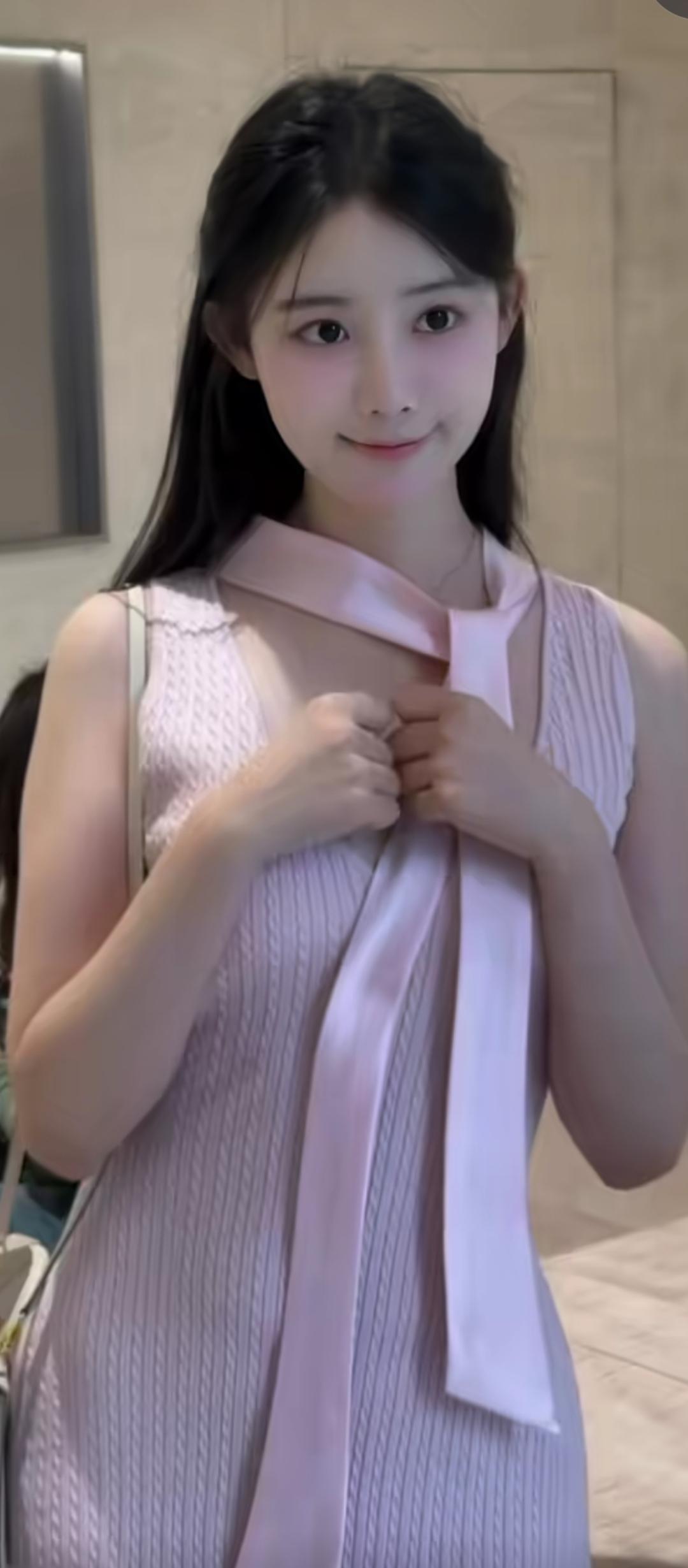 粉衣少女系丝带,柔情似水。