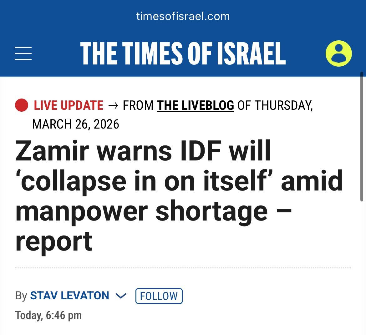 新闻快讯——2026年3月26日,以色列《以色列时报》发布直播报道,扎米尔警告称,受人力短缺影响,以色列国防军或将面临“自我崩溃”的风险,该表态反映出以军当前面临的战备人力危机。