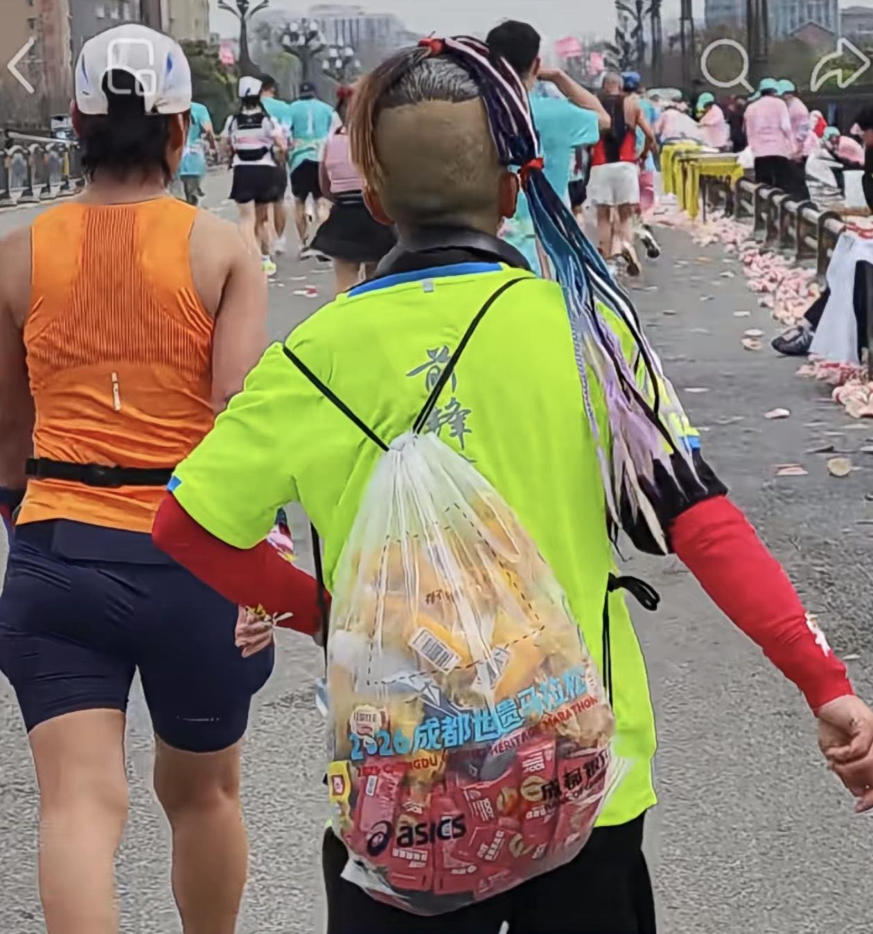 成都世遗马拉松现“进货哥”“劈叉姐”,2026成都世遗马拉松刚落幕,就被这两个选手彻底拉低了下限。一个是把补给当仓库薅的“进货哥”,一个是把赛道当摄影棚的“劈叉姐”。 先看这位“进货哥”:提前备好塑料袋,在补给站疯狂往包里塞能量胶,几十支一打包,背在身上像去赶集进货。正常跑者全程只需要2-5支能量胶,他倒好,直接把后半程选手的补给抢光,有人吐槽“最后几公里只能靠香蕉续命”。 再看这位“劈叉姐”:在赛道核心路段突然停下,当着身后数万跑者的面劈叉摆拍,完全不顾及高速流动的人流,差点绊倒避让不及的选手,把公共赛道变成了自己的网红打卡点。 所幸,这两人还都被组委会重罚了:“进货哥”取消成绩、禁赛2年;“劈叉姐”取消成绩、禁赛1年,省田协还追加了省内禁赛。 马拉松从来不是个人秀场,补给是给所有选手的救命粮,赛道是大家共同的生命线。把公共资源当自家便宜占,把他人安全当自己流量垫脚石,这种行为丢的不仅是自己的脸,更是整个跑圈的脸。 别让自私的人,毁了马拉松最珍贵的“互助与尊重”。 成都世遗马拉松 晒图笔记大赛