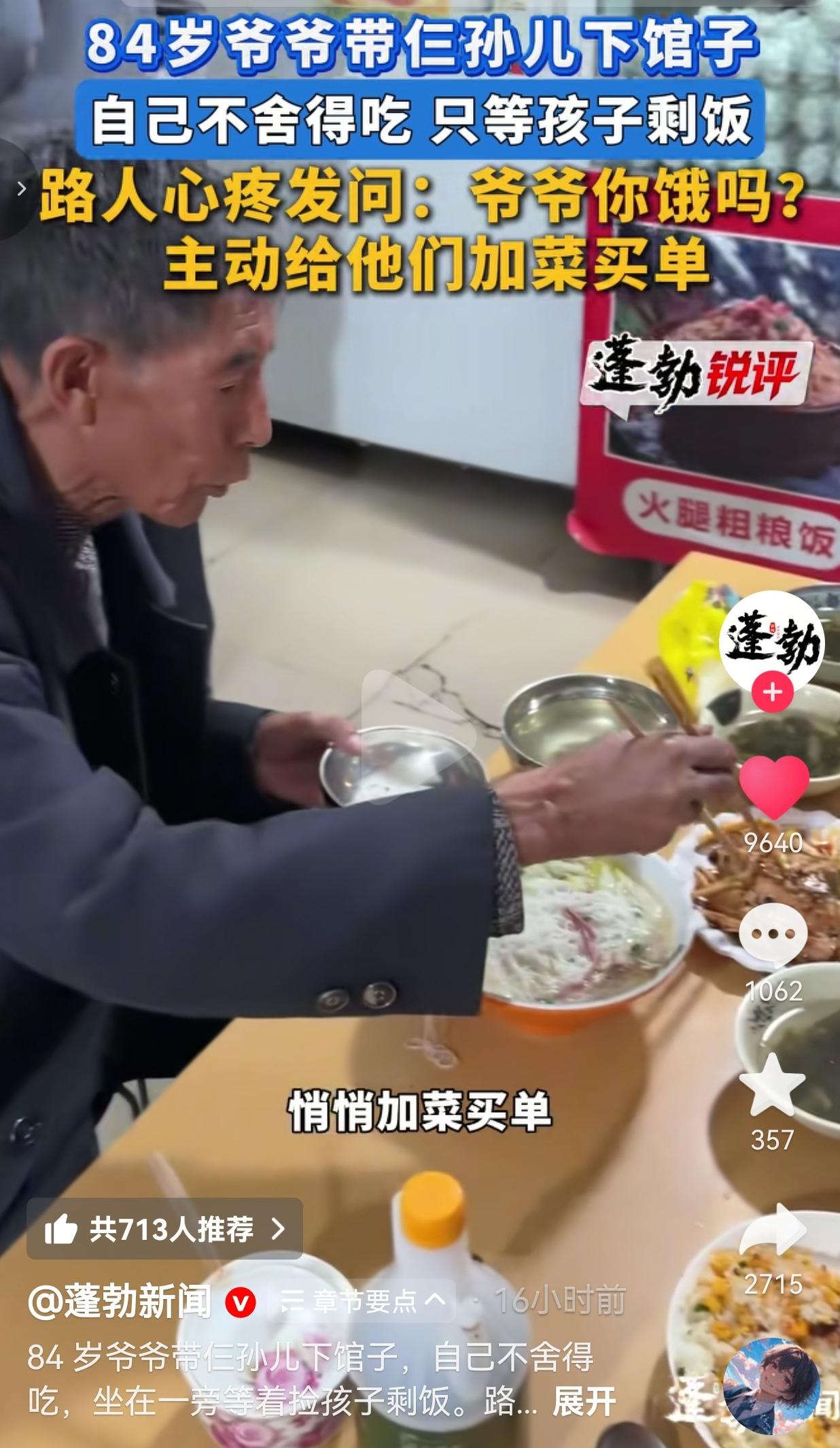 太心酸了!3月24日四川凉山,一家小饭馆里,84岁的爷爷攥着皱巴巴的钱,只给三个孙儿点了蛋炒饭和清汤,自己坐在旁边干等,连筷子都没碰。 那天家里欠费停电,爷爷没法做饭,才咬咬牙带俩孙女一个孙子出来吃顿热的。 三个孩子捧着碗扒拉饭,连掉在桌上的饭粒都一粒粒捡起来吃,懂事得让人心疼。 爷爷就坐在旁边凳子上,佝偻着背,眼睛发炎发红也舍不得买药,枯瘦的手攥着衣角,眼睛死死盯着孙儿们的碗,就等他们吃饱了,捡桌上掉的饭粒、碗里剩的底儿。 路过的小伙子看傻了,凑过去问:“爷爷,你饿不饿?我给你点一份!” 爷爷摆摆手,嘴硬说“我不饿,等娃吃剩的就行”,可那声音都在发颤,眼睛里的光都在抖。 小伙子当场红了眼,直接喊老板:“加菜!这桌我买单!再给爷爷来碗热乎的米线!” 他还转头问孩子们:“你们要不要果汁?”可俩孙女懂事地摇摇头,连额外的饮料都不敢要——他们知道爷爷不容易,不想再添负担。 旁边吃饭的人都看哭了,有人掏出手机想给孩子塞钱,被爷爷婉拒了——他说“娃们爸妈在外打工,我能扛,不能欠人情”,哪怕自己饿到肚子叫,也不肯接受半点施舍。 网友看到后评论说:“看得我眼泪哗哗流!我爷爷以前也这样,有好吃的全塞我嘴里,自己啃干馍馍!这不是抠,是刻在骨子里的疼娃!” 也有的网友说:“破防了!想起我爸,每次带我下馆子,他都说“我不爱吃这个”,转头就把我剩的面汤喝干净!老一辈的爱,全藏在“我不饿”里!” 还有的网友说:“三个娃也懂事!没抢饭没闹着要零食,掉桌上的饭都捡起来吃,知道爷爷不容易!穷人家的孩子早当家,这话一点不假!” 也有的网友说:“必须给这个小伙子点赞!不是钱多钱少的事,是这份心软!换我我也得冲上去买单!这才是中国人的人情味!” 我看完视频,鼻子酸得直抽抽。 有人说爷爷“抠”,说他“不会享福”,可谁懂啊?这哪是抠,是把自己的命都掰碎了,往孙儿嘴里塞啊! 84岁啊!本该是晒晒太阳、含饴弄孙的年纪,却要因为家里停电,带着三个娃出来蹭一口热饭,自己连碗白米饭都舍不得点!眼睛发炎都忍着不买药,把每一分钱都省下来给孙儿们填肚子! 那些说“子女在外打工不容易”的,我真的不赞成,再不容易,能有84岁老爹带着娃等剩饭不容易?能有孩子看着爷爷饿肚子,不敢多夹一口饭不容易?能有老人明明饿到发慌,还嘴硬说“我不饿”不容易? 这不是“隔代亲”,这是用命在托举下一代!是中国老人最让人心碎的“牺牲式”疼爱——他们把所有苦都咽进肚子里,把所有暖都捧到孙辈面前。 我们总说“要孝顺”,可多少人把“孝顺”挂在嘴边,却让年迈的父母在饭馆里等剩饭? 我们总说“要给孩子最好的”,可多少孩子的“最好”,是用爷爷的“我不饿”、“我能扛”堆出来的? 我们总说“在外打工身不由己”,可“身不由己”从来不是丢下老人和孩子的借口! 这个小伙子的悄悄加菜、默默买单,不是施舍,是给我们所有人上了一课:别让老人的“我不饿”,变成我们这辈子最后悔的“我忘了”;别让孩子的懂事,变成压垮老人的最后一根稻草。 世上最疼的不是饿肚子,是有人把饭全给了你,自己却在等剩饭;世上最暖的不是山珍海味,是陌生人愿意为你的心疼,买一次单;世上最该醒的,是别让“在外打工”四个字,遮住了本该扛在肩上的责任! 对此,你怎么看?