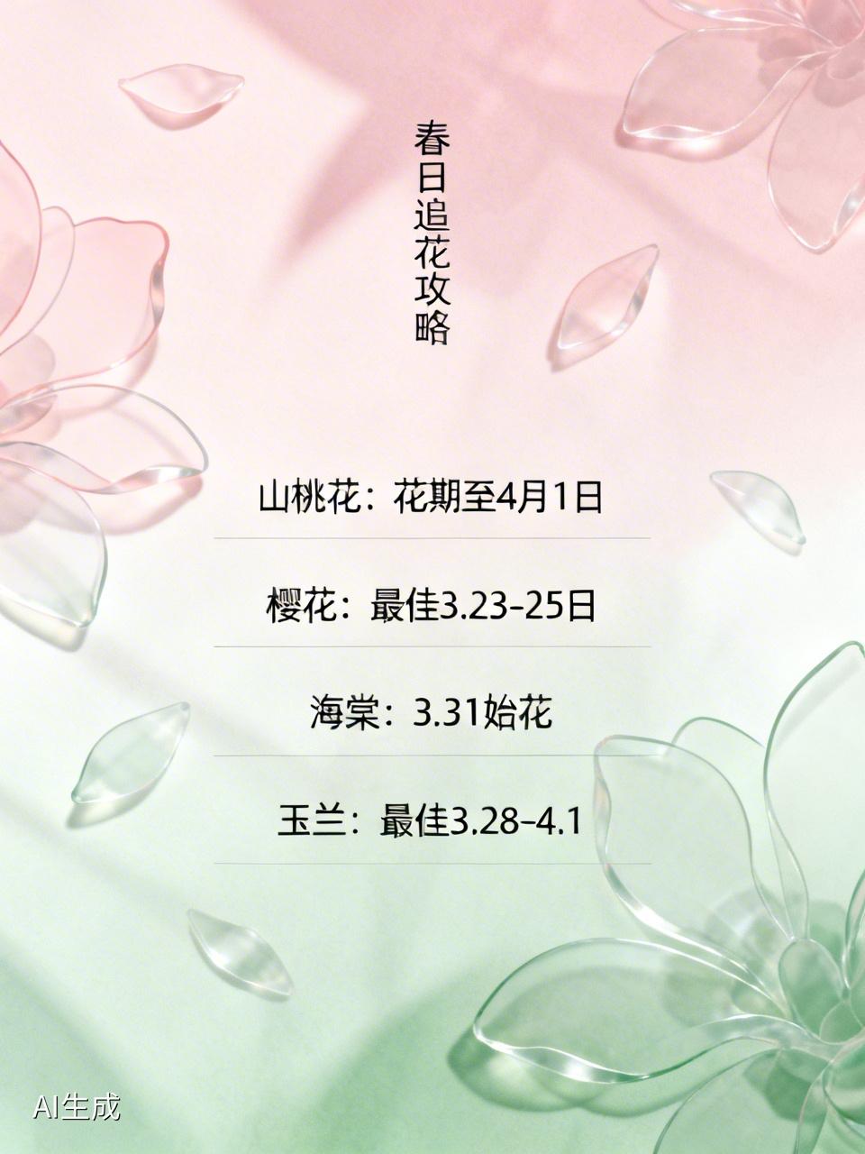 3月27号,正是春日追花的好时候!就拿武清来说,今年三月气温偏高、光照足,各类花卉花期提前。山桃花盛花期已过,但还能赶上尾巴,其花期持续20天左右。樱花盛花期在3月24日左右,现在去看也正合适,最佳观赏时间是3月23 - 25日。海棠花3月31日左右始花,再等等就能赏。玉兰花始花期3月25日左右,盛花期3月30日左右,这几天去看也不错,最佳观赏在3月28 - 4月1日。武清的朋友不用跑远,家门口就能打卡绝美花海,赶紧行动起来!