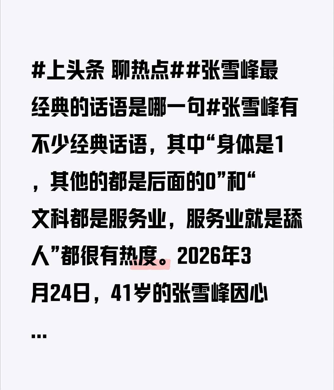 2026年3月24日,41岁的张雪峰因心源性猝死离世,“身体是1,其他都是0”这句话成了他用生命写下的沉痛警句。其实2023年他就因过度劳累被强制住院,出院后又投入高强度工作。更早之前他还曾发文提及怕猝死,没想到一语成谶。 而“文科都是服务业,服务业就是舔人”也引发诸多讨论。有人觉得太绝对,但也有人认为揭示了文科就业现实。像市场营销、酒店管理等文科专业,确实注重服务他人。不得不说,张雪峰的话总能直戳要害。