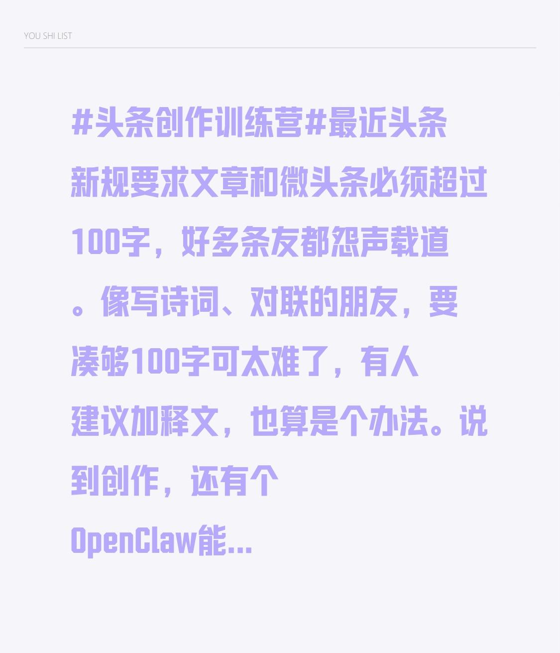 最近头条新规要求文章和微头条必须超过100字,好多条友都怨声载道。像写诗词、对联的朋友,要凑够100字可太难了,有人建议加释文,也算是个办法。 说到创作,还有个OpenClaw能实现自动发布今日头条微头条。有零代码浏览器自动化方案,对新手友好,不用写代码;还有技能包专业方案,适合批量运营。这俩方案都通过了2026年最新版本实测。使用前得完成OpenClaw部署,有实名认证且无违规记录的头条号,安装Chrome/Edge浏览器,还得安装OpenClaw浏览器扩展实现会话持久化。新规加上这些操作,创作和发布都更有挑战了。