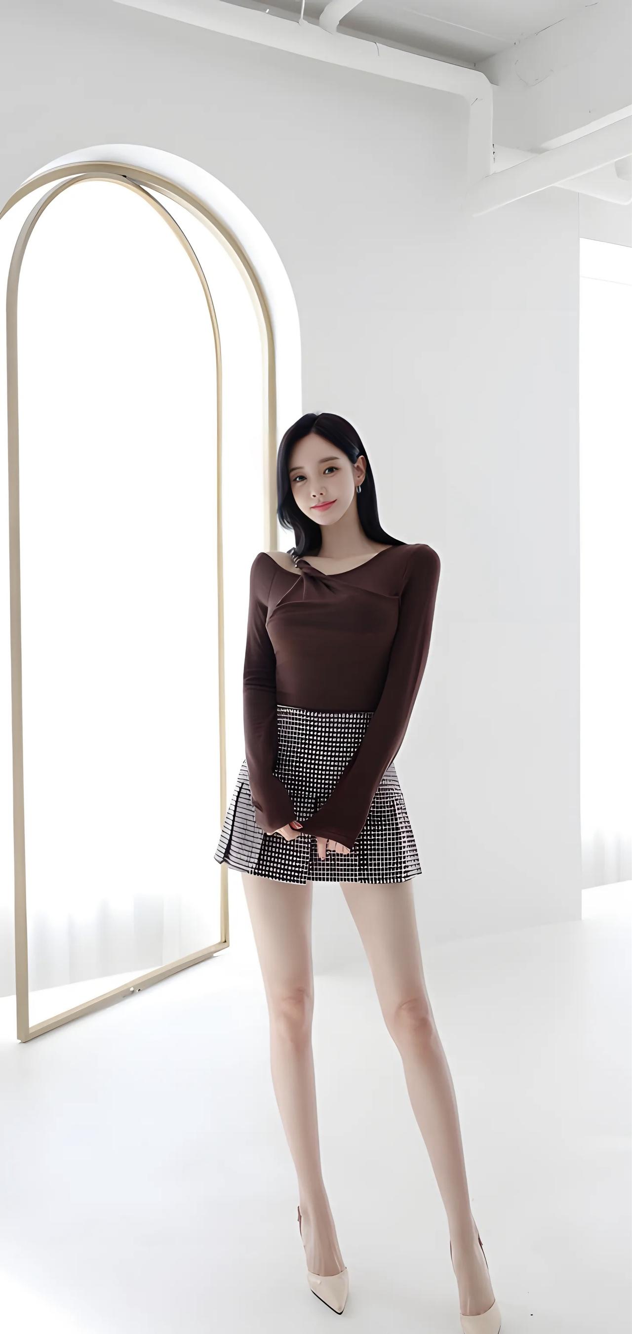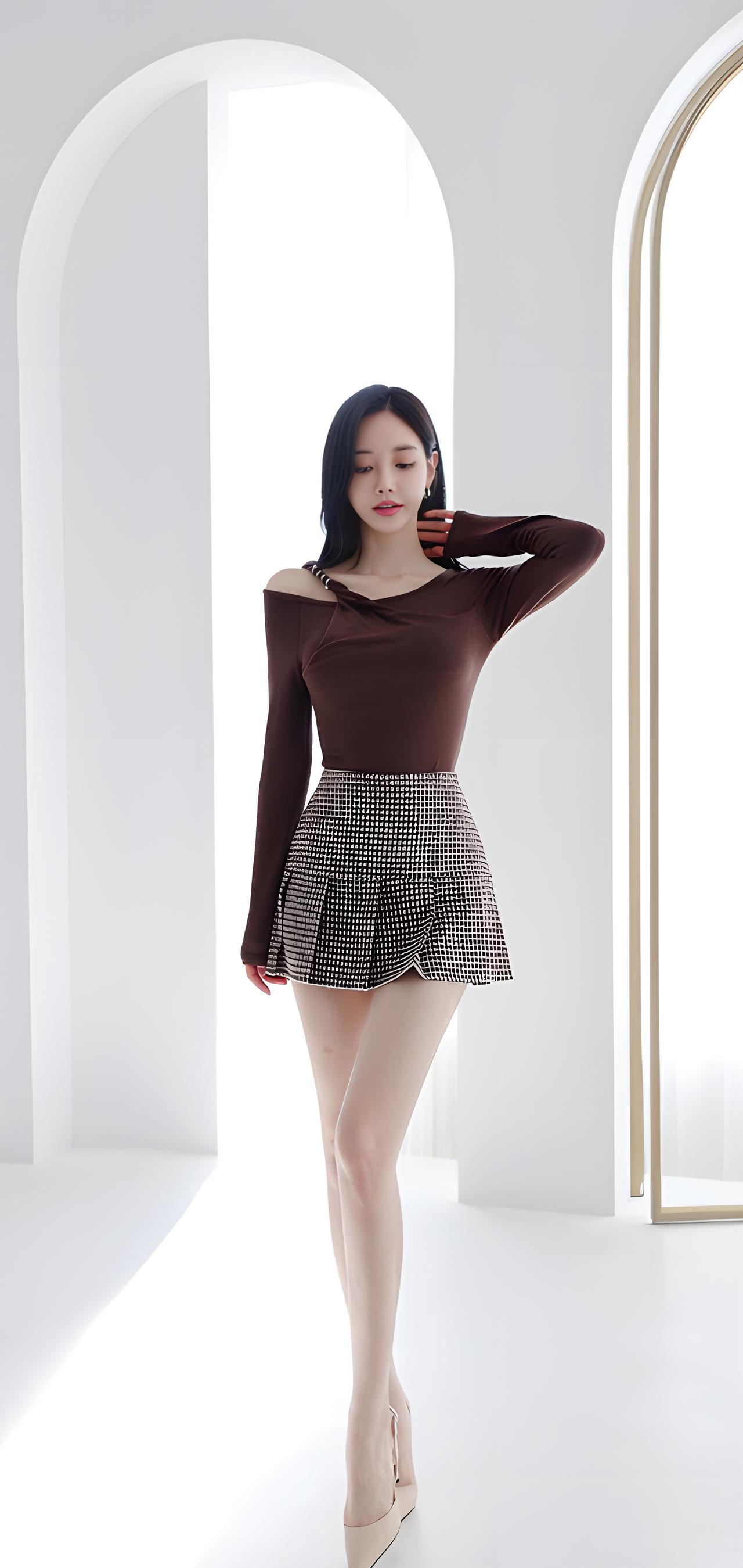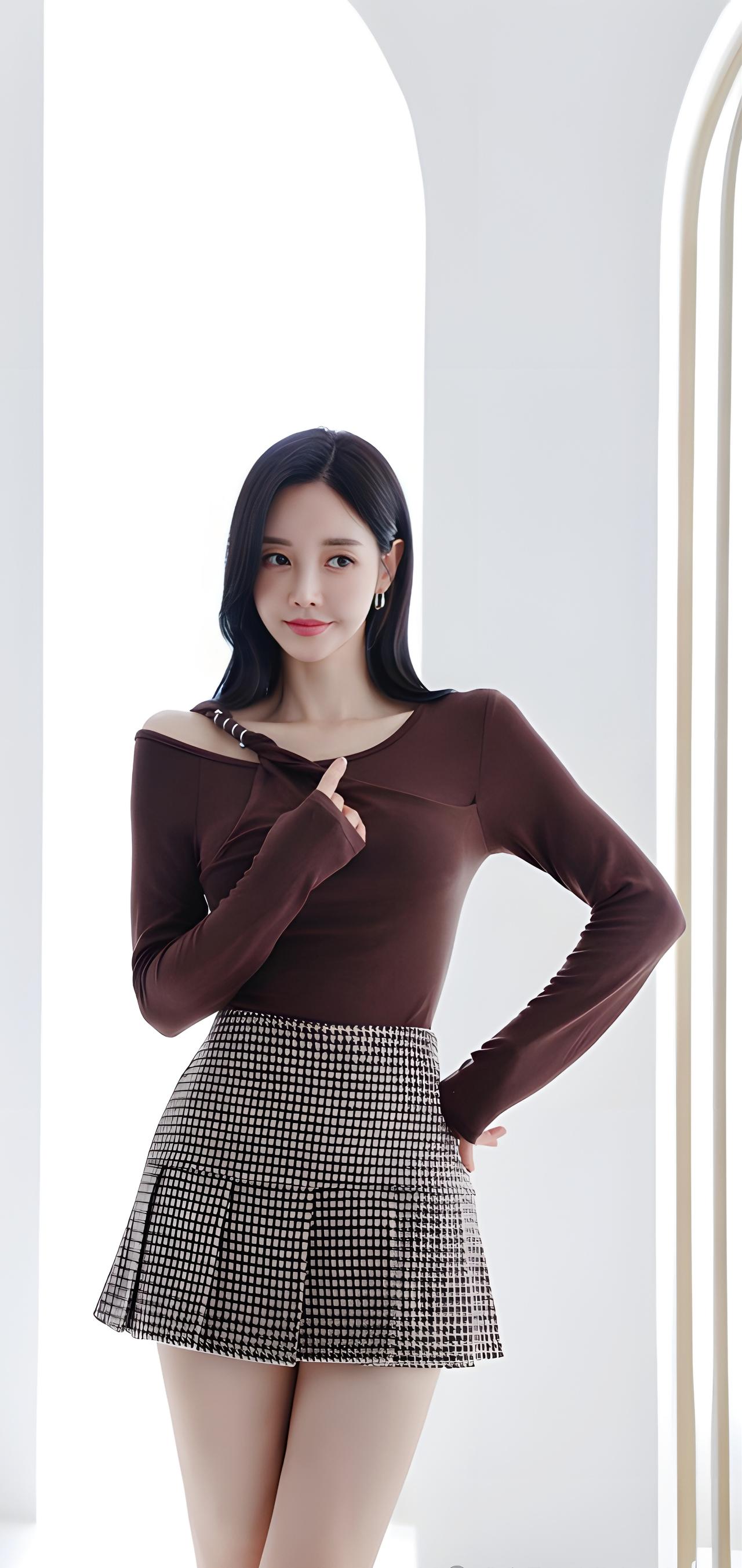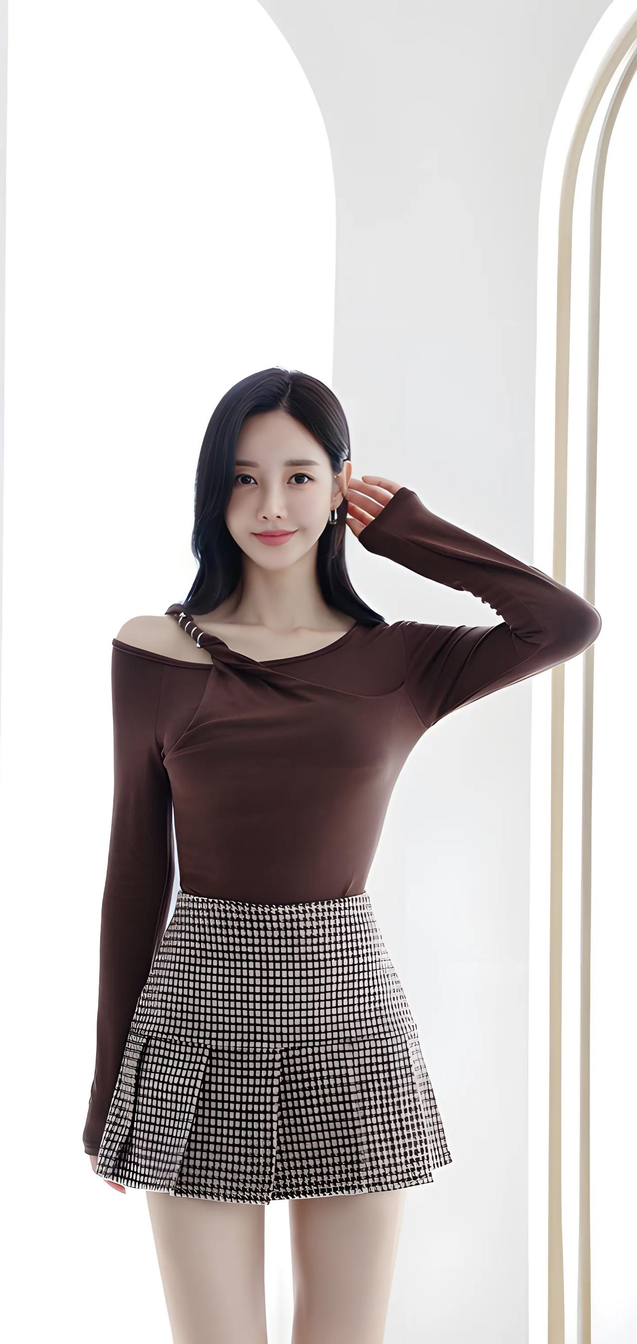 优雅气质穿搭,黑白格纹短裙搭配棕色上衣,完美展现时尚感!
