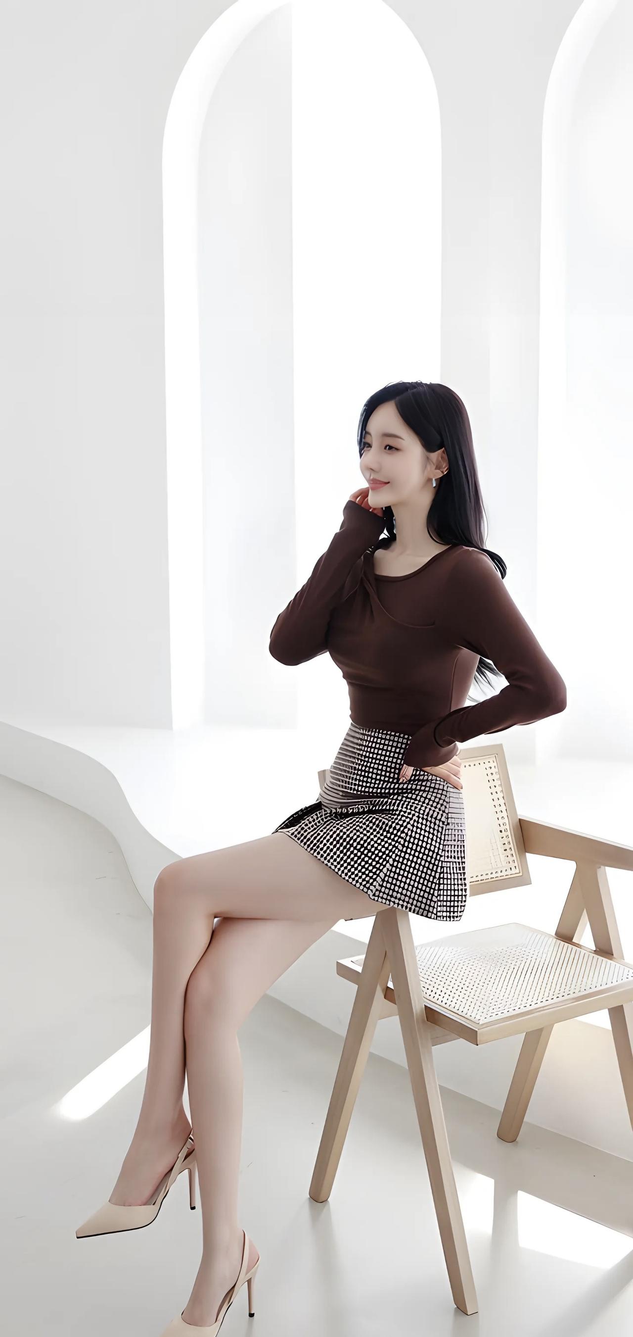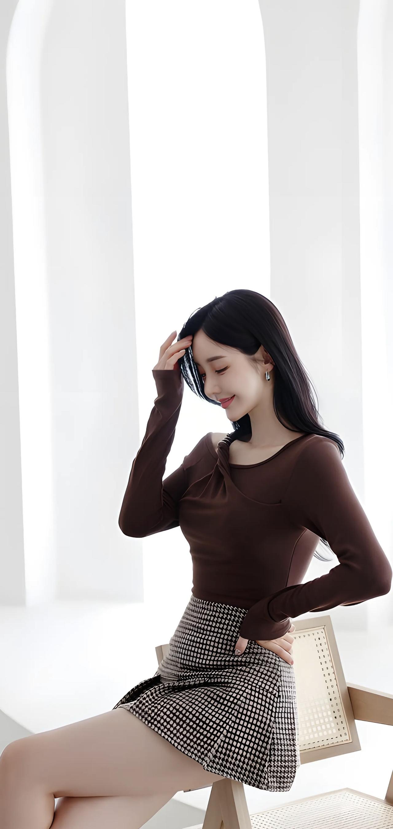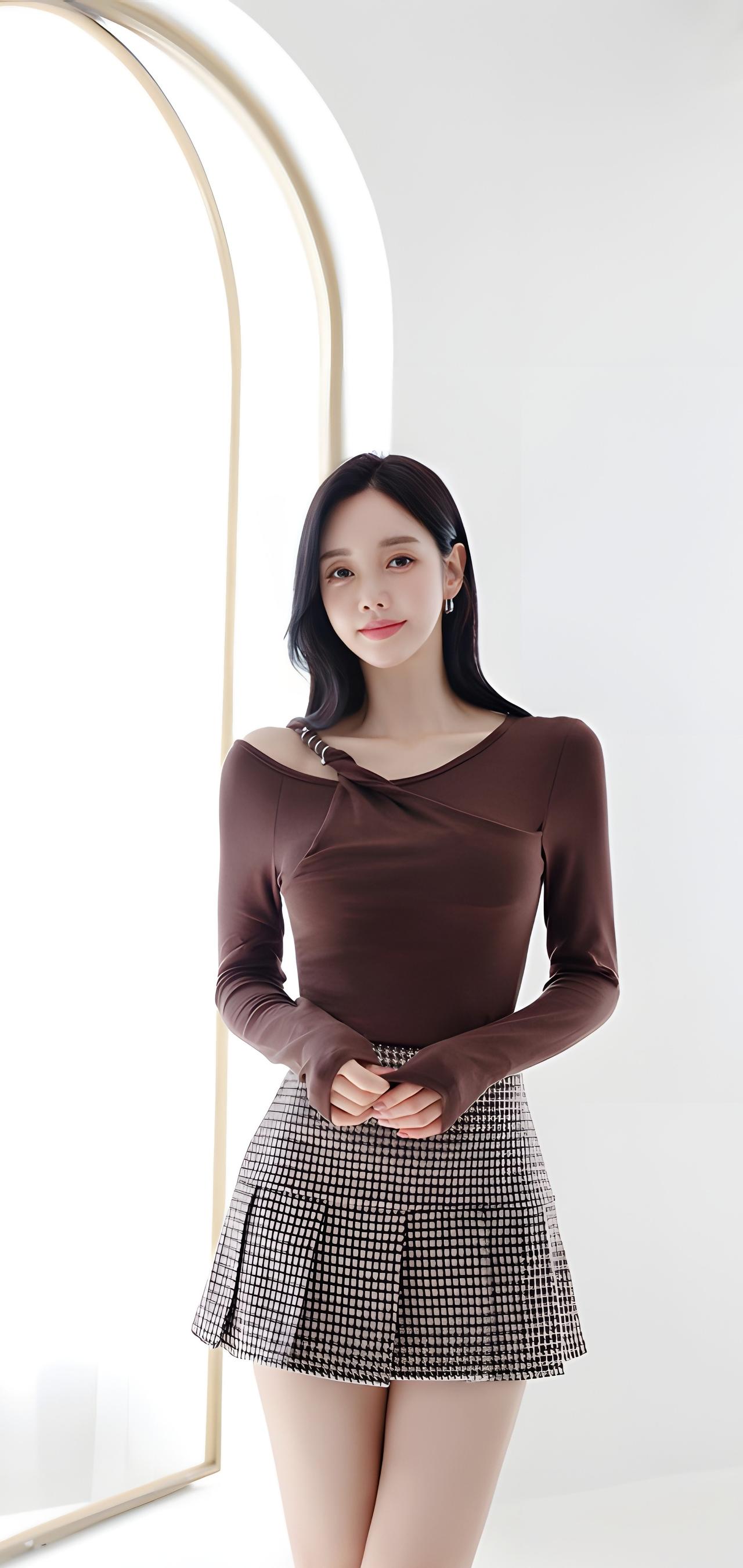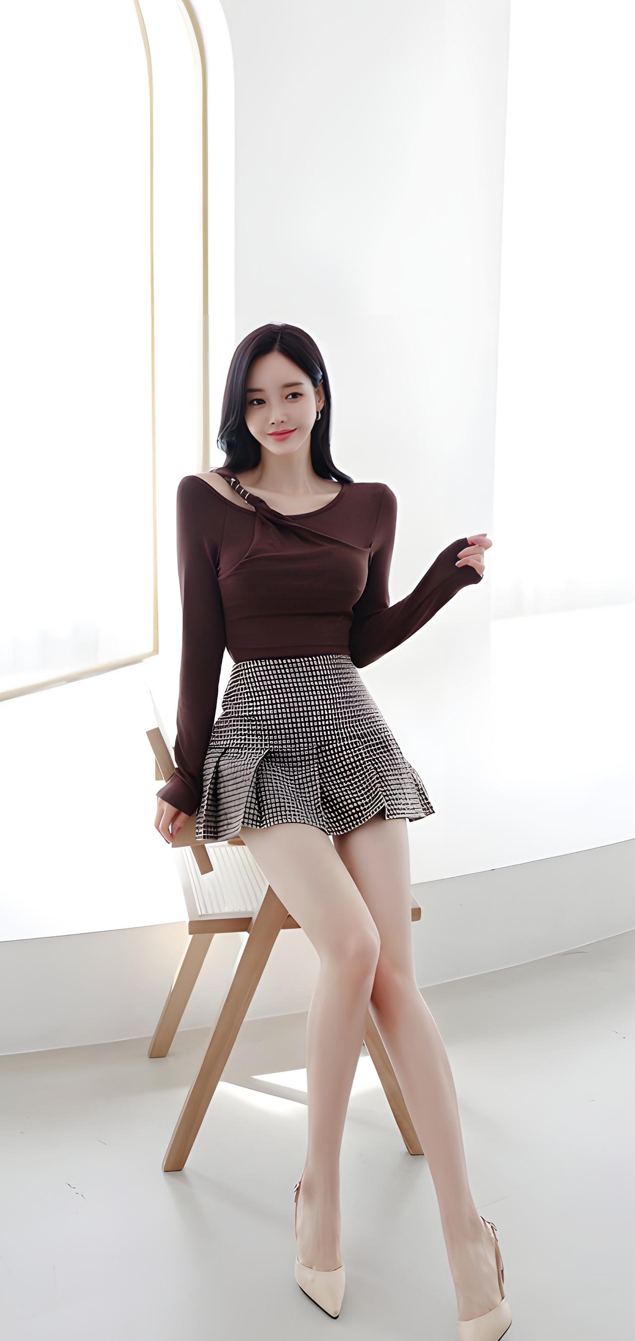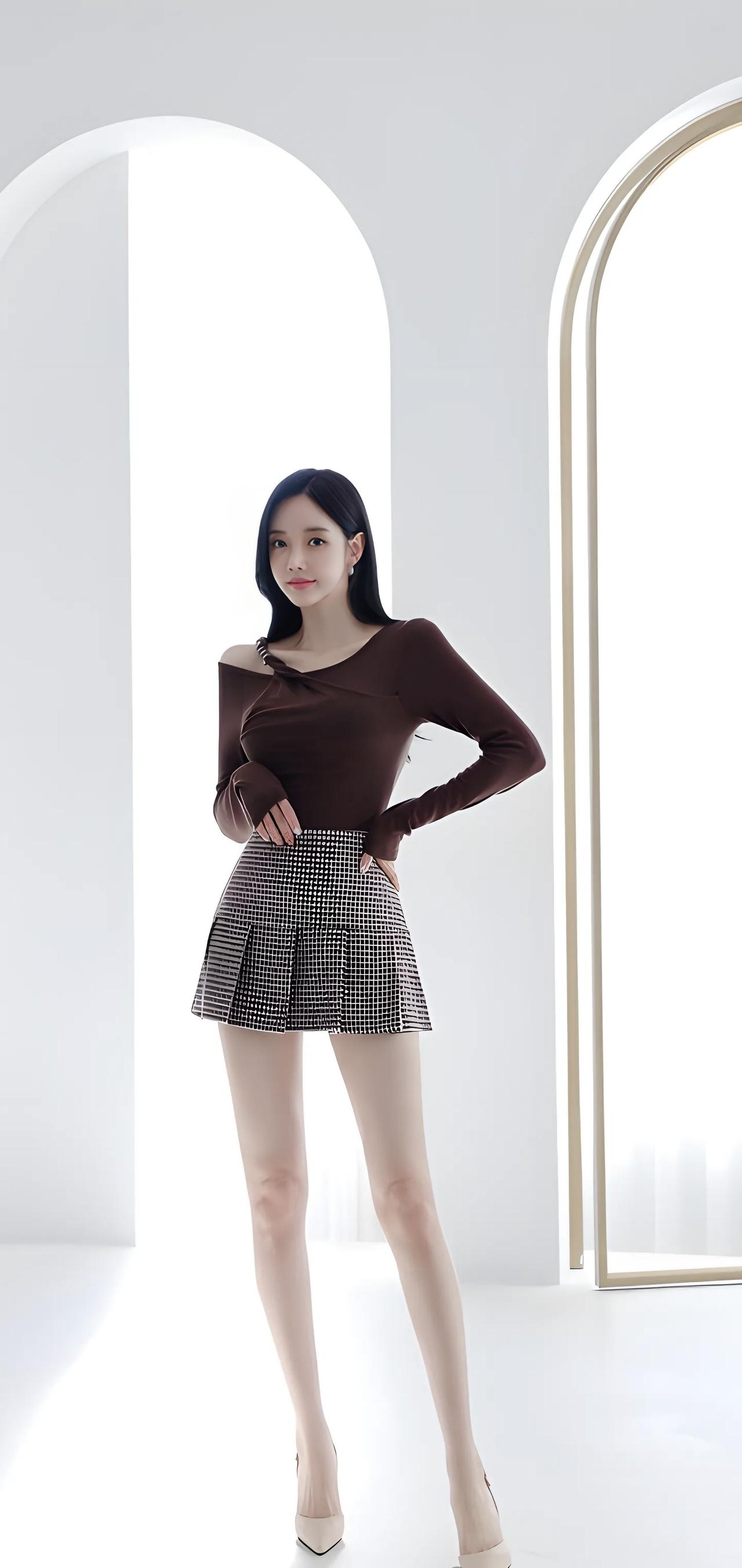 优雅气质穿搭,黑白格纹短裙搭配棕色上衣,完美展现时尚感!