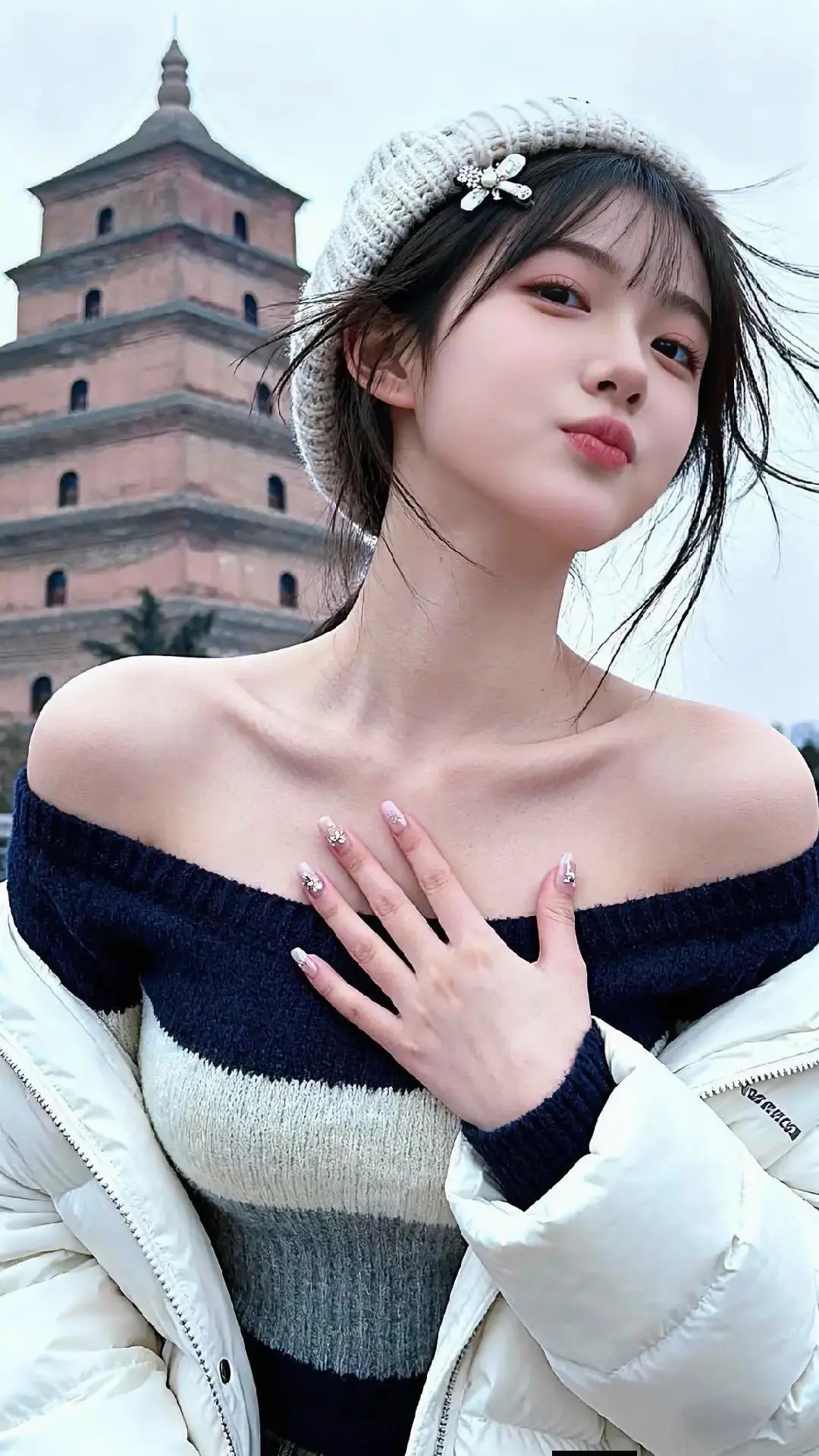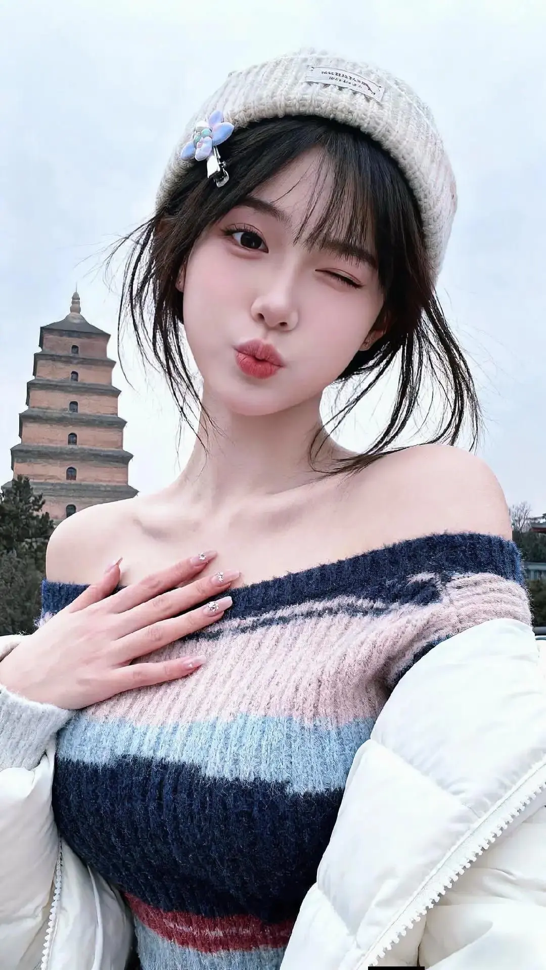 大雁塔下的甜妹,风也温柔。韩系甜妹 OOTD 纯欲风 露肩毛衣 甜妹穿搭 把温柔穿在身上,和古城合个影。喜欢这种甜妹穿搭吗?