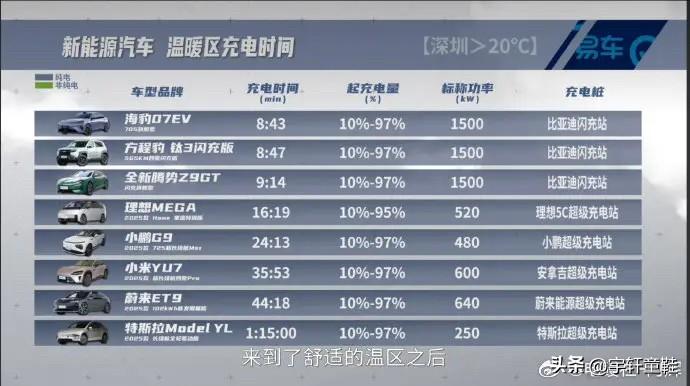 如果比亚迪自己的测试不算的话,那第三方媒体平台的测试,应该算得了数吧?因为这个是真的没法作假呀!桩是用的闪充桩,车是用的闪充车,官方数据摆在那里,离发布会已经过去了21天,但5分钟充好,9分钟充饱还在循环播放! 来自易车的新能源汽车充电时间测试,严寒区混动车型:仰望u7 2026款,17%-97%充电时间10分5秒,比亚迪大唐,19%-97%充电时间10分48秒; 常温区纯电车型:比亚迪海狮07EV,10%-97%充电时间8分43秒,方程豹钛3,10%-97%充电时间8分47秒,腾势Z9GT,10%-97%充电时间9分14秒! 这个成绩再对友商车型的成绩,应该可以用“吊打”来形容了!大家服还是不服?[呲牙]