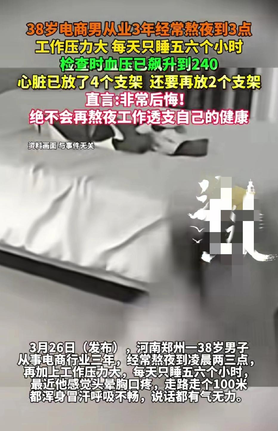 近日河南郑州,一38岁男子干了三年电商,平常工作压力大,每天熬夜到凌晨3点,心脏放了4个支架,现在非常后悔! 男子表示自己做电商的,每天工作压力很大,经常要熬夜到凌晨两三点,每天就睡了五六个小时,现在走路100米都喘不过来气了,身体已经出现大问题了。现在很后悔自己当初透支健康的工作,以后再也不熬夜工作了! 现在的日常生活节奏比较快,工作熬夜到凌晨的事常有发生,但是工作再忙也得注意自己的作息时间,透支健康的工作最后只会得不偿失!