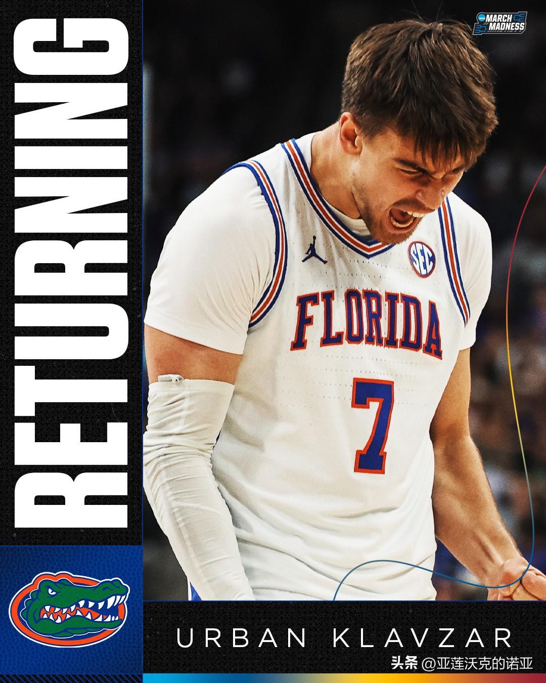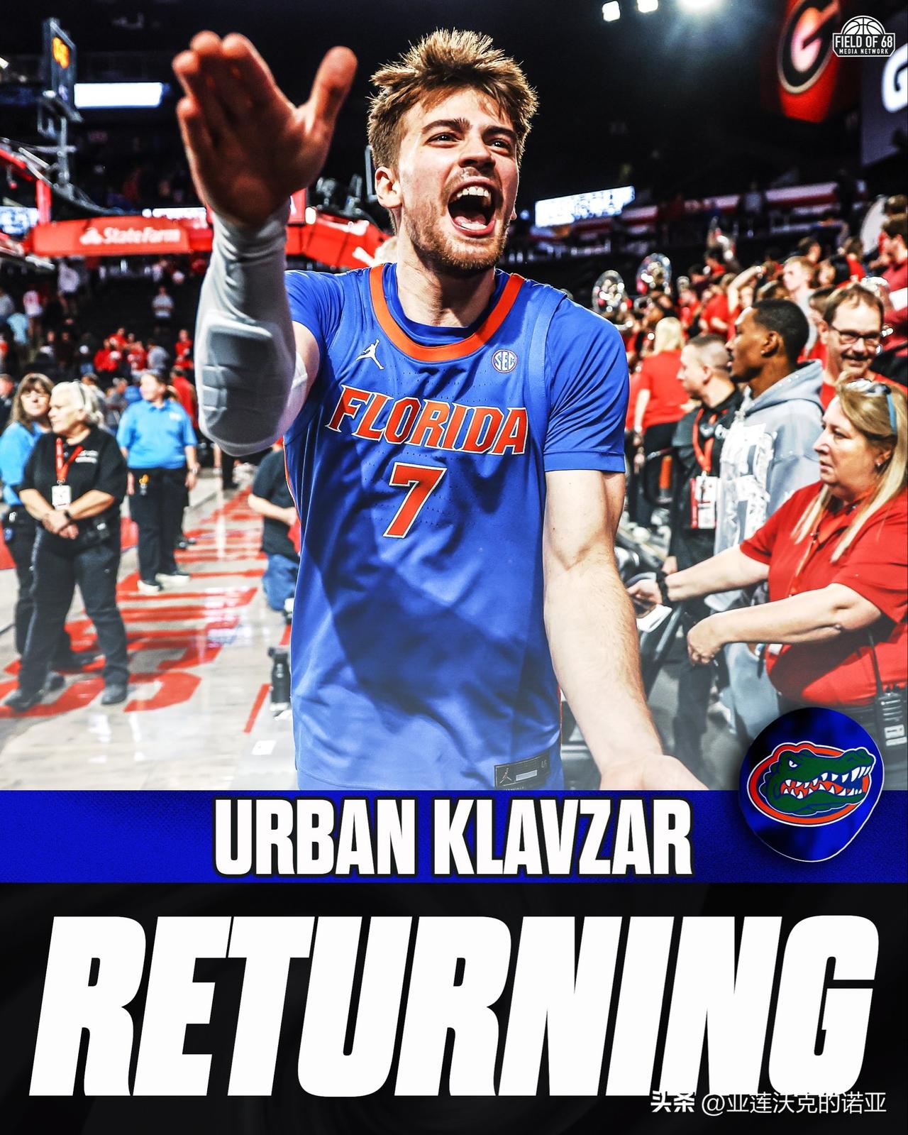 佛罗里达控卫Boogie Fland宣布留校继续征战,身高6-3=191,大二赛季场均得到11.6分,可能暗示主帅Todd Golden仍然致力于鳄鱼,保留一位熟悉体系的控球手,斯洛文尼亚射手Urban Klavzar也将留校,本赛季荣获SEC联盟年度最佳第六人,场均得到9.6分,三分球命中率40.6%。