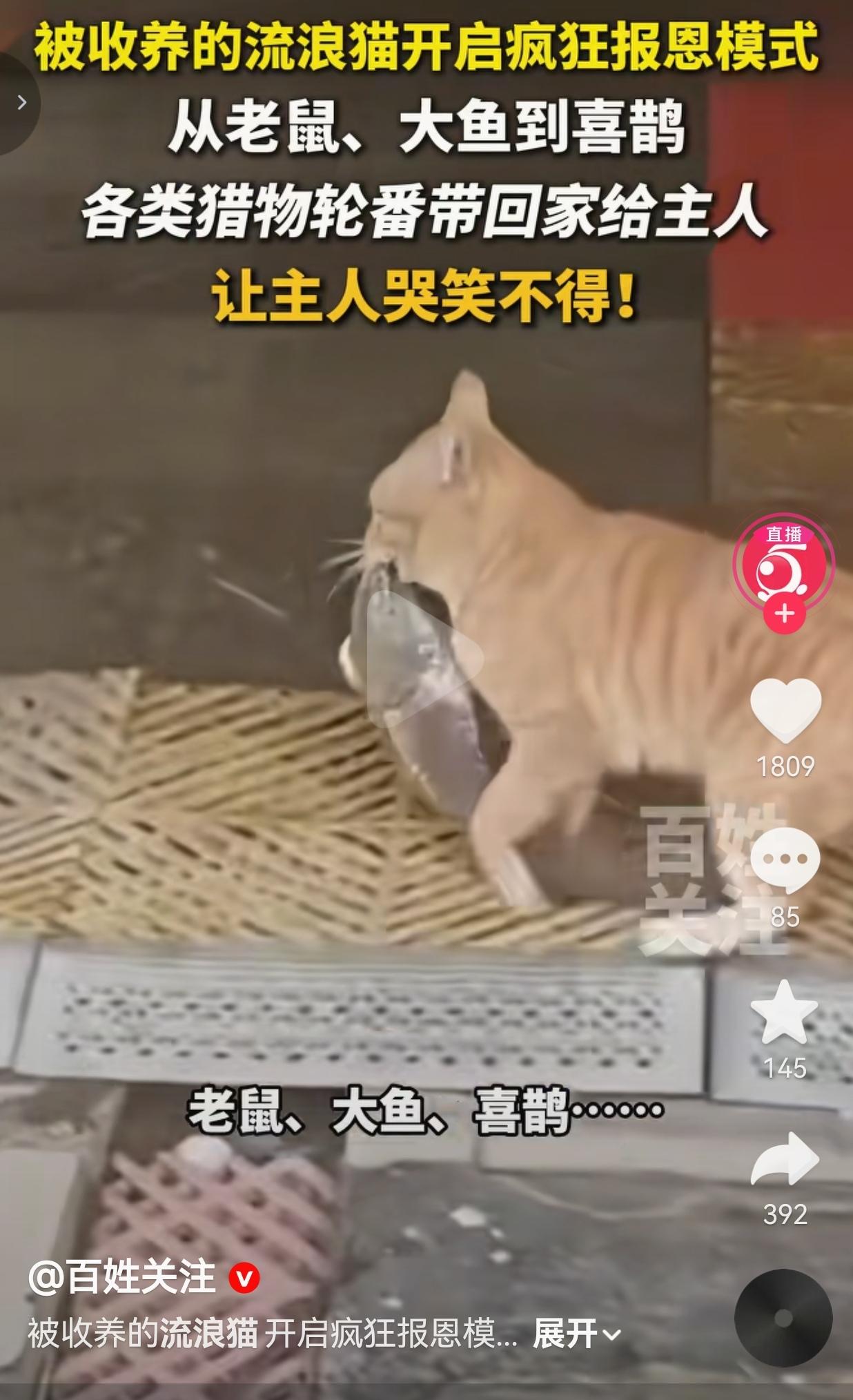 太知道知恩图报了吧!收养的流浪橘猫开启“报恩狂魔”模式,天上飞的地上跑的全往家叼,我现在看见它叼东西就想跑! 山东一位网友去年捡了只流浪橘猫,本来以为是捡了个小宝贝,结果这猫是把自己当成了狩猎队长了! 从最开始的小老鼠,到后来巴掌大的活鱼,再到连喜鹊都给你叼回家,这猫简直是把整个小区的生态链都给端了! 每天一开门,不是看见猫嘴里叼着扑腾的鱼,就是脚边躺着半凉的老鼠,甚至还有一次叼着只受伤的喜鹊往主人怀里塞,那眼神仿佛在说:“铲屎的,快夸我厉害!” 主人现在是哭笑不得:“心意我领了,但这顿‘山珍海味’我是真不敢下嘴啊!” 网友看到后评论说:“哈哈哈哈我家猫也这样!上次叼了只蝙蝠放我枕头边,我直接连夜收拾行李想离家出走!” 也有的网友说:“这猫是想把你养成山大王啊!老鼠下酒,喜鹊炖汤,大鱼红烧,这菜单都给你列好了!” 还有的网友说:“流浪猫的报恩太实在了!它觉得最好的东西都要给你,就是这“礼物”有点费主人!” 也有的网友说:“换我直接崩溃!早上起来看见脚边躺只死老鼠,谁能顶得住啊!这猫是想吓死我继承我的罐头吗?” 我真的要笑疯了!这橘猫哪里是在报恩,这是在给主人开“野外生存课”啊! 它哪里懂人类的恐惧,只知道“我吃过的最好的东西,都要给我的铲屎官”,这份赤诚又笨拙的爱,真的又气又暖! 但说实话,换谁谁不崩溃?早上一睁眼脚边是死老鼠,下班回家门口是活鱼,连喜鹊都给你叼回家,这哪是家,这是小型动物园! 可你又骂不出口,毕竟它是曾经流浪的小可怜,现在把你当成全世界,把自己能拿到的所有“宝贝”都捧到你面前,这份纯粹的爱,比任何礼物都珍贵! 其实流浪猫的报恩从来都不是什么山珍海味,而是它把你当成了唯一的依靠,把自己世界里最好的东西都给你。 它不懂人类的审美,不懂什么是干净,只知道“我要对你好”,这份笨拙又热烈的爱,才是最打动人的地方。 对此,你怎么看?