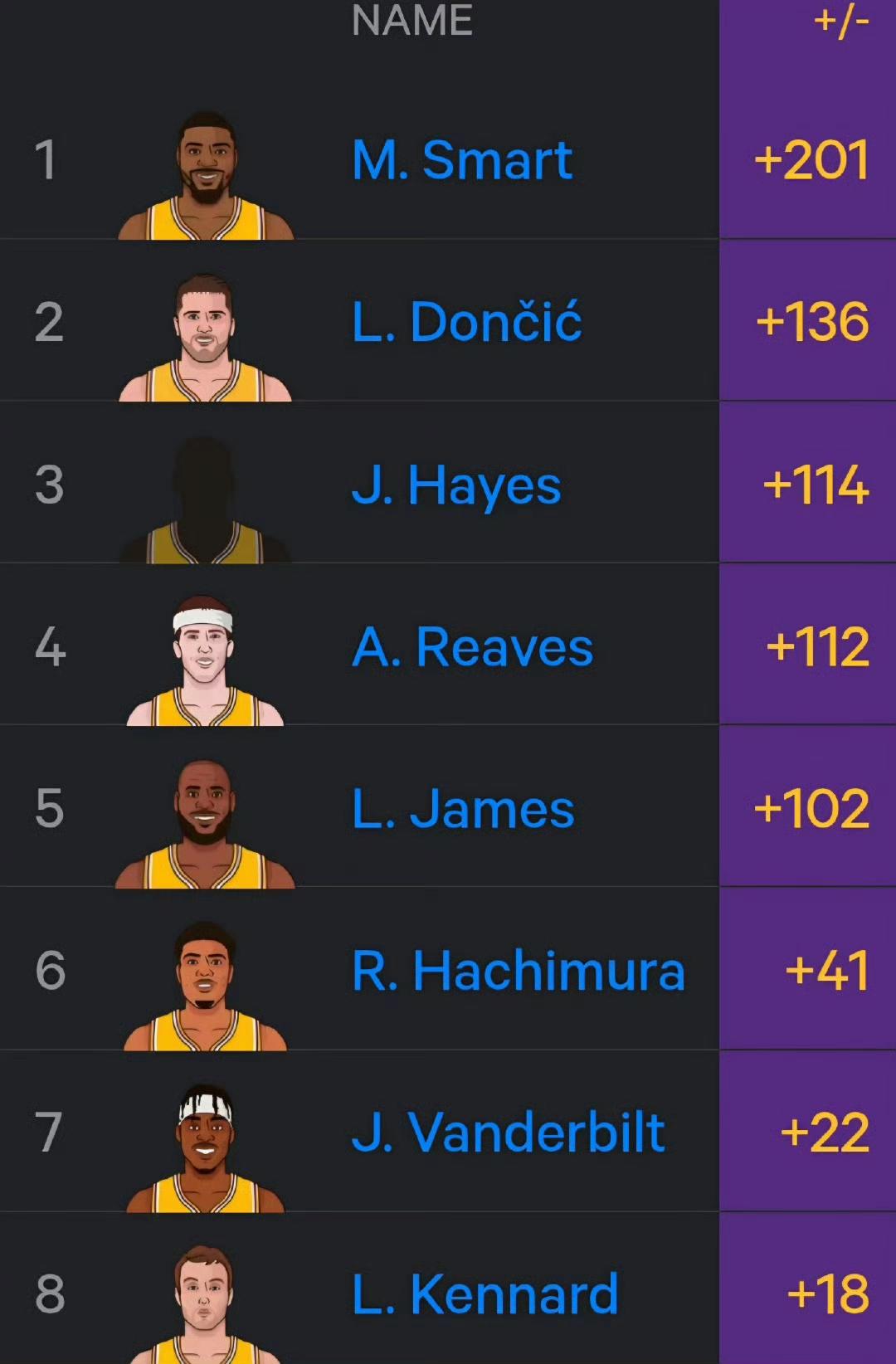 今年湖人队内正负值排名,詹姆斯还可以呀。 斯玛特+201,队内最高。 东契奇+136,也不是毒瘤。 詹姆斯+102很有用,里夫斯也很高。 全队大多数都高,湖人成绩也好。[大金牙]