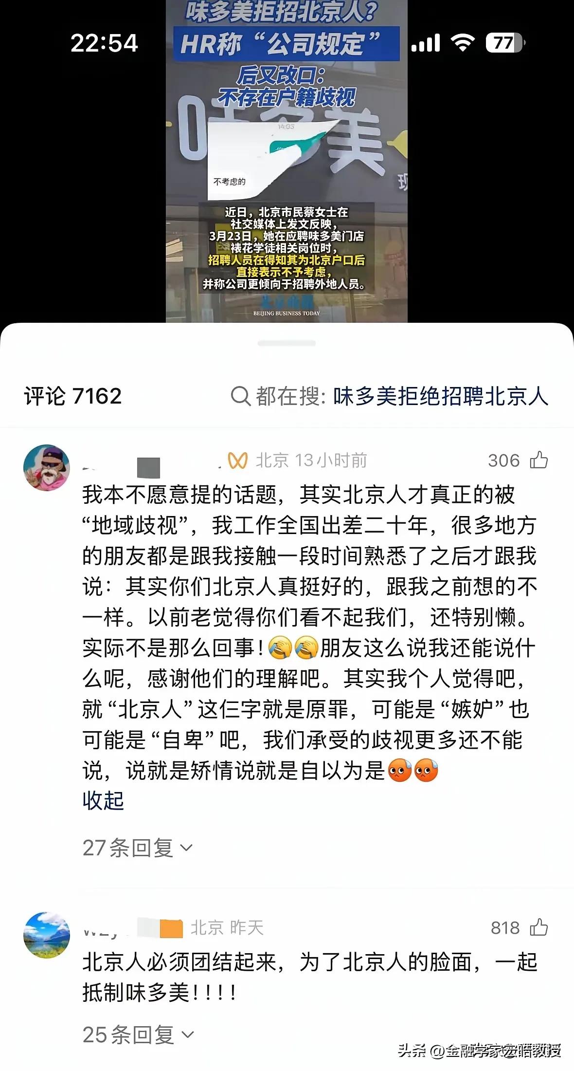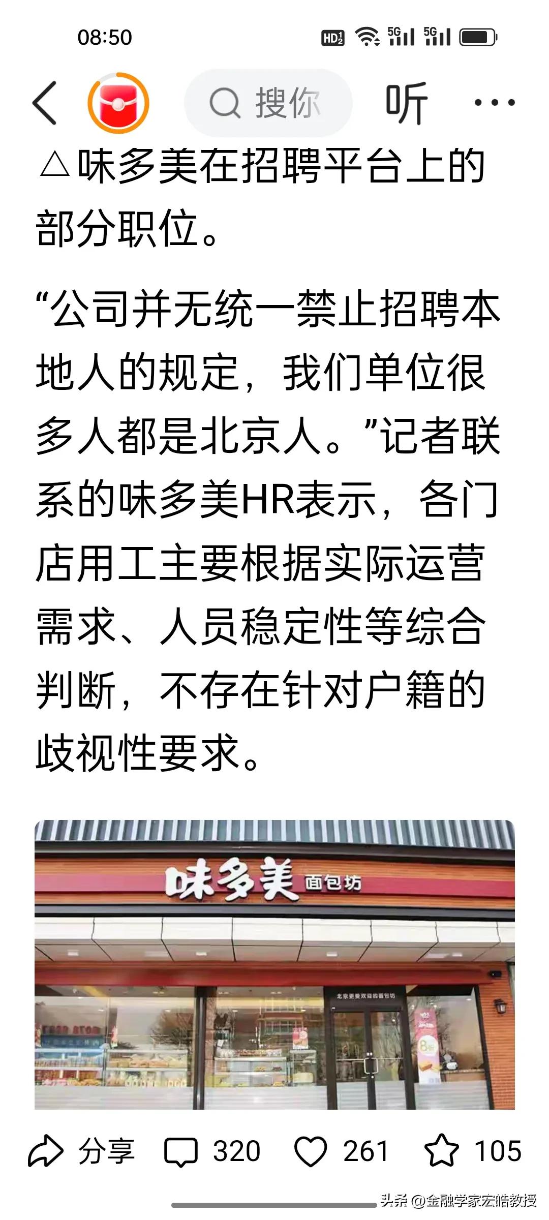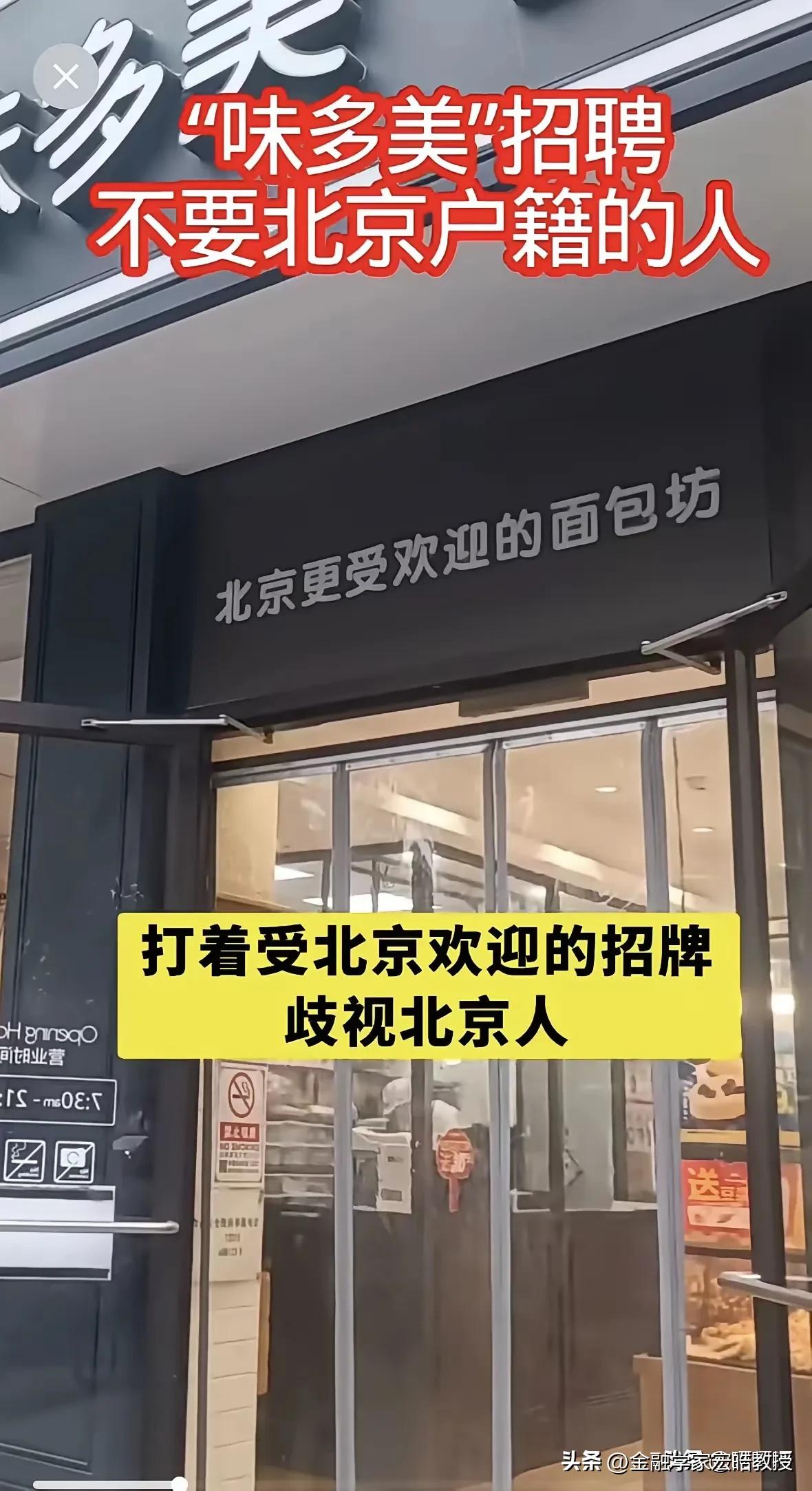 户籍歧视寒心!深耕北京30年的本土烘焙品牌味多美拒招北京人,成本优先还是规则失守? 味多美被曝拒招北京户籍求职者,HR直言“公司规定”,潇湘晨报记者暗访与网友爆料均证实这一隐性门槛,这也太让人意外了。 作为北京本土品牌,此举让消费者与求职者心寒。企业以“稳定性”为由偏好外地员工,实则是算清了社保、住宿与管理成本账——外地员工更能接受倒班、按最低基数参保,用工成本更低。 2024年味多美员工1166人,参保人数一致,却用户籍筛选员工,违背公平就业原则。这种“成本优先”的用工逻辑,暴露了企业社会责任的缺失,也让本土品牌口碑大打折扣。