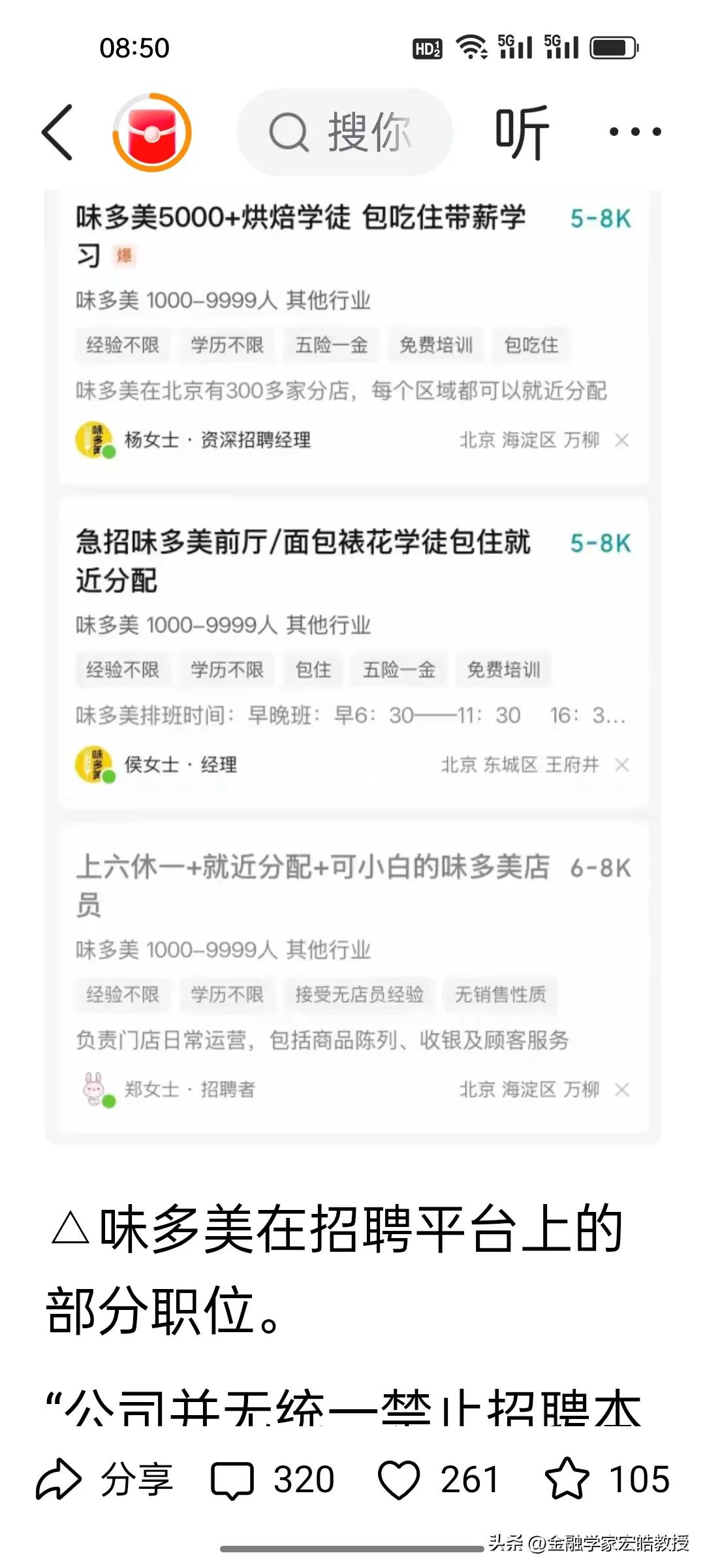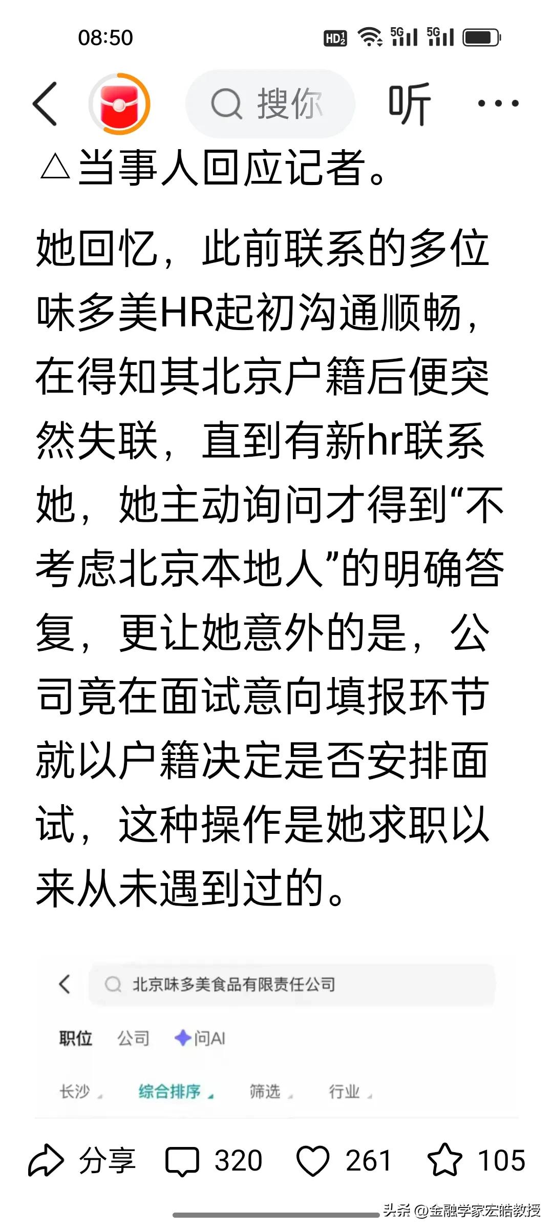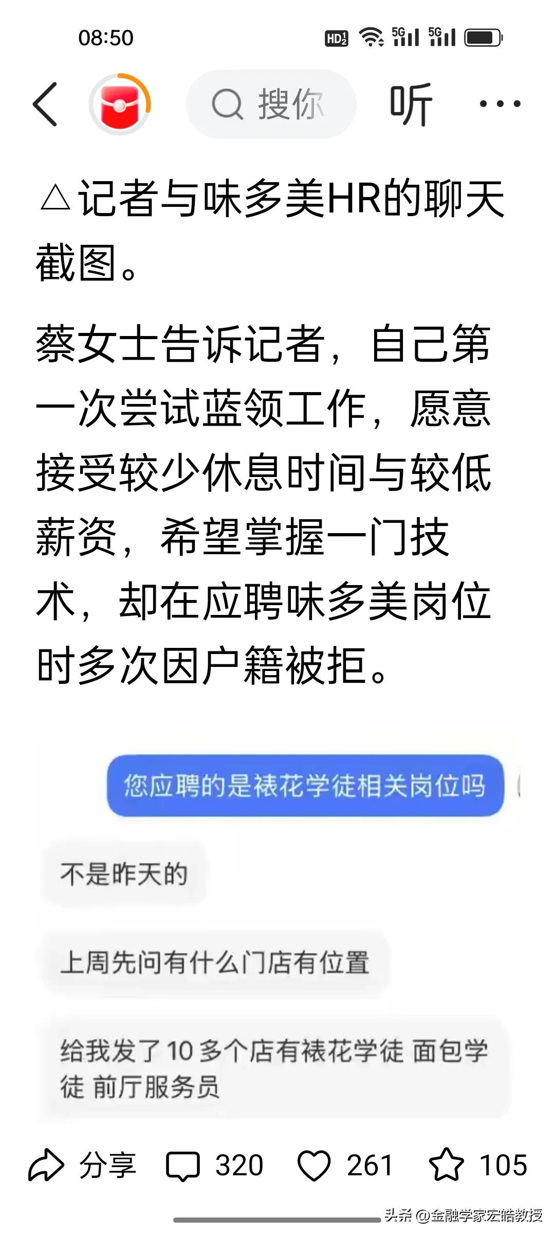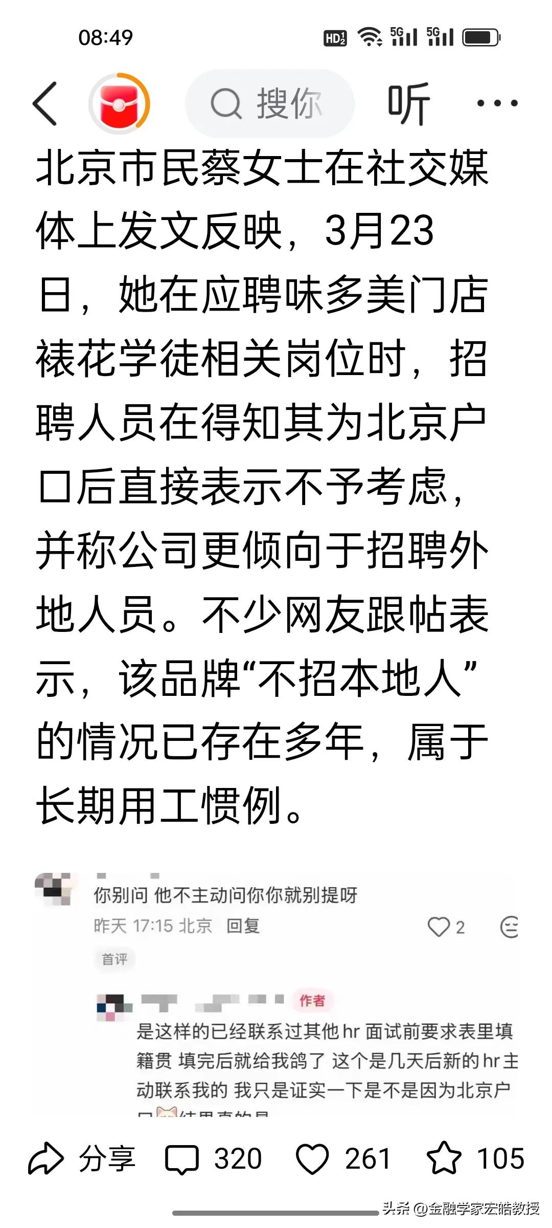 户籍歧视寒心!深耕北京30年的本土烘焙品牌味多美拒招北京人,成本优先还是规则失守? 味多美被曝拒招北京户籍求职者,HR直言“公司规定”,潇湘晨报记者暗访与网友爆料均证实这一隐性门槛,这也太让人意外了。 作为北京本土品牌,此举让消费者与求职者心寒。企业以“稳定性”为由偏好外地员工,实则是算清了社保、住宿与管理成本账——外地员工更能接受倒班、按最低基数参保,用工成本更低。 2024年味多美员工1166人,参保人数一致,却用户籍筛选员工,违背公平就业原则。这种“成本优先”的用工逻辑,暴露了企业社会责任的缺失,也让本土品牌口碑大打折扣。