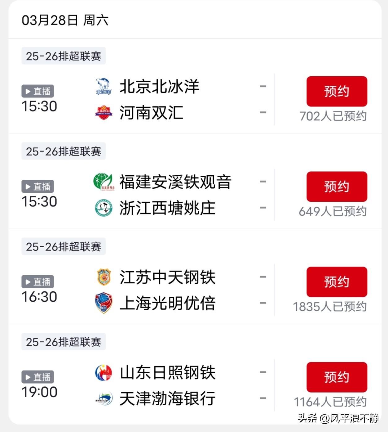 女排冠亚军决赛!CCTV-5直播预告! 本周六(3月28日),四场女排赛事全部上演,将决出3-8名,还有冠亚军决赛第一回合,具体赛程如下∶ 冠亚军决赛第一回合∶ 江苏——上海(CCTV-5直播) 铜牌战∶ 山东——天津(央视频APP直播) 第五名之争∶ 北京——河南(央视频APP直播) 第七名之争∶ 福建——浙江(央视频APP)