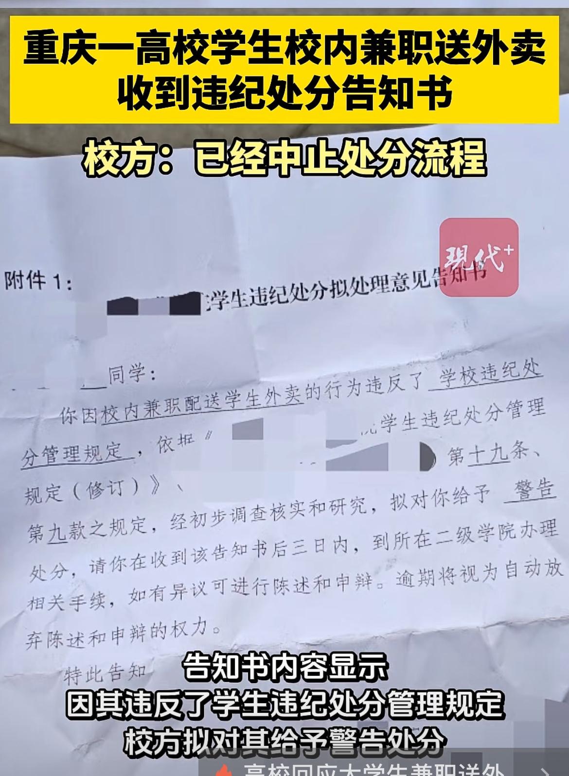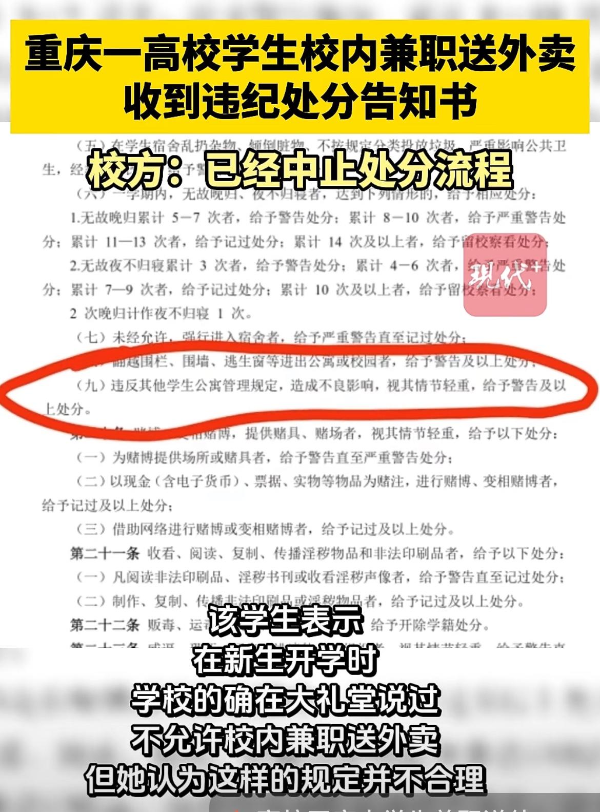 重庆一大学生校内兼职送外卖,被学校处罚,太荒唐了吧。大学生林某就读于重庆一职业学校,因为家境比较贫寒。从今年 1 月份开始在学校送外卖,第一次被学校发现,写了保证书,他不以为意,后面继续送,再一次被学校发现,学校决定给予校纪处分。 这名学生非常不解,家境贫寒,想通过勤工俭学解决生活费,这有什么错?自己就读的学校是职业学校,更早的接触社会,从事生产实践活动不就是在为未来的职业方向进行接轨吗?难道真要把学生关起门来学习,两耳不闻窗外事,毕竟职业学校不是培养高精尖人才的,在不影响正常学习的情况下面,学校应该是多鼓励,学生进行社会实践才是正常的教育。这名学生不服学校处罚,据理力争。发现校规也没有明确要求学生不允许送外卖。后面学校结合学生的实际,取消了这次处罚。