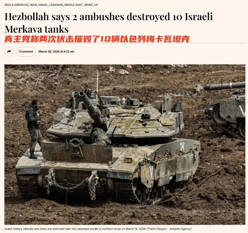 诱敌深入+围点打援 真主党宣称在边境地区摧毁了多达20辆以军重型装甲车辆,这其中