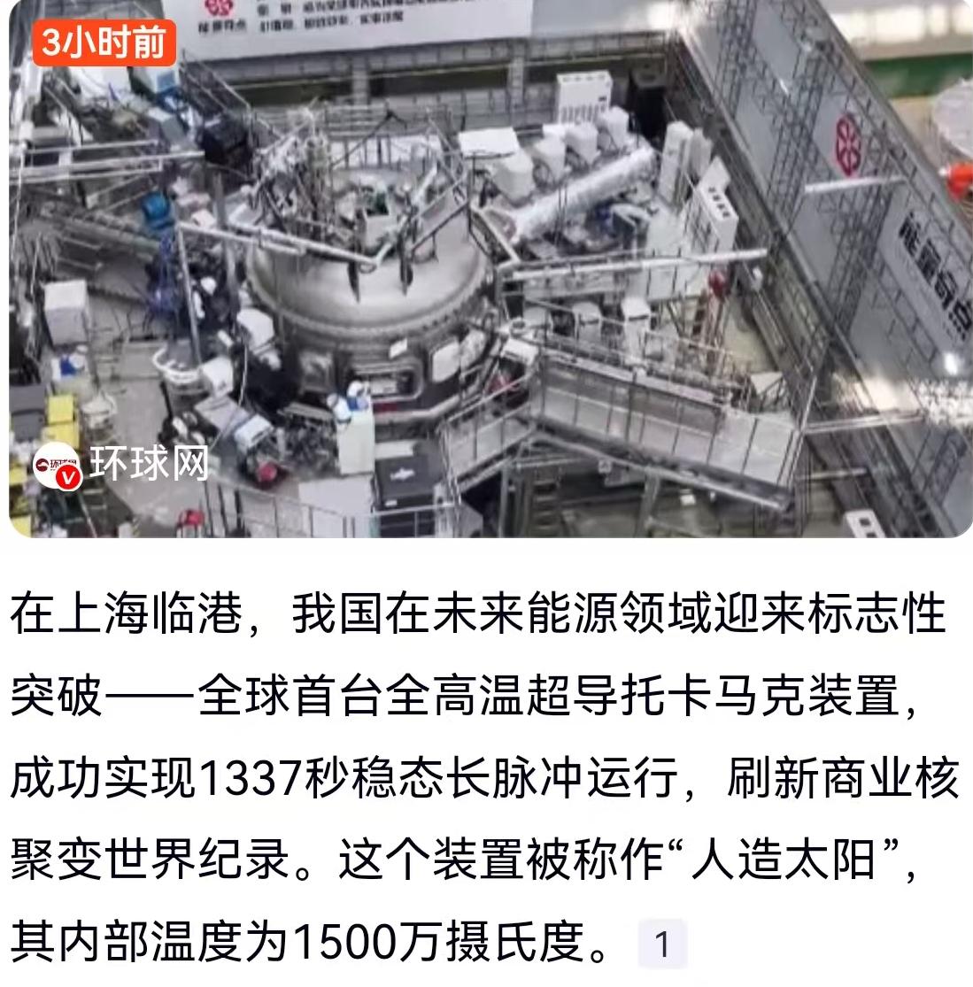 上海临港传来的这一声“惊雷”,可能比我们想象的还要响亮。就在这片充满了未来感的土地上,全球首台全高温超导托卡马克装置,也就是大家俗称的“人造太阳”,成功实现了1337秒的稳态长脉冲运行。这不是一个简单的数字跳动,而是一项商业核聚变领域的世界纪录刷新。要知道,这个装置内部的温度高达1500万摄氏度,真正的“热火朝天”,却在一个可控的容器里安稳运行,这本身就是一种极致的科技浪漫。 很多人听到“人造太阳”四个字,第一反应往往是科幻电影里的场景,觉得离自己特别遥远。但看看网友们热议的话题,其实大家心里都有一本明白账。有青海的网友畅想未来:“电费越来越便宜,到忽略不计;能源无限,有了足够动力,普通人也能去月球、火星;环境变好,天更蓝水更清。”这话听着像做梦,但逻辑上还真没毛病。核聚变一旦实现商业化应用,能源短缺这个问题可能真的会成为历史书上的名词。不过,也有上海本地的网友很幽默,发出了灵魂拷问:“还是烧开水的形式发电么?”这倒是一针见血,指出了能源转化的本质——无论源头多高大上,目前看来,推动发电机转子的动力,确实还得靠传统的物理方式,但这并不妨碍源头技术的革命性突破。 这次的主角,有个颇具神话色彩的名字——“洪荒70”。这台装置直径约3.6米,个头不算巨大,但含金量极高,国产化率超过了96%。这是一台实实在在的“中国造”。它的研发背后,是企业与科研机构的强强联手。由能量奇点能源科技(上海)有限公司设计研发,中国核工业第五建设有限公司承建施工。翻开它的履历,简直就是按下快进键的“中国速度”:能量奇点成立于2021年;仅仅一年后的2022年3月,设计工作就紧锣密鼓地展开,并与核工业西南物理研究院签署了合作协议;到了2023年8月,装置启动总体安装;紧接着在2024年1月完成关键部件套装,2月中心螺线管就位,3月建成;到了2024年6月18日,更是成功实现了等离子体放电。这种从图纸到实物的跨越,仅仅用了几年时间,效率惊人。 此次1337秒的稳态运行,更是具有里程碑意义。在此之前,比如在2026年1月6日的实验中,“洪荒70”在第5319次实验里实现了120秒的稳态长脉冲等离子体运行,那已经是全球首次由商业公司达到的高度。而如今,这个时间被拉长到了1337秒,这不仅仅是时长的增加,更是“稳态”能力的质变。这台装置由26个高温超导磁体构成,包含12个环向场磁体、6个极向场磁体和8个中心螺线管磁体。磁体系统全部采用高温超导材料建造,这就像给狂暴的核聚变反应穿上了一层“超导铠甲”,能让等离子体在真空室里乖乖听话,不再乱跑。 这种技术突破的价值在哪里?不仅仅是为了刷数据。目前我们用的化石能源,总有烧完的一天,而且环境代价不小。而核聚变需要的燃料——氘和氚,海里多得是,几乎取之不尽,而且产物没有核废料的放射性污染。有网友调侃说“太阳拔根毛砸在地球上我们人类都承受不了”,确实,太阳核心的能量那是毁灭级的,但“洪荒70”这样的托卡马克装置,就是为了把这种“毁灭级”的能量关进笼子,驯化成能点亮万家灯火的“驯服级”能源。 虽然离真正的商业发电还有一段路要走,但每一次秒数的突破,都是向着无限能源的彼岸靠近。当商业力量介入核聚变研发,意味着这项技术开始从纯粹的科研探索走向市场化的可能。也许在不远的将来,我们真的能见证那个电费便宜到“忽略不计”的时代,而这一切,正在上海临港的那个“圆环”里,一步步变成现实。 以上内容仅供参考和借鉴