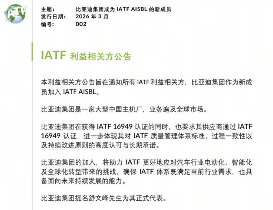 比亚迪作为全球首个且唯一的新能源车企,正式加入IATF国际汽车工作组,树立全球产业发展标杆,直接打破欧美车企主导的国际汽车标准壁垒,和大众、通用、宝马等巨头并肩,共同制定全球汽车核心标准!要知道IATF是全球汽车质量管理的权威组织,能加入全靠硬实力,这不仅是比亚迪的荣耀,更标志着中国车企从“遵守规则”正式迈入“制定规则”的新时代。