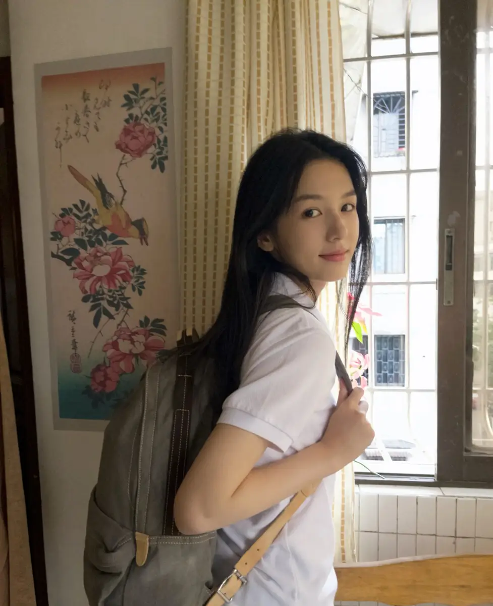 周也校服搭帆布包甜笑回眸 气质清纯宛如白月光学姐