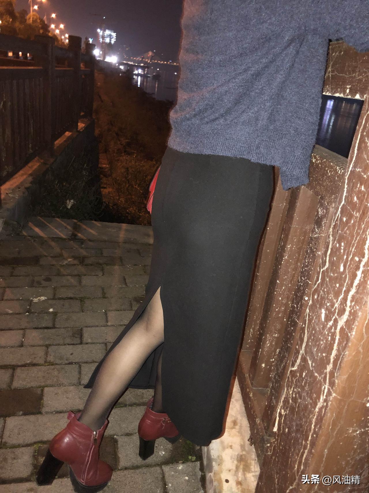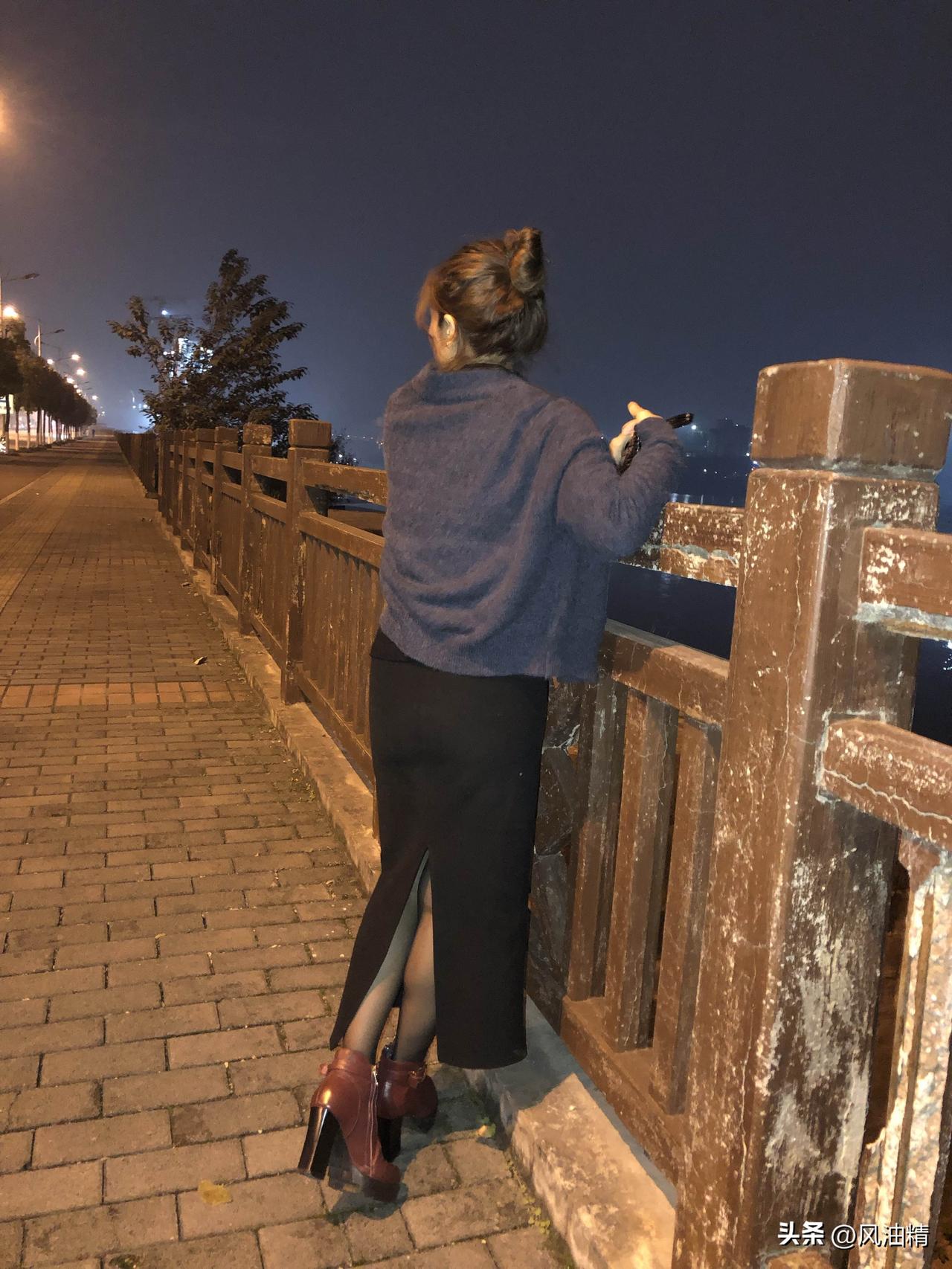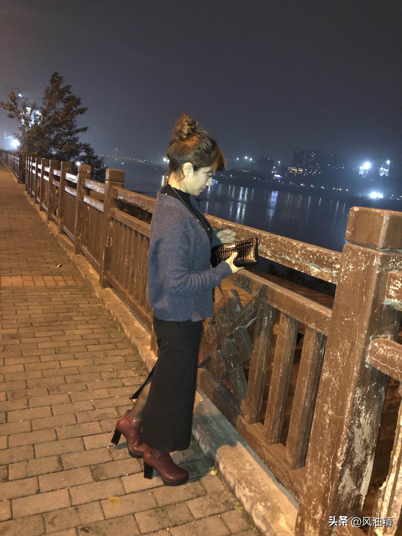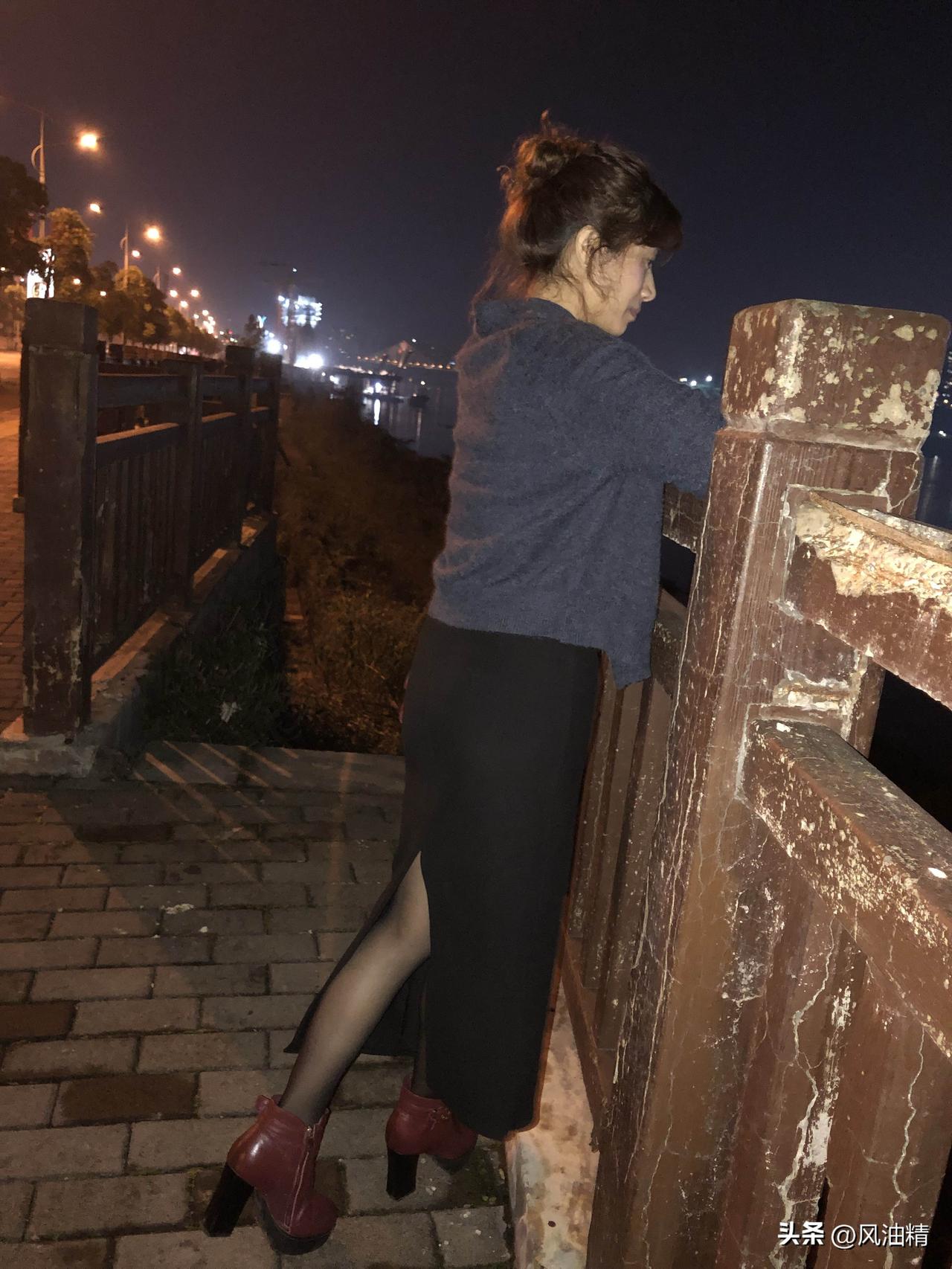 夜色温柔,江风轻拂。她倚着斑驳木栏,丸子头蓬松慵懒,灰调针织衫衬得身姿温婉,开叉黑裙与酒红短靴在路灯下晕出细碎光泽。低头摆弄手包时,城市灯火在江面铺成碎钻,连晚风都裹着几分静谧的浪漫,是独属于夜晚的松弛与温柔。