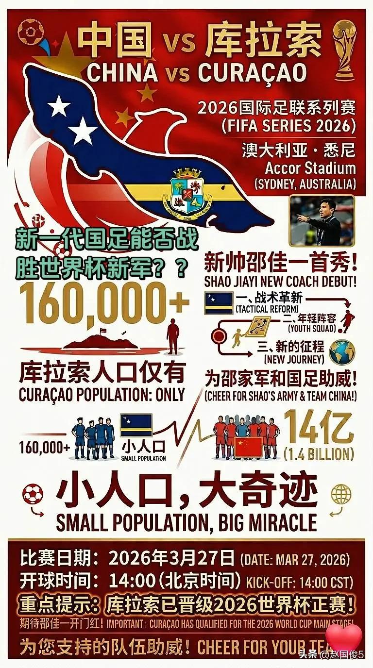 邵佳一将拉开中国队VS库拉索的神秘面纱! 北京国安14:00点,一场中国男足VS库拉索的热身赛,将吸引全国众多的球迷。 一场热身赛,之所以会吸引广大球迷的关注,首先在于这是主教练邵佳一带国足的首秀。他会使用哪些球员;会采取什么技战术打法;会激发球员怎样一种斗志;能不能让球迷看到有复苏向上发展的迹象,才是重点关注的内容所在。 其次,球迷们还是带着疑惑的目光,想看看人口不到16万、土地面积只有444平方公里的库拉索足球,到底是怎样一种水平。 其中,也特别想看看未被足协归化的华裔球员陈达毅,他到底处于怎样一个水平级别。 此场比赛是邵佳一执教国足的首场比赛,也有不少球员是首进成年国家队,踢好今年首场比赛的欲望和心情是毋庸置疑的。 当然,我也相信邵佳一及教练团队,会给衰败、迷茫中的中国男足,带来一丝希望的烛光和脱胎换骨般的重生。 根据此次入选国足的球员名单,我心目中的首发阵容是这样的。 守门员:颜骏凌 三中卫:吾米提江、朱辰杰、刘浩帆 边后卫:杨希、胡荷韬 中场:韦世豪、王上源、徐彬 前锋:王钰栋、张玉宁 至于这场比赛的胜负结果,我认为打平的可能最大。当然不排除国足这首场比赛,球员和斗志旺盛敢于拼搏,一球小胜也是可能的。 比分预测:中国队1:1或2:1库拉索 以上分析,纯属个人观点。 欢迎大家点评讨论! 库拉索男足在世界杯上能走多远