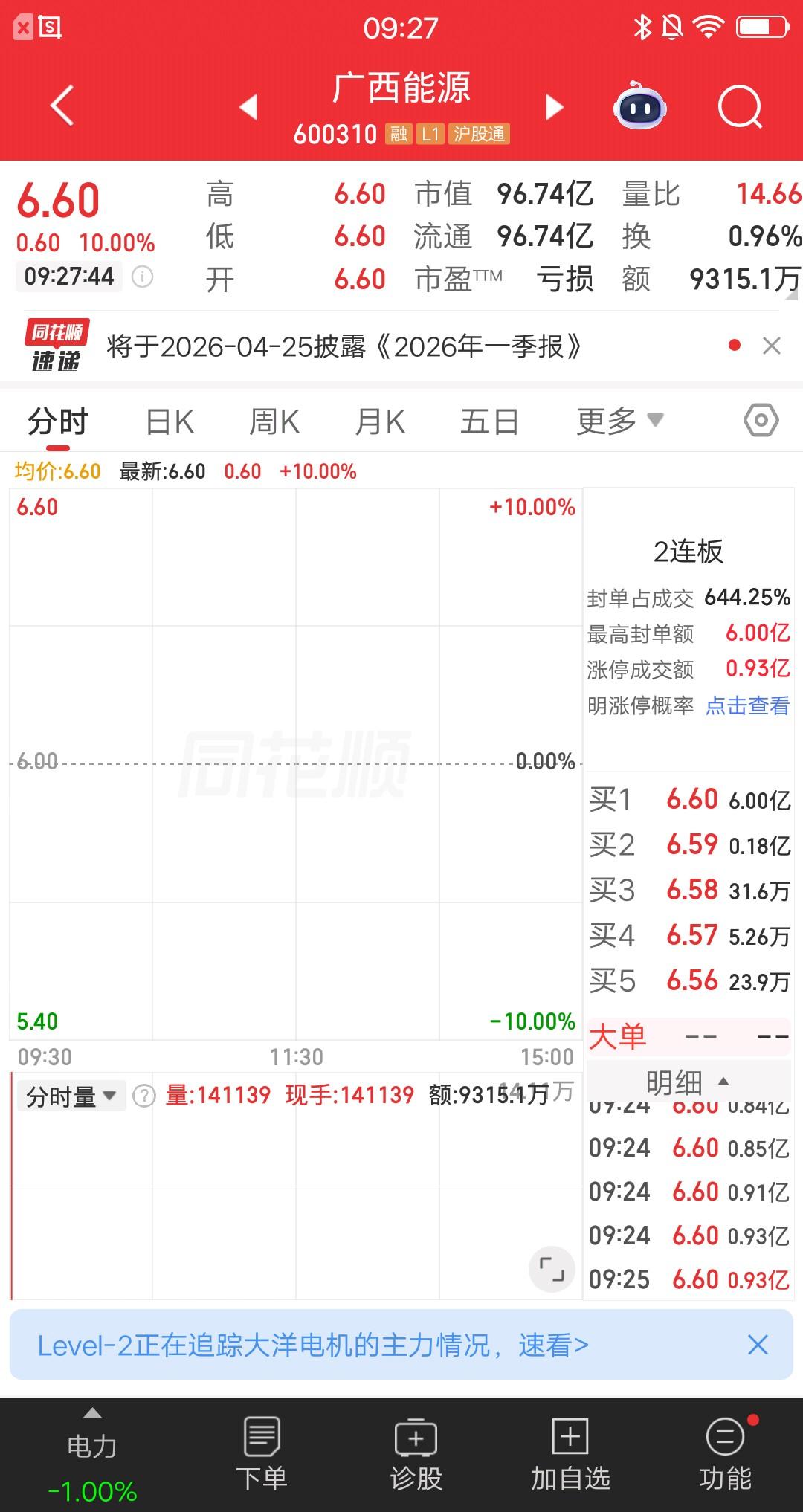 A股今天竞价一字涨停的三只票,两个电力股一个文化传媒股。短线模式里有句话叫竞价定方向,是有一定道理的。比如近期,竞价一字板的票电力能源股居多,而且都是低位股。原因就在于,龙头出现后,资金开始挖掘低位的机会,因为有些人是不敢参与龙头的。当低位票异动的时候,看好的散户直接顶一字。 惠天热电,竞价一字涨停,成交额3490.1万,封板资金1.62亿。异动解读“风电+供热+绿电概念”。 广西能源,竞价一字涨停,成交额9315.1万,封板资金6亿。异动解读“电力+绿色电力+广西国资”。 贵广网络,竞价一字涨停,成交额3935.5万,封板资金7.48亿。异动解读“算力租赁+广电5G+贵州国资”。 最近电力能源题材出尽了风头,天天霸榜热股榜,很多散户按耐不住了。提醒大家,要根据自己的模式,切勿盲目跟风。